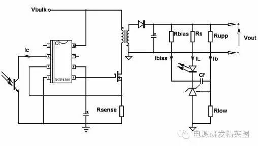 众所周知,TL431在开关电源(SMPS)反馈环路中是参考电压。该器件结合了参考电压与集电极开路误差放大器,具有操作简单和成本低廉等优点。虽然TL431已在业内被长期广泛采用,但一些设计人员仍会忽略它的偏置电流,以致在无意间降低产品的最终性能。 图1 TL431等效电路图 图2 SMPS简化直流模型(不考虑输入波动) 图3 使用传统的分流稳压器配置连接TL431 图4 TL431偏置电流过低时性能将明显下降TL431的简化电路图如图1所示,图中包括了驱动NPN 晶体管的参考电压和误差放大器,在该封闭的电源系统中,一部分输出电压一直与TL431的Vref(参考电压)进行比较。转换器简化直流模型如图2所示,Vout与Vref通过受传输率?影响的电阻分压器进行比较,可得到输出电压的理论值为Vref/α。然而,整个增益链路和各种阻抗均会影响输出电压,如下式所示,其中每个希腊字母均表示一个增益,RSOL表示开环输出阻抗。Vout=(Vref-α×Vout) ×β×G- RSOL×Vout / RL (1)Vout= Vref×β×G/(1+α×β×G+ RSOL / RL) (2)静态误差=Vref/α- Vout= Vref×(RSOL+ RL)/ [α×(RSOL+α×β×G×RL+RL)] (3)从式(3)中可看出,增大增益的值有助减小静态误差,提高输出电压精度。受增益环路影响的另一个重要参数是输出阻抗,系统的输出阻抗可用不同的计算方法得出。任何发生器均可简化为它的Thevenin等效,即一个电压电源Vth(空载时测得的Vout,即令式2中的RSOL / RL =0)与一个输出阻抗Rth的串联电路。设当负载电阻RL为闭环输出阻抗Rth时,输出电压Vout可减小至Vth/2,以此来计算输出阻抗Rth,也可将其表示为RSCL。令Vth/2 = Vout求RSCL,由式(2)可得:Vref×β×G/(1+α×β×G)/2=Vref×β×G/(1+α×β×G+ RSOL/Rth) (4) RSCL = RSOL/(1+α×β×G) (5)由式(5)可得出如下结论:1.如果直流误差放大器的增益较大,且DC较高,则RsCL接近于零;2.由于对反馈返回路径?进行了补偿,所以,当增益随频率增大而减小时,RSCL开始增大。阻抗模块随频率增大而增大,说明该阻抗类似于电感;3.当增益?降至零时,系统输出阻抗与无反馈时的阻抗相同,均为RSOL。此时,系统开环工作。因此,为了减小静态误差?,并降低转换器的动态输出阻抗,大多数SMPS 设计人员会在设计中保持较大的直流增益值。这里的直流增益由TL431提供,可以采用如图3所示的纯积分器配置进行连接。假设图3中的Rbias不存在。首先计算分压器网络Rupp和Rlow,桥接电流Ib应大于TL431参考引脚的偏置电流6.5?A(最大值),以减小因偏置而引起的Rupp误差。对于12V输出电压,假设 Ib=1mA。由于TL431通过Rlow施加的电压为2.5V,而Rupp施加的电流为1mA,因此可以计算出Rlow为 2.5 / 1m = 2.5k?,而Rupp则等于(12-2.5)/ 1m=9.5k?。可进一步选择更小的偏置电流,以减小空载条件下的待机能耗。桥接电流值确定后,即可计算RS。RS必须能提供足够的电流,使光耦合器集电极(或反馈引脚)小于1.2V,以启动空载工作状态下的跳周期。在NCP1200中,引脚2和内部5V参考电压间有一个8k?的上拉电阻。如果反馈电流为475?A,可将引脚2拉至1.2V (Vpin2=5-475?×8k)。考虑到光耦合器在较差情况下有50%的电流转换比例(CTR),则RS必须小于(Vout-2.5-1V) / 950?在CTR为150%的较差情况下,表示LED中需要的电流较小,如果将8.2k?电阻与TL431串联,则会发生以下情况:1. 轻负载情况:IFB= 475?A,则IL = 475?/ 1.5 = 316?A 2. 中负载情况:VFB= 2.3V,IFB= 337.5?A,则 IL= 337.5?/ 1.5=225?A3. 重负载情况:VFB= 3V,IFB= 250?A,则IL= 250?/1.5 = 166?A在这种情况下,TL431的偏置电流不仅随着负载电流而变化,而且也随着光耦合器CTR的变化而变化。此外,减小RS也不起任何作用,应该通过调节LED的内部电流,来调整控制器端的正确反馈电压。这种情况的设计问题源自TL431的数据表:必须插入大于1mA的偏置电流,才能从不同规格的TL431增益中获益。如果不能正确偏置TL431,就会降低开环增益?,导致增大,RSCL也随之增大。这一问题可通过增加偏置电阻Rbias,在外部施加一个偏置电流而解决。由于最缺少电流,所以必须计算此电阻在较差情况下,也就是重负载情况和最高CTR时的值。这时IL= 166?A。因此,RS上的电压为166?×8.2k = 1.36V。假设LED的正激压降为1V,则阴极电压为12 -1.36-1 = 9.64V。已知Vout恒定为12V,通过Rbias施加1mA电流得到,Rbias= (12-9.64) / 1m = 2.36k?,或用 2.2k?得到归一化值。因此,在 TL431上施加的最小电流为 1mA + 166?A = 1.16mA。在空载情况下,IL=316?A ,阴极电压为12-(8.2k×316?)-1 = 8.4V,因此,流经TL431的总偏置电流为(12-8.4)/2.2k= 1.63mA,加上实际的反馈电流值316?A,总偏置电流为1.95mA,应处于安全电流范围内。在NCP1200构成的电源上进行了有偏置电阻和无偏置电阻的实验,结果如图4所示。没有偏置元件时,输出阻抗测量值为57m?;连接偏置电阻(阻值为3.3k?)后,输出阻抗值降至4m?。总之,通过外部电阻对TL431进行正确偏置是非常重要的。如果无法承受额外的1mA输出电流的预算(由于要尽量降低空载待机能耗),就应使用TLV431 (Vref= 1.24V) 或NCP100 (Vref= 0.7V),因为它们只需要100?A的最小偏置电流,且击穿电压更小。此外,8.2k?的串联电阻RS极为罕见,因为该电阻结合光耦合器的集电极上拉电阻可以产生直流增益。如果电阻值约为1k?或稍大于1k?,则更接近标准值。