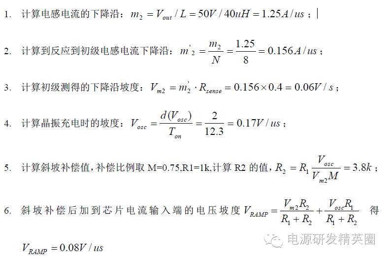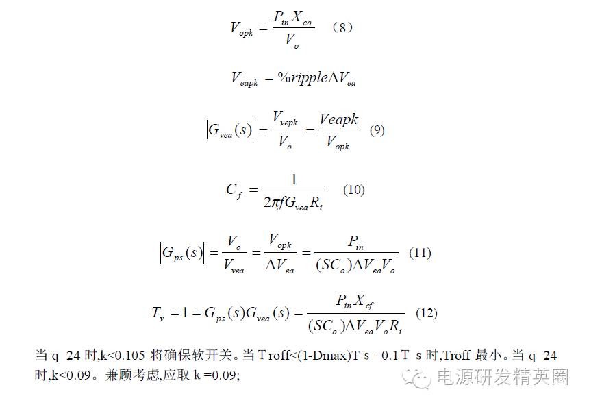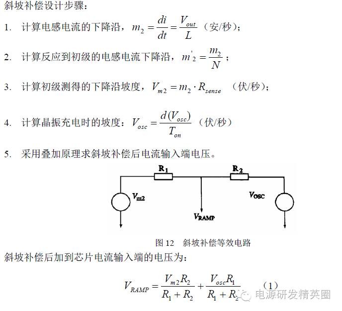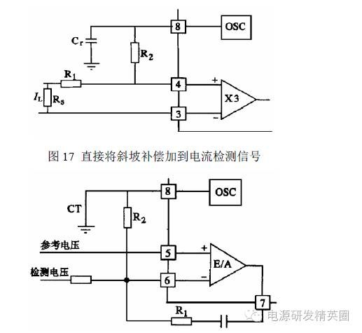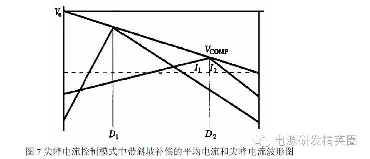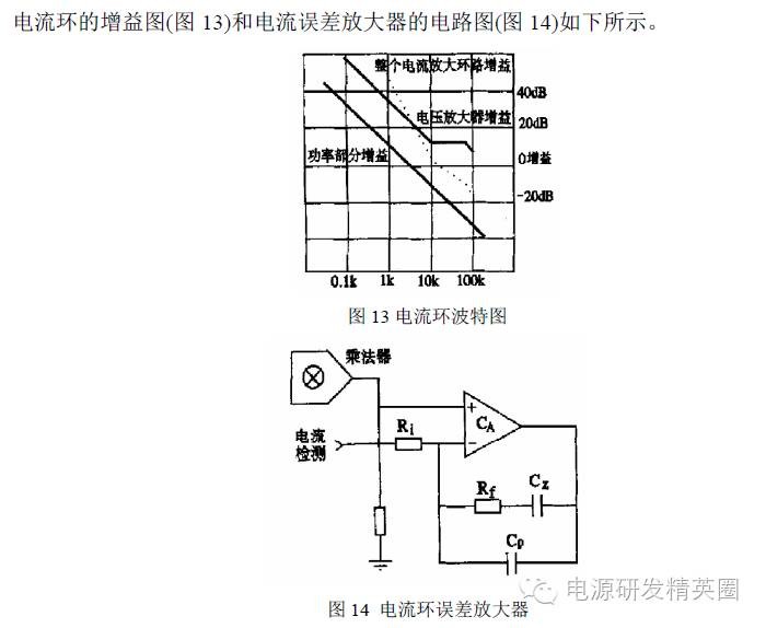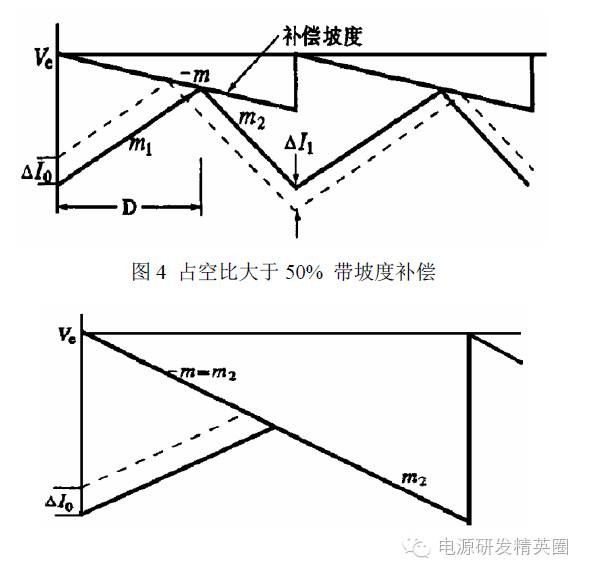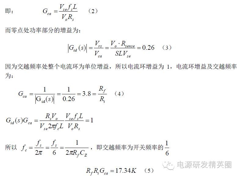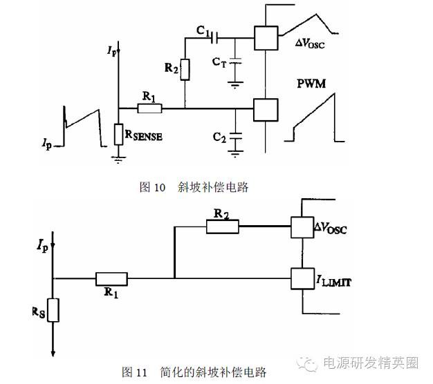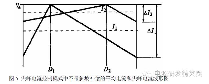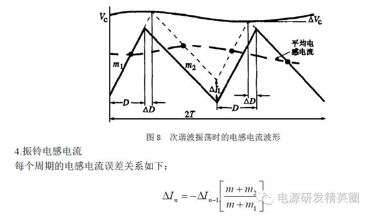 斜坡补偿的引入 鉴于以下原因,峰值电流控制必须考虑采用斜坡补偿。 当电流模式控制变换器的占空比超过50%的时候,变换器会在开关频率的次谐波频率点出现振荡,准确地说是在一半开关频率的地方,除非采取斜坡补偿措施。斜坡补偿的定义:在电流模式控制下,当电流达到一定大小时(由误差放大器输出设定)开关关断。如果占空比超过50%,电感电流的上升时间就大于整个周期的50%,那么电流下降时间就小于一个周期的50%’。在较短的时间内,电流还没有来得及回到静态初始值,下一个周期接着又开始了。下一个周期的初始电流变大了。在接下来的这个周期里,电感电流很快就上升到参考点,使导通时间变短,占空比变得更窄;和上一个周期相比,这个周期的占空比减小到50%以内。但是这样又导致关断时间太长,下一个周期电流的初始值太小,又使得占空比再一次超过50%。如此循环,电流以间隔一个周期过大和过小的方式出现振荡。 1 电路的稳定性 图 2、图3 分别是占空比大于50%和小于50%的尖峰电流控制的电感电流波形图。其中Ve 是电压放大器输出的电流设定值,?Io 是扰动电流,m1、m2 分别是电感电流的上升沿及下降沿斜率。由图可知,当占空比小于50%时扰动电流引起的电流误差?I1 变小了,而占空比大于50%时扰动电流引起的电流误差? I1 变大了。所以尖峰电流模式控制在占空比大于50%时,经过一个周期会将扰动信号扩大,从而造成工作不稳定,这时需给PWM比较器加坡度补偿以稳定电路,如图4 所示。加了坡度补偿,即使占空比小于50%,电路性能也能得到改善。 ![]() ![]() 图5 m=m2 时,电感电流波形对于 BUCK 电路,补偿坡度是V0/L,由于输入电压恒定,所以补偿值便于计算并恒定;对于Boost 电路,补偿坡度是(Vin-Vo)/L,由于输入电压随电网变化,所以补偿值不恒定,这样对于固定补偿网络,很多时候会发生过补偿或欠补偿,降低了电路的性能并导致波形畸变,因此,Boost 电路通常不采用峰值电流控制而是采用平均电流控制的模式,来避免斜坡补偿。 2.减小尖峰值/平均值误差 电流模式控制的实质是使平均电感电流跟随误差电压 Ve 设定的值,即可用一个恒流源来代替电感,使整个系统由二阶降为一阶。但如图6 所示,尖峰电流控制模式中随着占空比D1、D2 的不同,电感电流的平均值I1、I2 亦不同。如图7 示,可以通过斜坡补偿来获得不同占空比下一致的电感电流。 ![]() 另外图7 所示的电感电流平均值和峰值间也存在差值,在BUCK电路中由于电感电流的纹波相对电感电流的平均值很小,并且存在电压外环的校正作用,所以峰值和平均值的这种误差可以忽略;在BOOST电路中,峰值要跟随输入电网的正弦波,所以和平均值间的误差很大。这种误差最大,需要一个大电感来使电感电流的纹波变小,减小抗干扰能力。这也是在BOOST中采用平均值电流模式的原因。 ![]() 3.抑制次谐波振荡 内部电流环的增益尖峰是电流模式控制的一个重要问题。这种增益尖峰发生在二分之一开关频率处,使相移超出范围,导致不稳定,并使电压环进入次谐波振荡。这时在连续固定的驱动脉冲下,输出占空比却在变化,如图8 所示。采用斜坡被偿也能很好地抑制次谐波振荡。 ![]() 由此可以绘出每个周期等效电感电流的瞬时值、电感电流误差和周期T的关系曲线如图9 所示。由图9 可以看出,电感电流是一个按二分之一开关频率衰减的正弦波,类似于一个RLC响应电路。这种电流有两个不利之处: ① 电感电流对电源或负载的瞬态变化产生振铃响应; ② 在开关频率附近控制环路增益达到最高,从而产生不稳定趋向。 通过斜坡补偿可以抑制这种振铃电感电流,例如当补偿坡度为电感电流下降沿的斜率时(即m=-m2),振铃电流在一个周期内就完全得到了抑制。 ![]() 斜坡补偿设计步骤: 图 10 示出斜坡补偿电路。R1 和R2 组成了从晶振的输出到限流引脚(脚1)的分压网络,迭加斜坡补偿信号到初级的电流波形,R1、R2 值的比例决定了所加的斜坡补偿量。电容C1是交流耦合电容,使晶振的交流分量耦合到R2,去掉了直流偏置部分。C2 和R1 组成滤波电路,滤去初级Ip中的前沿尖峰,避免误动作。? VOSC是晶振锯齿波的峰峰值。将电容去掉得到图11 简化电路。 ![]() 6.计算斜坡补偿值:斜坡补偿电压COMP V 为: ![]() 式中 M 补偿比率,应大于0.5,一般取0.75-1。 四、电流控制技术及斜坡补偿的应用 1. 平均电流法Boost电路设计实例 设计 1200W功率因数校正电路,采用Boost电路的拓扑,平均电流法的控制电路,UC3854BN的控制芯片。 电路参数如下: 输入电压:Vin=220V±25%(165V~275V); 直流输出电压:Vo=410V; 开关频率:fs=80kHz; 功率因数:PF>0.993; 效率:?>0.95; 电感:L=600μH; 检测变压器变比:1∶100; 检测电阻:15O。 ①电流环设计为了稳定运行,须进行电流环相位补偿。 电流环补偿后在开关频率附近提供平稳增益。在低频的零点响应提供高增益完成平均电流控制工作。在开关频率附近误差放大器的增益要配合电感电流的下降沿。本设计开关频率为80KHz,单位增益交越频率应为14KHz(1/6 开关频率),但本电流环的主要工作是跟踪线电流,故10KHz 的带宽是合适的值。电流环的零点必须设置在交越频率上,或低于交越频率处。如设置在交越频率上,相位裕度有45°,低于交越频率则相位裕度更大点。45°的相位裕度的系统工作稳定、低过冲、干扰小,所以将零点设置在略低于交越频率处(fs 为10KHz)。当极点高于开关频