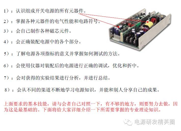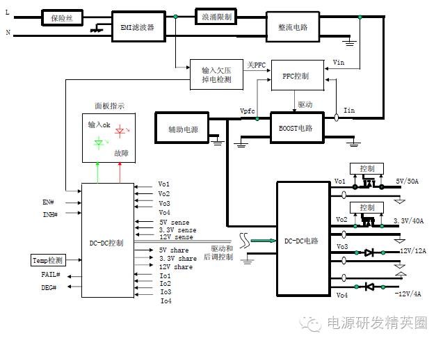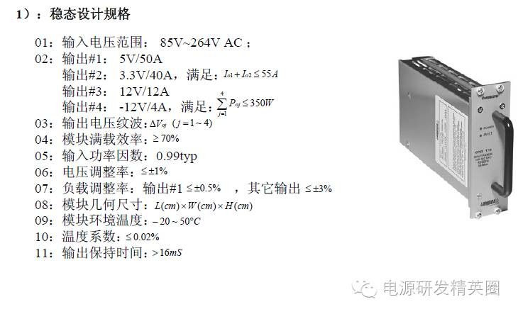 内容目录 1:开发一个开关电源产品所需要的技能和专业理论知识 2:开发一个开关电源产品所需要进行的各种优化和折中 3:保证开关电源产品一次开发成功所需具备的工程素质 一:开发一个开关电源产品所需要的技能和专业理论知识1:开关电源概况 1)电源是什么?---因电子技术、自动化技术、IC技术等等的迅速发展,导致了多种多样的电子设备;如:计算机、电视机、通信设备、工业控制设备、手机数码相机、DVD、服务器、路由器、电机驱动、医疗仪器、。。;---电子设备内部的各种IC、电子电路、执行装置所需的电源,多为直流电和交流电; ---从电网所得的交流电或由电池所得的直流电是随环境、时间和负载所变化的,它们不能直接成为电子设备所需的内部电源;---电子设备由于要完成许多高级的功能、对其供电电源的精度、随环境的变化、动态响应能力、还有很多其它的指标都有非常高的要求 将电网或电池的一次电能,转换为符合电子设备要求的二次电能,这样的变换设备便是电源。电源是一切电子设备的心脏,没有电源,电子设备就不可能工作。 2)开关电源是具有最高功率密度的电源,按变换方式可分为下列四大类: (1):第一大类:AC/DC开关电源; (2):第二大类:DC/DC开关电源; (3):第三大类:DC/AC开关电源; (4):第四大类:AC/AC开关电源。 但目前只将前两类称为开关电源,而将后两类分别称为逆变器和变频器。 3)实际的开关电源在应用时可分成外置式和内置式两种: (1):外置电源---与设备分开放置的电源模块或电源系统;如: --通信用一次电源模块和系统; --电力操作电源模块和系统; --手机电池的充电器; --笔记本电脑的Adapter ; --各类手提设备、便携设备的电池充电器,等等。 (2):内置电源---放在设备内部的电源模块或电源系统;如: --计算机内部的Silver Box和VRM; --家电(如普通电视机、PDP电视机、液晶电视机)内部的供电电源; --工业控制设备内部的电源; --仪器中用的电源; --通信设备内部的电源模块和系统; --复印机、传真机、打印机等的内部电源,等等。 (3):板上电源---放在设备内单板上的电源模块;如: --标准砖类电源(全砖、半砖、1/4砖、1/8砖); --非隔离POL(Point of Load)变换器;--VRM和VRD; --小功率SMD电源; --SIP和DIP电源,等等。 下面我们来看一些电源产品的图片。(这些图片摘自相关电源公司网站) A:一次电源产品的图片(AC/DC) B:工业电源产品的图片标准产品(AC/DC) C:工业电源产品的图片(AC/DC) D:工业电源产品的图片(AC/DC) E:工业电源产品的图片(AC/DC) F:二次电源产品的图片(DC/DC)--标准转类 G:二次电源产品的图片(DC/DC)![]() 2:开发一个开关电源产品所需要的基本技能 ![]() 3:开发一个开关电源产品所需要的专业理论知识 从下面一个开关电源产品例子着手,来看看开发人员需要掌握的专业理论知识有哪些?这个例子是一个标准的多输出电源,其规格和要求等先简单地概括如下: 2):设计必须实现的功能01:全范围内的正常开关机; 02:全范围内的输出稳压且满足各项电性能指标; 03:实现规格书要求的自动保护; 04:输出#1~输出#3的输出并联均流; 05:输出#1和输出#2的远端补偿; 06:实现规格书的安全要求; 07:实现规格书的EMI要求; 08:实现规格书的热插拔要求; 09:实现规格书的MTBF要求; 10:实现规格书的成本要求; 11:实现规格书的通断逻辑功能要求。 3)上述电源案例的功能结构总框图 上述案例电源中DC-DC控制部分的功能结构框图 其中蓝色方框用来实现基本稳压功能的;绿色方框用来实现并联和热插拔等高级功能的;红色方框用来实现各种保护功能。4):从上述案例电源的功能结构总框图可知,一个开关电源产品需要的电路为: (1):功率电路: ---输入保险丝; ---EMI滤波器; ---浪涌限制器(通常为热敏电阻和电子开关并联); ---整流电路; ---PFC主电路(多为Boost电路); ---DC-DC主电路(可有很多种选择); ---辅助电源主电路(多用Flyback电路); ---输出隔离器件(OringDiode或OringMOSFET); (2):控制电路: ---PFC控制电路; 用来产生输入正弦电流和输出近似稳压的控制电路(有多种控制实现); ---DC-DC控制电路; a):用来稳定各路输出电压; b):用来保护各路输出过载和短路; c):用来实现主要几路的输出均流和远端补偿; d):用来限制总输出功率要求和两路输出电流之和要求; e):用来实现热插拔功能所需的控制遥控开关机控制; f):用来实现输出OringMOSFET的控制*; g):用来保护主要几路输出的过压; h):用来实现电源的过温保护; i):用来分别指示工作ok和故障; j):用来产生两路低压大电流输出的同步整流控制*; k):用来弥补线路电压降的远端补偿技术; l):用来实现非主路输出稳压的后调稳压控制; ---辅助电源控制电路; ---输入欠压掉电检测电路;输入欠压时,产生保护信号关闭PFC;输入掉电时,产生掉电告警信号; ---输入浪涌控制电路;产生控制信号去控制浪涌控制器中的电子开关闭合,等等。 5):开发一个开关电源产品所需要的专业理论知识: (01):有源PFC的拓扑,分析,控制与设计。 (02):DC-DC功率变换器的拓扑与稳态分析。 (03):开关电源的功率级参数设计 (04):开关电源的控制与动态分析。 (05):开关电源的小信号分析与设计。 (06):开关电源的大信号分析与设计。 (07):开关电源的EMI分析与设计。 (08):开关电源的热分析与设计。 (09):开关电源的容差分析与设计。 (10):开关电源的各种保护技术。 (11):开关电源的同步整流技术。 (12):开关电源的模块均流控