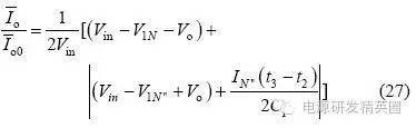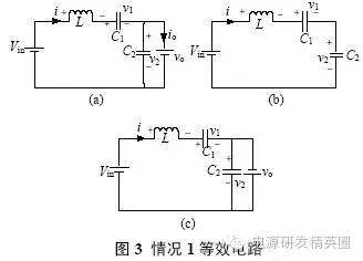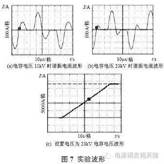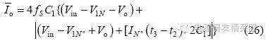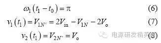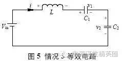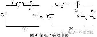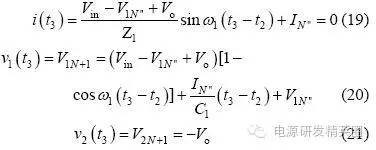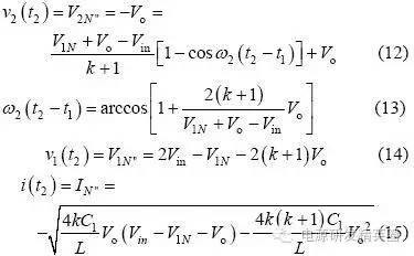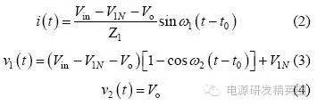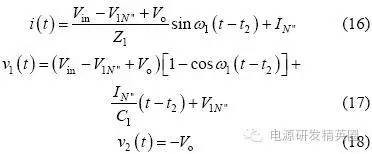 情况1:充电电流在正负谐振周期内均存在,则有如下3 种工作模式。 模式1: Q1、Q3 导通,v2(t0)=Vo,整流二极管D5、D7 导通,谐振电流i >0,充电电流io=i,此模式等效电路如图3(a)所示,电压、电流方程为 当串联谐振电流为0(即t1 时刻)时,该模式结束,可得到如下表达式: ![]() 模式2:当i(t1)=0 时,谐振电流开始反向i1、D3 续流,所有整流二极管处于截止状态,充电电流io=0,其等效电路如图3(b)所示,电压、电流方程为 当v2(t2)= -Vo 时,该模式结束,可得到如下表达式 模式3:从v2(t2)= -Vo 起,谐振电流i1、D3 仍处于续流导通状态,此阶段v2(t2)= -Vo,整流二极管D6、D8 导通,充电电流io= -i,其等效电路如图3(c)所示,电流、电压方程为 当i(t3)=0 时,该模式结束,有如下表达式公式 电路工作在该情况的临界条件应满足 由式(22)和(23)可解得 因此,满足情况1 的条件是Vo电路稳态工作时有 平均充电电流为 当输出电容电压为零(即输出短路)时,该谐振电路与串联谐振电路工作在输出短路时完全相同,其谐振电流为大小为 从上面的分析可以看出,V1N 是一个超越方程,解出V1N 是相当困难的,有必要研究其充电规律,找出较为理想的设计方法。 由式(2)"(25)可以看出,V1N+1 只与谐振电容的比值有关,与谐振电容本身大小和谐振电感大小无关,因而V1N、V1N’、Z1IN’’均为Vin、Vo 和k 的函数。 故由式(24)和(27)可得如下结论: (1)工作在该情况下的条件是Vo(2) 与谐振电容本身大小和谐振电感大小无关,只与谐振电容的比值有关,且 为Vo/Vin 和k 的函数;当k 一定时, 为Vo/Vin 的函数。 情况2:充电电流在正谐振半个周期内存在,在负谐振周期内充电电流为零,则有如下3 种工作模式。 模式1: Q1、Q3 导通,v2(t0)o,整流二极管均截止,谐振电流i>0,充电电流io=0,等效电路如图4(a)所示。 模式2:当v2(t1)=Vo 时,整流二极管D5、D7 导通,io=i,其等效电路如图4(b)所示。 模式3:当谐振电流i(t2)1、D3 导通,整流二极管截止,io=0,等效电路如图4(a)所示。 仿情况1 分析,可得如下结论: (1)工作在该情况下的条件是Vin /(k+1) oin/(k+1); (2) 是k 和Vo/Vin 的函数,与谐振参数本身大小无关。 情况3:充电电流在正负谐振半个周期均为零,则有如下两种工作模式 模式1:Q1、Q3 导通,v1(t0)=V1N,v2(t0)=V2No,其等效工作电路如图5 所示。 模式2:当i(t1)=0 时,进入该模式,半个谐振周期后结束,等效电路如图5 所示。 仿情况1 分析,可得如下结论: 工作在该情况下的条件是Vo>2Vin/(k+1),充电电流为零。 根据上面3 种情况得分析,可得到串并联谐振CCPS 具有如下性质: (1)k 一定时, 随Vo/Vin 的变化关系相同; (2)充电电压最高可达到2Vin/(k+1) 。 根据上面的性质,通过仿真可以得到不同k 值情况下的 随Vo/Vin 的变化曲线,如图6 所示,该图可用于谐振参数设计和调试。曲线从上到下k值依次为:0;0.02;0.05;0.1;0.2;0.3;0.4;0.5;0.6;0.7;0.8;0.9;1.0;2.0;3.0;4.0;6.0;8.0;19.0。 由图6 可得如下结论: (1)开环控制的串并联谐振CCPS,其充电电流随着输出电压的升高而减小,平均充电电流不恒定; (2)Vo/Vin 相同时,随着k 变大,其 越小,要提高高电压时的充电电流,就必需减小k 值; (3)k 相同时, 随Vo/Vin 的增大而减小; (4)最高输出电压为2Vin/(k+1),当k>1 时,输出电压不能达到输入电压。 设计实例及实验 根据图6 可方便地进行谐振参数设计和设备调试。 设计要求:充电电容为2560μF,输入电压为380V±10%,充电电压为0"25kV 可调,充电电流恒定为1A。 根据输入电压和输出电压,选择变压器变比n=60。为使整个充电过程平均充电电流恒定,充电至25kV 时充电电流仍能达到1A,因此,必须采用闭环控制。闭环设计的原则是:在所允许的最高开关频率下,在最高输出电压时平均充电电流仍能达到所要求的恒定充电电流值。测得变压器及整流二极管折算至原边的等效分布电容为0.155μF,变压器漏感3μH,最高开关周期定为60μs,调频范围为11.8kHz"16.7kHz,谐振参数设计步骤如下: (1)由式(1)设计理想串联谐振CCPS 下TS=2T1所需谐振电容,得C1=0.9μF。 (2)计算最大Vo/Vin 下充电电流大小,Vo/Vin=0.9, k=0.17,查图6 可得,此时充电电流为0.44A。(3)调整谐振电容,选择C1=1.55μF,则k=0.1,可算得最大Vo/Vin 下充电电流为1.09A,满足要求。由此可算得谐振电感L=14.7μH,考虑线路压降和确保电路工作在软开关状态,适当减小谐振电感,取L=13.2μH(含变压器漏感)。 根据上面所设计的谐振参数进行了实验,实验波形如图7 所示。可以看出,为保持充电电流恒定,随着输出电压的升高,开关频率变高,实测充电电压为23kV 时变换器效率为92.7%。实验表明,所设计的谐振参数完全满足设计要求,该装置已用于神光III 能源系统。 结论 分析了在串联谐振电容器充电电源中变压器分布电容和高压整流二极管极间电容的影响,得出了分布电容与谐振电容比值相同时,充电电流特性相同的结论;提出了采用图表法进行谐振参数设计和调试,并给出了该图表,通过实例设计和实验进行了验证。 |