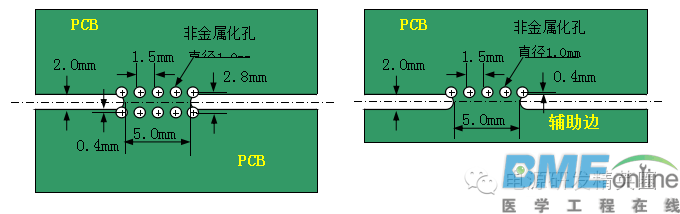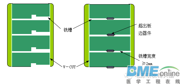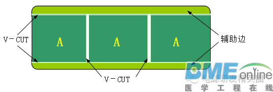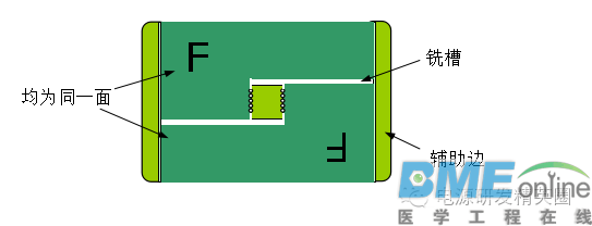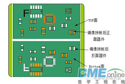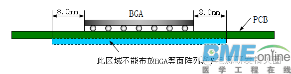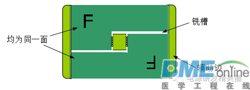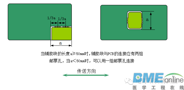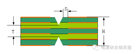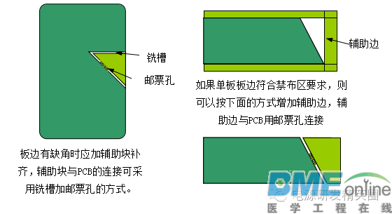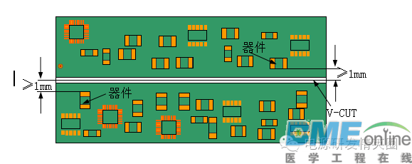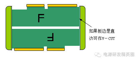 3. 术语和定义 细间距器件:pitch≤0.65mm异型引脚器件以及pitch≤0.8mm的面阵列器件。 Stand off:器件安装在PCB板上后,本体底部与PCB表面的距离。 PCB表面处理方式缩写: 热风整平(HASL喷锡板):Hot Air Solder Leveling 化学镍金(ENIG):Electroless Nickel and Immersion Gold 有机可焊性保护涂层(OSP):Organic Solderability Preservatives 说明:本规范没有定义的术语和定义请参考《印刷板设计,制造与组装术语与定义》(IEC60194) 4. 拼板和辅助边连接设计 4.1 V-CUT连接 [1] 当板与板之间为直线连接,边缘平整且不影响器件安装的PCB可用此种连接。V-CUT为直通型,不能在中间转弯。 [2] V-CUT设计要求的PCB推荐的板厚≤3.0mm。 [3] 对于需要机器自动分板的PCB,V-CUT线两面(TOP和BOTTOM面)要求各保留不小于1mm的器件禁布区,以避免在自动分板时损坏器件。 图1 :V-CUT自动分板PCB禁布要求 同时还需要考虑自动分板机刀片的结构,如图2所示。在离板边禁布区5mm的范围内,不允许布局器件高度高于25mm的器件。 ![]() 图2 :自动分板机刀片对PCB板边器件禁布要求 采用V-CUT设计时以上两条需要综合考虑,以条件苛刻者为准。保证在V-CUT的过程中不会损伤到元器件,且分板自如。 图3 :V-CUT板厚设计要求 此时需考虑到V-CUT的边缘到线路(或PAD)边缘的安全距离“S”,以防止线路损伤或露铜,一般要求S≥0.3mm。如图4所示。 图4 :V-CUT与PCB边缘线路/pad设计要求4.2 邮票孔连接 [4] 推荐铣槽的宽度为2mm。铣槽常用于单元板之间需留有一定距离的情况,一般与V-CUT和邮票孔配合使用。 [5] 邮票孔的设计:孔间距为1.5mm,两组邮票孔之间推荐距离为50mm。见图5 ![]() 图5 :邮票孔设计参数 4.3拼版方式 推荐使用的拼版方式有三种:同方向拼版,中心对称拼版,镜像对称拼版。 [6] 当PCB的单元板尺寸<80mm*80mm时,推荐做拼版; [7] 设计者在设计PCB板材时需要考虑到板材的利用率,这是影响PCB成本的重要因素之一。 说明:对于一些不规则的PCB(如L型PCB),采用合适的拼版方式可提高板材利用率,降低成本。图6 ![]() 图6 :L型PCB优选拼版方式 [8] 若PCB要经过回流焊和波峰焊工艺,且单元板板宽尺寸>60.0mm,在垂直传送边的方向上拼版数量不应超过2。 ![]() 图7 :拼版数量示意图 [9] 如果单元板尺寸很小时,在垂直传送边的方向拼版数量可以超过3,但垂直于单板传送方向的总宽度不能超过150.0mm,且需要在生产时增加辅助工装夹具以防止单板变形。 [10] 同方向拼版 l 规则单元板 采用V-CUT拼版,如满足4.1的禁布要求,则允许拼版不加辅助边 ![]() 图7 :规则单板拼版示意图 l 不规则单元板 当PCB单元板的外形不规则或有器件超过板边时,可采用铣槽加V-CUT的方式。 ![]() 图8 :不规则单元板拼版示意图 [11] 中心对称拼版 l 中心对称拼版适用于两块形状较不规则的PCB,将不规则形状的一边相对放置中间,使拼版后形状变为规则。 l 不规则形状的PCB对称,中间必须开铣槽才能分离两个单元板 l 如果拼版产生较大的变形时,可以考虑在拼版间加辅助块(用邮票孔连接) ![]() 图9 :拼版紧固辅助设计 l 有金手指的插卡板,需将其对拼,将其金手指朝外,以方便镀金。 ![]() 图10 :金手指拼版推荐方式 [12] 镜像对称拼版 使用条件:单元板正反面SMD都满足背面过回流焊焊接要求时,可采用镜像对称拼版。 操作注意事项:镜像对称拼版需满足PCB光绘的正负片对称分布。以4层板为例:若其中第2层为电源/地的负片,则与其对称的第3层也必须为负片,否则不能采用镜像对称拼版。 图11 :镜像对称拼版示意图采用镜像对称拼版后,辅助边的Fiducial mark 必须满足翻转后重合的要求。具体的位置要求请参见下面的拼版的基准点设计。 4.4辅助边与PCB的连接方法 [13] 一般原则 l 器件布局不能满足传送边宽度要求(板边5mm禁布区)时,应采用加辅助边的方法。 l PCB板边有缺角或不规则的形状时,且不能满足PCB外形要求时,应加辅助块补齐,时期规则,方便组装。 ![]() 图12 :补规则外形PCB补齐示意图 [14] 板边和板内空缺处理 当板边有缺口,或板内有大于35mm*35mm的空缺时,建议在缺口增加辅助块,以便SMT和波峰焊设备加工。辅助块与PCB的连接一般采用铣槽+邮票孔的方式。 ![]() 图13 :PCB外形空缺处理示意图 5. 器件布局要求 5.1 器件布局通用要求 [15] 有极性或方向的THD器件在布局上要求方向一致,并尽量做到排列整齐。对SMD器件,不能满足方向一致时,应尽量满足在X、Y方向上保持一致,如钽电容。 [16] 器件如果需要点胶,需要在点胶处留出至少3mm的空间。 [17] 需安装散热器的SMD应注意散热器的安装位置,布局时要求有足够大的空间,确保不与其它器件相碰。确保最小0.5mm的距离满足安装空间要求。 说明:1、热敏器件(如电阻电容器、晶振等)应尽量远离高热器件。 2、热敏器件应尽量放置在上风口,高器件放置在低矮元件后面,并且沿风阻最小的方向排布放置风道受阻。 ![]() 图 14 :热敏器件的放置 [18] 器件之间的距离满足操作空间的要求(如:插拔卡)。 ![]() 图15 :插拔器件需要考虑操作空间 [19] 不同属性的金属件或金属壳体的器件不能相碰。确保最小1.0mm的距离满足安装要求。 5.2 回流焊 5.2.1 SMD器件的通用要求 [20] 细间距器件推荐布置在PCB同一面,并且将较重的器件(如电感,等)器件布局在Top面。防止掉件。 [21] 有极性的贴片尽量同方向布置,防止较高器件布置在较低器件旁时影响焊点的检测,一般要求视角<45度。如图所示 ![]() 图 16 :焊点目视检