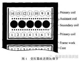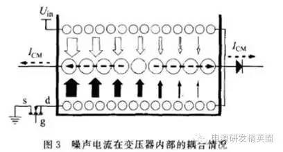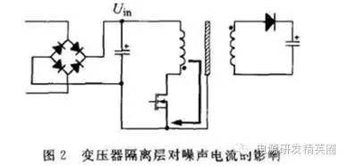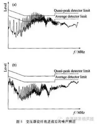 根据噪声活跃节点平衡的思想,提出了一种新的变压器EMC设计方法。通过实验验证,与传统的设计方法相比,该方法对传导电磁干扰(EMI)的抑制能力更强,且能降低变压器的制作成本和工艺复杂程度。本方法同样适用于其他形式的带变压器拓扑结构的开关电源。 随着功率半导体器件技术的发展,开关电源高功率体积比和高效率的特性使得其在现代军事、工业和商业等各级别的仪器设备中得到广泛应用,并且随着时钟频率的不断提高,设备的电磁兼容性(EMC)问题引起人们的广泛关注。EMC设计已成为开关电源开发设计中必不可少的重要环节。 传导电磁干扰(EMI)噪声的抑制必须在产品开发初期就加以考虑。通常情况下,加装电源线滤波器是抑制传导EMI的必要措施l1l。但是,仅仅依靠电源输入端的滤波器来抑制干扰往往会导致滤波器中元件的电感量增加和电容量增大。而电感量的增加使体积增加;电容量的增大受到漏电流安全标准的限制。电路中的其他部分如果设计恰当也可以完成与滤波器相似的工作。本文提出了变压器的噪声活跃节点相位干燥绕法,这种设计方法不仅能减少电源线滤波器的体积,还能降低成本。 1 反激式开关电源的共模传导干扰 电子设备的传导噪声干扰指的是:设备在与供电电网连接工作时以噪声电流的形式通过电源线传导到公共电网环境中去的电磁干扰。传导干扰分为共模干扰与差模干扰两种。共模干扰电流在零线与相线上的相位相等;差模干扰电流在零线与相线上的相位相反。差模干扰对总体传导干扰的贡献较小,且主要集中在噪声频谱低频端,较容易抑制;共模干扰对传导干扰的贡献较大,且主要处在噪声频谱的中频和高频频段。对共模传导干扰的抑制是电子设备传导EMC设计中的难点,也是最主要的任务。 反激式开关电源的电路中存在一些电压剧变的节点。和电路中其他电势相对稳定的节点不同,这些节点的电压包含高强度的高频成分[2]。这些电压变化十分活跃的节点称为噪声活跃节点。噪声活跃节点是开关电源电路中的共模传导干扰源,它作用于电路中的对地杂散电容就产生共模噪声电流M 。而电路中对EMI影响较大的对地杂散电容有:功率开关管的漏极对地的寄生电容C 变压器的主边绕组对副边绕组的寄生电容Cp ;变压器的副边回路对地的寄生电容C 变压器主、副边绕组对磁芯的寄生电容C。 、C 以及变压器磁芯对地的寄生电容C? 这些寄生电容在电路中的分布如图1所示。 图l中的共模电流, 在电路中的耦合途径主要有3条:从噪声源 功率开关管的d极通过C耦合到地;从噪声源通过c。耦合到变压器次级电路,再通过C 耦合到地;从变压器的前、次级线圈通过C?C 耦合到变压器磁芯,再通过C 耦合到地。这3种电流是构成共模噪声电流(图1中的黑色箭头所示)的主要因素。共模电流通过电源线输入端的地线回流,从而被LISN取样测量得到。 2 隔离变压器的EMC设计 2.1 传统变压器EMC设计 共模噪声的耦合除了通过场效应管d极对地这条途径外,开关管d极的噪声电压通过变压器的寄生电容将噪声电流耦合到变压器副边绕组所在的回路,再通过次级回路对地的寄生电容耦合到地也是共模电流产生的途径。因此设法减小从变压器主边绕组传递到副边绕组间的共模电流是一种有效的EMC设计方法。传统的变压器EMC设计方法是在两绕组间添加隔离层[3],如图2所示。 金属隔离层直接连接地线的设计会增大共模噪声电流,使EMC性能变差。隔离层应该是电路中电位稳定的节点,比如将图2中的隔离层连接到电路前级的负极就是一个很好的接法。这样的连接能把原本流向大地的共模电流有效分流,从而大大降低电源线的传导噪声发射水平。 2.2 节点相位平衡法 在电路中,噪声电压活跃节点并不是单一的。以本文分析的电路为例:除功率开关管的d极外,变压器前级绕组的另一端U 也是一个噪声电压活跃节点,而且节点电压的变化方向与场管的d极电压情况相反。所以变压器次级绕组的两端是相位相反的噪声电压活跃节点。图3所示的是采用节点相位平衡法后,变压器骨架上的线圈分布情况。 变压器骨架最内层是前级绕组线圈的一半,与功率开关管的d极相连;中间层的线圈是次级绕组;最外层是前级绕组的另一半,与节点U.相连。由于噪声电流主要通过前后级线圈层之间的寄生电容耦合,把前、后级线圈方向相反的噪声活跃节点成对地绕在内外层相对位置就能使大部分的噪声电流相互抵消,大大降低了最终耦合到次级的噪声电流的强度。 本文讨论的电路中还存在前级电路和次级电路的辅助电源,它们也是由绕在变压器上的独立线圈提供能量的。这两级辅助线圈的存在给噪声电流的传播提供了额外的途径。辅助线圈是为了控制电路的供电设计的。尽管控制电路本身的功率很小,但它们的存在却增大了电路对地的寄生电容,从而分担了一部分把共模噪声从活跃节点耦合到地的工作。然而把这些绕组夹在前级线圈和次级线圈的绕组中间就能增大前后级绕组的距离,从而它们的层间寄生电容就减小了,噪声电流就能相应减小。因此,变压器绕制的最终方法应如图4所示。从内到外的线圈绕组依次是:前级绕组的一半、辅助绕组的一半、后级绕组、辅助绕组的另一半和前级绕组的另一半。 3 实验部分 变压器改进绕法对开关电源的传导EMC性能提高的有效性可以通过实验得到