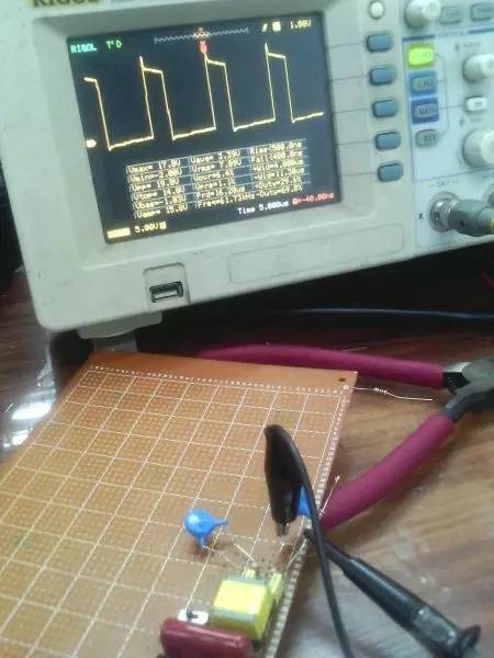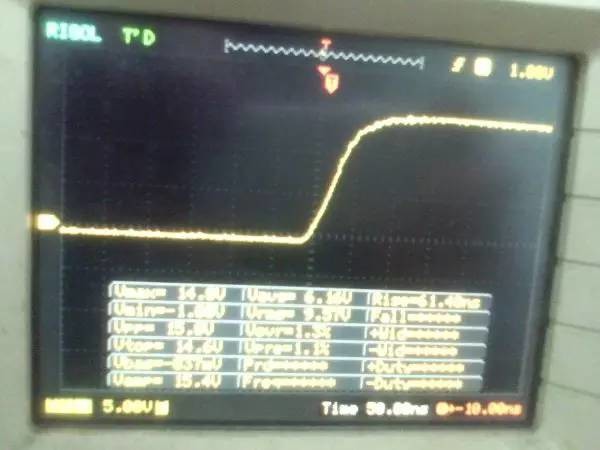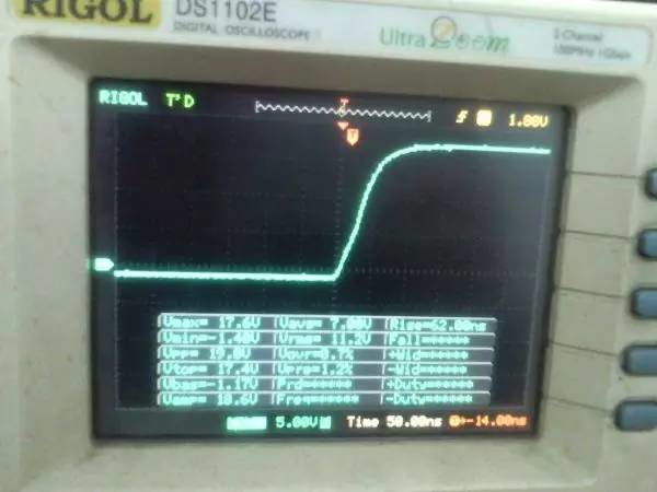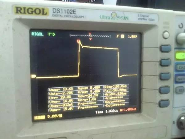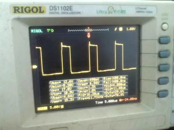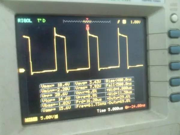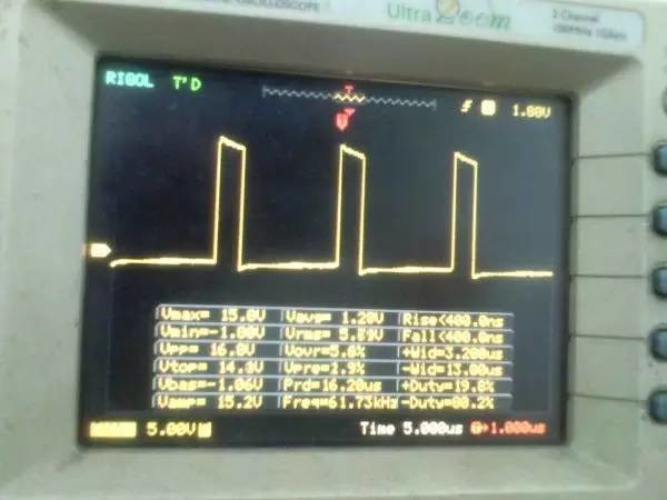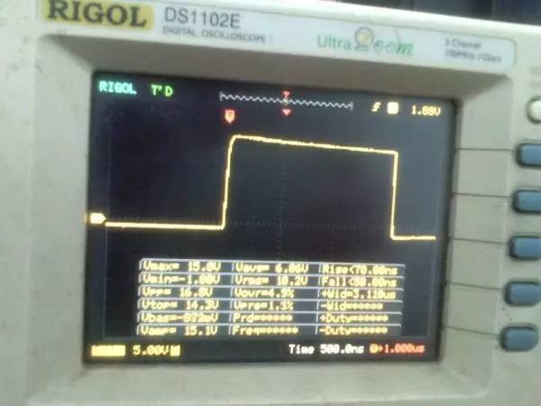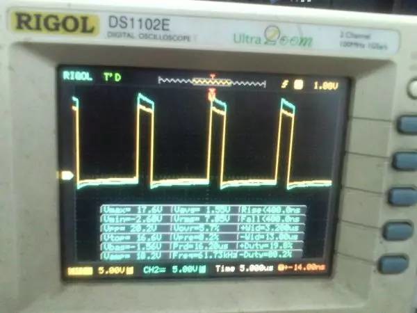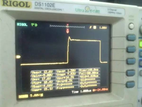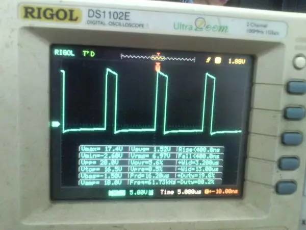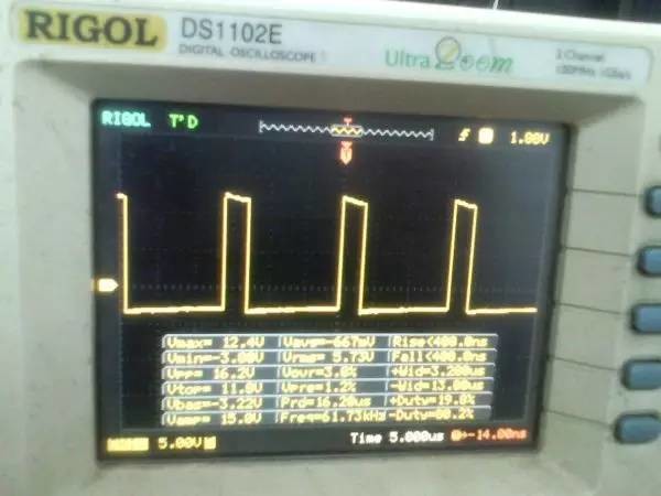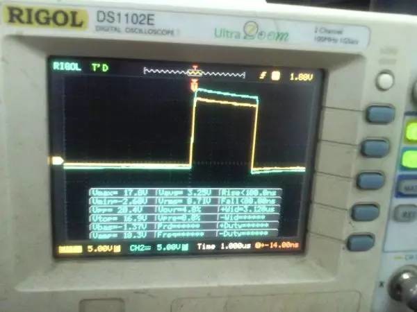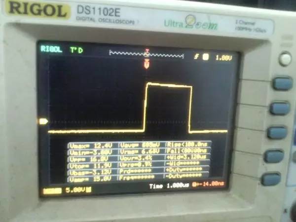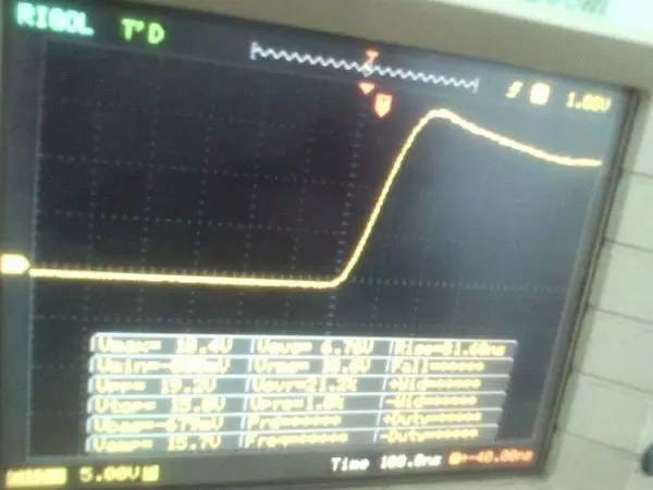 以前听朋友说ep系列的磁芯漏感可以做到很小,所以特地买了点ep13来做实验。 先来看一哈ep13的参数 假设输如驱动电压取到15v,AE值留点余量取0.2,最大占空比0.45,频率设70K。那么根据公式 Np=U*D/(B*AE*F)=15*0.45*10000/(0.2*0.195*70000)=24.7圈,取25圈 先贴上变压器原理图: 实际我用了0.25的线,因为我没有更细的了,且0.25线刚好饶满一层的圈数是25圈,或许用0.15或者0.2的线饶30圈也不是什么坏事。 这个上午绕好的,测试感量差不多是1mh的样子 短路驱动变压器副边的2组输出脚,测一哈漏感 0.4052uh!!漏感只有大约0.4%, 看来这个磁芯真的可以做到很小的漏感 。不过在小的漏感波形不好也是没有用的。我的测试板子,pwm是用单片机做输出(频率稳定,占空比稳定),经过电平变换,加强驱动以后输给变压器 来一张 确认电路焊接没有错误,特别是短接什么的。 通电,这个是一个绕组空载输出波形,感觉还可以哦 放大在看看,还是比较和谐的 看看波形的上升沿时间,上升到10v的时候大概是50ns的样子,先记着这个时间,因为我们要和输入的上升沿时间做一个对比!!!! 在看看第2个通道的波形,和第一个差不多,只是电压多了点,可能是我多绕了2圈,绕的时候没数,不过这个倒不是什么大问题 打开看看,也没有发现什么不和谐的地方 看看时间和第一个绕组的差不多。。。 来张合影的,几乎是重叠的,只是电压高了那么点点,看上去不爽。 展开来看 在回来看看输入波形,个人感觉还是很漂亮的 打开还是一样的,舒服! 现在看看输入波形的上升时间,上升到10v也差不多是50ns的样子,所以变压器本事并没有对上升沿时间造成什么不和谐。 话说单片机输出的pwm,上升时间在10ns左右,但是我始终没有找到把电平变化以后,还能保持上升时间结构,很是好奇那些信号发生源里面的波形放大电路是个什么样子的 现在在输出端接一颗222的电容,看输入端的波形 如下:有个小小的尖峰,但是这个尖峰并不能构成什么威胁,忽略掉。 打开看看,上升沿的时间肯定加大了。 具体是多少了,跑到了差不多100ns,但是对于mos来说应该还可以接受。 现在来看看接了222电容的输出端波形,尖峰有点不理想,有点大了 在一开始的变压器原理图中,我表明了10欧姆电阻是很重要的,我直接去掉10欧姆电阻,尖峰跑到了8v左右,比现在这个大了好多,加大到15欧姆的时间,尖峰小了2v左右 为了防止mos管挂掉,可以在MOS管GS接个稳压二极管。 打开看一看,尖峰下降还是线性的。 看看上升时间和输入差不多,但是我感觉这个比输入的要漂亮。 最后来一张驱动两个222电容时候,一个输出绕组的波形,和前面一个222相比,我并没有发现尖峰加大了一倍或者出现了什么重大错误。 重拍完照到写完帖子,带载两颗222已经过去了2小时,输入端电源显示输入电压15v 25ma, 整个电路并没有什么元件出现发热什么的。 有一个小小的插曲,在变压器的原理图中我输入端的耦合电容是cbb 1uf电容,实际也是用的1uf,但是当我给cbb电容并了一个黄色的(如上面变压器输出那个电容)104电容以后,变压器哪怕空载输出,驱动三极管都开始发热,上升沿时间已经跑到了2us级别,三角已经开始线性工作了,更不用说输出带电容的发热情况。 于是我去掉并接的104电容,用电桥测试了一哈,并没有发现他是坏的。是频率特性比较差? 最后来个终结: 感觉今天用ep13做的这一个驱动变压器还是可以使用的,重波形看上去没有什么不和谐的,虽然有个尖峰,但是我想实际应用的时候加一颗稳压管应能保证mos的安全工作,还望大伙如果能对上面所做变压器提出宝贵的建议和意见。 作者:xd285070