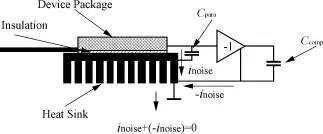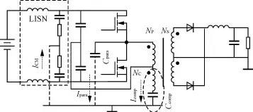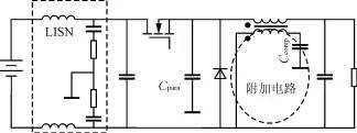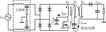 由于MOSFET及IGBT和软开关技术在电力电子电路中的广泛应用,使得功率变换器的开关频率越来越高,结构更加紧凑,但亦带来许多问题,如寄生元件产生的影响加剧,电磁辐射加剧等,所以EMI问题是目前电力电子界关注的主要问题之一。 传导是电力电子装置中干扰传播的重要途径。差模干扰和共模干扰是主要的传导干扰形态。多数情况下,功率变换器的传导干扰以共模干扰为主。本文介绍了一种基于补偿原理的无源共模干扰抑制技术,并成功地应用于多种功率变换器拓扑中。理论和实验结果都证明了,它能有效地减小电路中的高频传导共模干扰。这一方案的优越性在于,它无需额外的控制电路和辅助电源,不依赖于电源变换器其他部分的运行情况,结构简单、紧凑。 1 补偿原理 共模噪声与差模噪声产生的内部机制有所不同:差模噪声主要由开关变换器的脉动电流引起;共模噪声则主要由较高的d/d与杂散参数间相互作用而产生的高频振荡引起。如图1所示。共模电流包含连线到接地面的位移电流,同时,由于开关器件端子上的d/d是最大的,所以开关器件与散热片之间的杂散电容也将产生共模电流。图2给出了这种新型共模噪声抑制电路所依据的本质概念。开关器件的d/d通过外壳和散热片之间的寄生电容对地形成噪声电流。抑制电路通过检测器件的d/d,并把它反相,然后加到一个补偿电容上面,从而形成补偿电流对噪声电流的抵消。即补偿电流与噪声电流等幅但相位相差180°,并且也流入接地层。根据基尔霍夫电流定律,这两股电流在接地点汇流为零,于是50Ω的阻抗平衡网络(LISN)电阻(接测量接收机的BNC端口)上的共模噪声电压被大大减弱了。