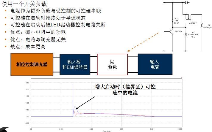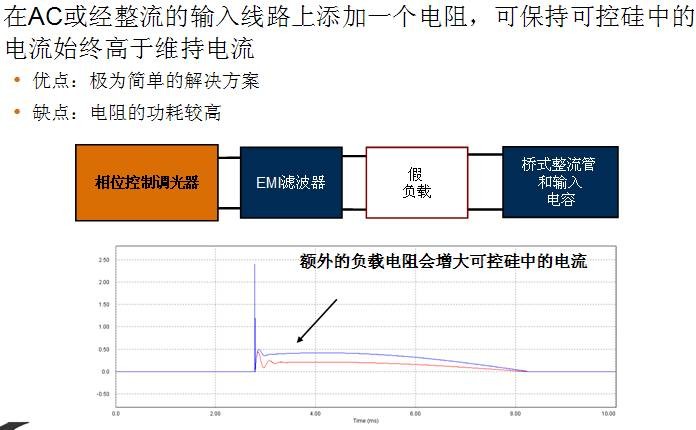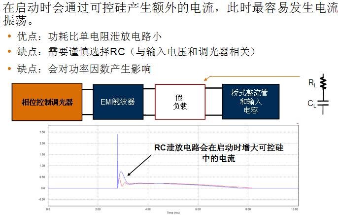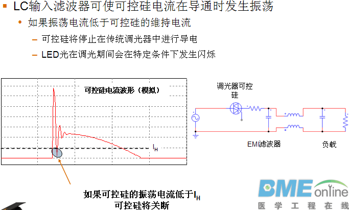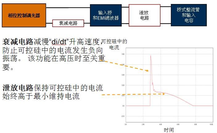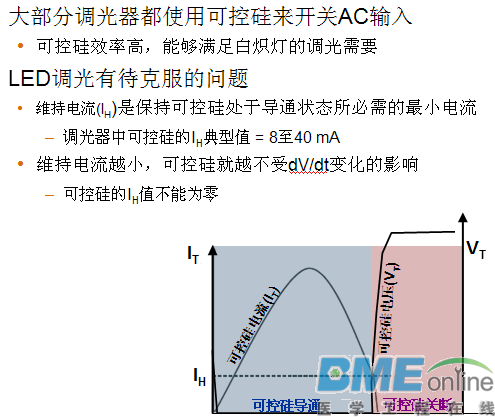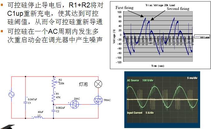 大家是不是在设计led调光电源的时候,电源会出现频闪的现象呢?通常人眼能够感知到频率达70Hz的光闪烁,高于这个频率则不会感知。故在LED照明应用中,如果脉冲信号出现频率低于70Hz的低频分量,人眼就会感受到闪烁。闪,一般都是回路电流达不到可控硅的维持电流,达不到维持电流有几个原因. 1可控硅导通后,电路由于不是阻性,由于电容,电感,会存在电流振荡,当电流振荡到低于可控硅维持电流后,就可控硅关断,然后重新触发。 2可控硅导通后,电流会慢慢下降,当下降到可控硅维持电流前,由于这个时间很短,如果后面电路还来不及工作,同样会重启。 3当输入电压降低时,回路电流也降低,降低到低于可控硅维持电流后,可控硅关断。 ![]() 可控硅调光原本是应用于白炽灯的,白炽灯的效率很低,所以要得到响应的亮度时需要的功率大,功率大了就意味着电流大,也就是说电流不会小于SCR的维持电流,SCR不会关断,也就没有闪烁的问题。 另外白炽灯是依靠热发光的,而热量是不能瞬时转走的,所以即使有瞬时的中断,发光也不会突然变化。但LED就不是这样的,同样的亮度,输入功率很小,也就是电流小,很容易低于维持电流一下。另外LED的反应很快,一没有电流马上就灭掉,所以也容易使人眼感觉到。 调光器的结构,R1,C2决定了最大导通角,由于有充电时间,所以调光器调到最大时输入电压也不能完全导通,一般DIAC的电压为30V左右。L1限制di/dt,避免可控硅损坏,C1滤除一部分干扰,降低噪音。![]() ![]() 由于有最小维持电流的要求并且市场上的调光器厂家用的可控硅质量不一样,所以维持电流差别很大,如果要适应所有的调光器,功率的损耗就比较高,效率下降,所以大部分厂家的方案都是只能适应大部分调光器。 ![]() 除了维持电流以外,引起可控硅关断从而引起灯闪的另外一个原因是可控硅导通瞬间的振荡,可控硅里面有一致di/dt的电感,另外电源为了通过EMI,也需要加很多抑制EMI电感,电容,开通瞬间一个高压突然加到一个LC电路,一定回引起振荡,如果振荡的电流低于可控硅维持电流,可控硅会关掉,再次充电触发,引起闪烁。![]() 这个波形可以说明问题。要解决电流振荡问题,可用以下方法:1)减少EMI滤波器的尺寸2)采用更多复杂的电子调光电路成本昂贵,电子调光不是用可控硅的,是用三极管或MOS管,并且始终导通,这种调光器在国内少见。3)使用衰减电路使可控硅保持导通降低效率,增加成本,但也是唯一可行的方法。 ![]() 这就是解决问题的方法,衰减或叫阻尼电路阻止可控硅导通时的振荡,避免电流到维持电流以下。泻放电路或者叫假负载在MOS关断时提供维持电流,使可控硅不会关断。![]() 说道假负载自然就想到电阻,这当然是可以的,为了在正弦波的两边(电压低)也有足够的维持电流,电阻必须比较小,损耗很大。![]() 这是目前很多IC厂家采用的方法,用RC做假负载,一般C取220nF左右,R取几百欧姆,这样相当于在整流桥后面加了个高频负载,对于工频来说C接近于开路,所以RC是断开的,对于开关频率来说,C的阻抗很小,相当于短路,这样R就加在整流桥后做假负载。当然只要有C就对PF值有一定影响。到这样一定有人想到有源假负载的概念。![]() 主动泻放电路,启动后关掉。![]() 这个大家自己理解吧。文章来源:世纪电源网