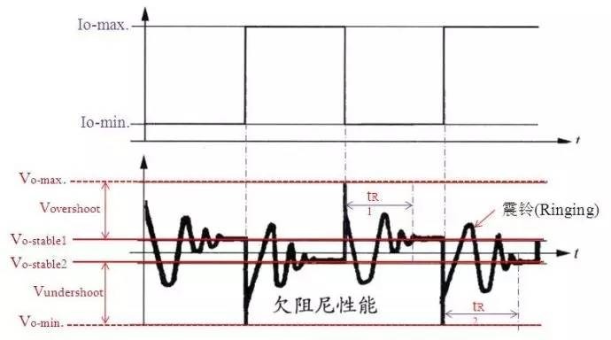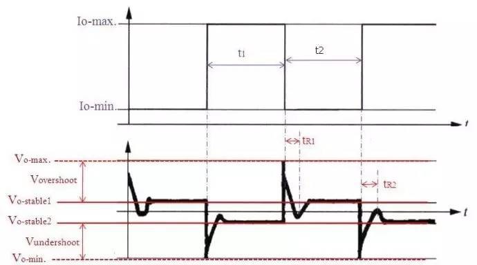 解析开关电源动态响应波形以及解决办法1导读 概念 动态响应一般是指控制系统在典型输入信号的作用下,其输出量从初始状态到最终状态的响应。对某一环节(系统)加入单位阶跃输入x(t)时,其响应y(t)开始逐渐上升,直到稳定在某一定值上为止。响应y(t)在达到一定值之前的变化状态称为过渡状态(动态)。此称为动态响应。 工程师在设计电源时,动态响应是必不可少的一项测试指标。由于涉及环路问题一直是很多工程师的心病,下面从几个方面来谈一谈动态响应希望对大家有所帮助: 为什么开关电源需要测试动态响应? 电源动态响应的一般测试方法和要求 测试条件测试数据及示意图 测试步骤 什么样的结果算合格? 动态响应与什么有关?该如何整改? 2为什么开关电源需要测试动态响应?开关电源都是给各种电子设备供电的,电子电路一般都需要一个即使在负载电流发生瞬变时,输出电压也能维持在特定容差范围内的电压源,以确保电路的正常工作。设计工程师必须在理解瞬态响应原理的基础上,利用正确的设计思路才能以较低的成本改善电源的瞬态响应性能。随着各种电子设备或微处理器工作速度和电流需求量的提高,当负载电流发生瞬态变化时,稳压器在指定范围内保持输出电压的能力成为一个广泛存在的困扰。典型CPU芯片的电源规范要求,即使负载电流在几百纳秒内发生10或20A的变化,供电电压仍然要保持稳定,要实现这个性能指标绝非易事。也是很多电源工程师遇到的比较棘手的问题。 3电源动态响应的一般测试方法和要求输入、输出电压为一定值,比如AC220输入的电源,在AC176V、AC220V、AC264V时测试,输出负载在额定值的25%-50%-25%和50%-75%-50%变化,恢复时间≤200us时,输出电压的超调量≤输出电压整定值的±5%;恢复时间》200us,输出电压的超调量≤输出电压整定值负载调整率(即要求不能够超过输出电压整定值的±0.5%),当然有些波形太差或者声音太大客户都是不接受的,另外还有些要求严格的在温度极限或是输入最低和最高频率都得测试。 注:恢复时间是指直流输出电压变化量上升至大于稳压精度处开始,会至小于等于并不超过稳压精度处止的这段时间。 4测试条件测试数据及示意图输入:规格中定义的最小及最大输入交/直流电压,最小及最大交流频率 输出:规格中定义的动态负载电流条件及规格所允许的最小电容负载 温度:最低工作温度,常温及最高工作温度 示波器采样方式:一般设为Sample或Hi-res模式 测试示意图如下 ![]() 负载设置(如下图示) 依规格要求设定负载电流的起、止点,负载电流的上升、下降速率(Slew Rate)及负载电流的变化周期;一般负载电流的上升和下降速度设置为2.5A/uS,变化周期一般为20ms。 开机后按规格要求,调整负载电流的变化周期(通过改变t1,t2)。 电源测试系列之输出动态响应(Output <wbr>Dynamic <wbr>Response <wbr>Test) 如下图中的各项数据: 电压值:Vo-max, Vovershoot, Vo-stable1, Vo-stable2, Vo-undershoot, Vo-min, 响应时间:tR1,tR2 参考值:t1, t2,Iomax,Io-min;或负载占空比,频率,Iomax,Io-min; ![]() 测量波形数据 如下图中的各项数据: 电压值:Vo-max, Vovershoot, Vo-stable1, Vo-stable2, Vo-undershoot, Vo-min, 响应时间:tR1,tR2 参考值:t1, t2,Iomax,Io-min;或负载占空比,频率,Iomax,Io-min; 5测试步骤![]() 1)设定最低环境工作温度,最小输入电压/频率;对需做动态响应测试的输出,依规格要求设定其负载电流的起、止点,负载电流的上升、下降速率(Slew Rate)及负载电流的变化周期;其他输出负载按照Regulation Table要求设定; 2)开机后按规格要求,调整负载电流的变化周期(t1,t2),观察输出波形的变化; 3)记录使Vo-max、Vovershoot、Vundershoot及Vo-stable1最大,Vo-min及Vo-stable2最小的测试条件, 测量输出电压的各对应值及输出响应时间,并保存波形; 4)在步骤3的动态电流的变化周期下,改变其他输出负载条件,使Vo-max、Vovershoot、Vundershoot及Vo-stable1最大,Vo-min及Vo-stable2最小,测量并记录相应数据; 5)以步骤3及4找到的最差负载条件为负载,以待测电源所提供的各种开机方式开机(如AC on, PS_ON on); 6)依次改变测试条件(动态负载起始点,输入电压/频率及环境温度),重复步骤2、3、4、5; 7)同样方法测试其他输出动态响应。 6什么样的结果算合格?各输出测量值符合规格要求: 不能有震铃(Ringing, 反馈回路欠阻尼)现象, 待测电源不可以损坏(Damaged/Broken down), 待测电源不可以工作不稳定,甚至关机(Shut down), 响应时间符合要求。 判定图例 1 如下图中的各输出测量值符合规格要求;虽有过阻尼,但可接受; 判定图例 2 虽然如下图中的各输出测量值符合规格要求,但反馈回路欠阻尼(不稳定),故不能接 受。 ![]() 上一个电源动态负载实测波形 7动态响应与什么有关?该如何整改?![]() 动态负载特性,关系到环路的响应特性。好与差在动态负载时体现很明显。 下供助相关资料阐述动态特性的特点与环路要求: ![]() 关于动态特性的调整时间与带宽有关系,带宽越窄,调整越快;输出过冲与电路的阻尼系数有关系,阻尼系数越小,过冲越大改善动态响应的对策参考: 适当改善反馈响应速率(如适当减小431上RC电路中的电容量、增加光耦电流、减小电流检测PIN脚上RC电路中的电容值),但需注意噪声、重载开机问题;另外,这一方案也受制于实际设计方案的选择: PWM方式受最大占空比的限制(Flyback:约0.8,单端正激0.5,其他如Push-pull、Half-bridge,Full-bridge等为0.8,Boost为0.9