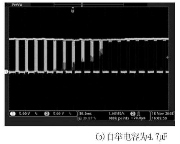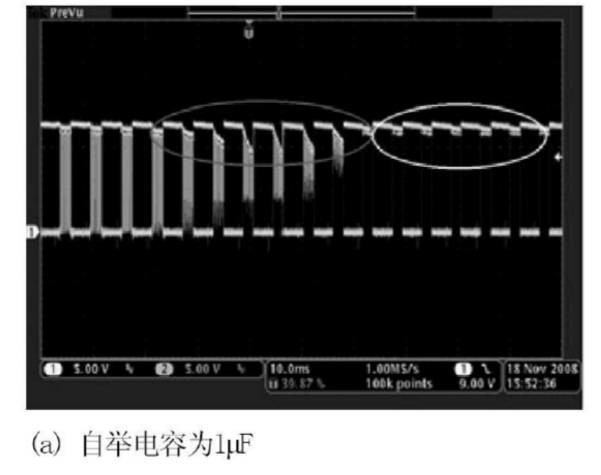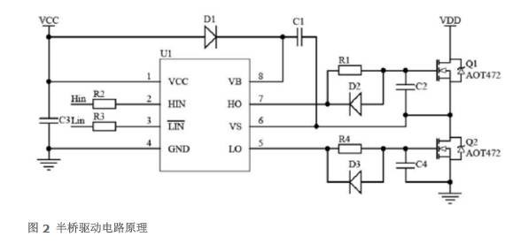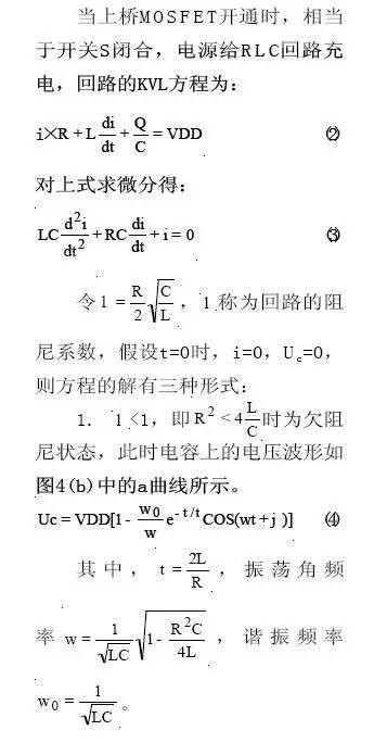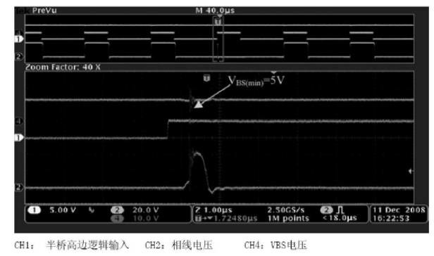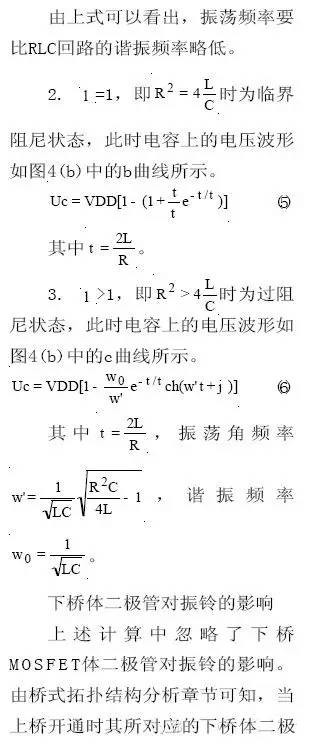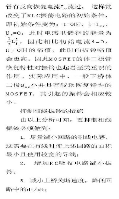 1 引言 MOSFET凭开关速度快、导通电阻低等优点在开关电源及电机驱动等应用中得到了广泛应用。要想使MOSFET在应用中充分发挥其性能,就必须设计一个适合应用的最优驱动电路和参数。在应用中MOSFET一般工作在桥式拓扑结构模式下,如图1所示。由于下桥MOSFET驱动电压的参考点为地,较容易设计驱动电路,而上桥的驱动电压是跟随相线电压浮动的,因此如何很好地驱动上桥MOSFET成了设计能否成功的关键。半桥驱动芯片由于其易于设计驱动电路、外围元器件少、驱动能力强、可靠性高等优点在MOSFET驱动电路中得到广泛应用。 2 桥式结构拓扑分析 图1所示为驱动三相直流无刷电机的桥式电路,其中LPCB、 LS、LD为直流母线和相线的引线电感,电机为三相Y型直流无刷电机,其工作原理如下。 ![]() 直流无刷电机通过桥式电路实现电子换相,电机工作模式为三相六状态,MOSFET导通顺序为Q1Q5→Q1Q6→Q2Q6→Q2Q4→Q3Q4→Q3Q5。 系统通过调节上桥MOSFET的PWM占空比来实现速度调节。Q1、Q5导通时,电流(Ion)由VDD经Q1、电机线圈、Q5流至地线,电机AB相通电。Q1关闭、Q5导通时,电流经过Q5,Q4续流(IF),电机线圈中的电流基本维持不变。Q1再次开通时,由于Q3体二极管的电荷恢复过程,体二极管不能很快关断,因此体二极管中会有反向恢复电流(Irr)流过。由于Irr的变化很快,因此在Irr回路中产生很高的di/dt。 3 半桥驱动电路工作原理图2所示为典型的半桥驱动电路。 ![]() 半桥驱动电路的关键是如何实现上桥的驱动。图2中C1为自举电容,D1为快恢复二极管。PWM在上桥调制。当Q1关断时,A点电位由于Q2的续流而回零,此时C1通过VCC及D1进行充电。当输入信号Hin开通时,上桥的驱动由C1供电。由于C1的电压不变,VB随VS的升高而浮动,所以C1称为自举电容。每个PWM周期,电路都给C1充电,维持其电压基本保持不变。D1的作用是当Q1关断时为C1充电提供正向电流通道,当Q1开通时,阻止电流反向流入控制电压VCC。D2的作用是为使上桥能够快速关断,减少开关损耗,缩短MOSFET关断时的不稳定过程。D3的作用是避免上桥快速开通时下桥的栅极电压耦合上升(Cdv/dt)而导致上下桥穿通的现象。 4. 自举电容的计算及注意事项 影响自举电容取值的因素 影响自举电容取值的因素包括:上桥MOSFET的栅极电荷QG、上桥驱动电路的静态电流IQBS、驱动IC中电平转换电路的电荷要求QLS、自举电容的漏电流ICBS(leak)。计算自举电容值 自举电容必须在每个开关周期内能够提供以上这些电荷,才能保持其电压基本不变,否则VBS将会有很大的电压纹波,并且可能会低于欠压值VBSUV,使上桥无输出并停止工作。电容的最小容量可根据以下公式算出: 其中,VF为自举二极管正向压降,VLS为下桥器件压降或上桥负载压降,f为工作频率。图3所示为直流无刷电机驱动器半桥驱动芯片上桥的自举电压(CH1: VBS)和驱动电压(CH2: VGS)波形,使用的MOSFET为AOT472。 ![]() ![]() 驱动器采用调节PWM占空比的方式实现电机无级调速。 通过公式1算出电容值应为1μF左右,但在实际应用中存在这样的问题,即当占空比接近100%(见图3a)时,由于占空比很大,在每次上桥关断后Vs电压不能完全回零,导致自举电容在每个PWM周期中不能完全被充电。但此时用于每个PWM周期开关MOSFET的电荷并未减少,所以自举电压会出现明显的下降(图3a中左侧圈内部分),这将会导致驱动IC进入欠压保护状态或MOSFET提前失效。而当占空比为100%时,由于没有开关电荷损耗,每个换相周期内自举电容的电压并未下降很多(图3a中右侧圈内部分)。如果选用4.7μF的电容,则测得波形如图3(b)所示,电压无明显下降,因此在驱动电路设计中应根据实际需求来选取自举电容的容量。 6. 相线振铃的产生及抑制 在图1中,线路的引线电感(LPCB+LS+LD)及引线电阻RPCB与MOSFET的输出电容COSS形成了RLC串联回路,如图4(a)所示,对此回路进行分析如下: ![]() ![]() ![]() ![]() 4. 选择具有较小Qrr和具有较软恢复特性的MOSFET作为续流管;5. 由于增加串联回路的电阻会耗散很大的功率,所以增加串联电阻的方法在大部分应用中不可行。 振铃的危害 图5 振铃干扰半桥芯片正常工作的波形图5所示为一半桥驱动MOSFET工作时的波形,当上桥逻辑输入为高时,上桥MOSFET开通,此时可以看到相线(CH2)上产生了振铃,这样的振铃通过线路的杂散电容耦合到上桥自举电压,造成上桥的VBS