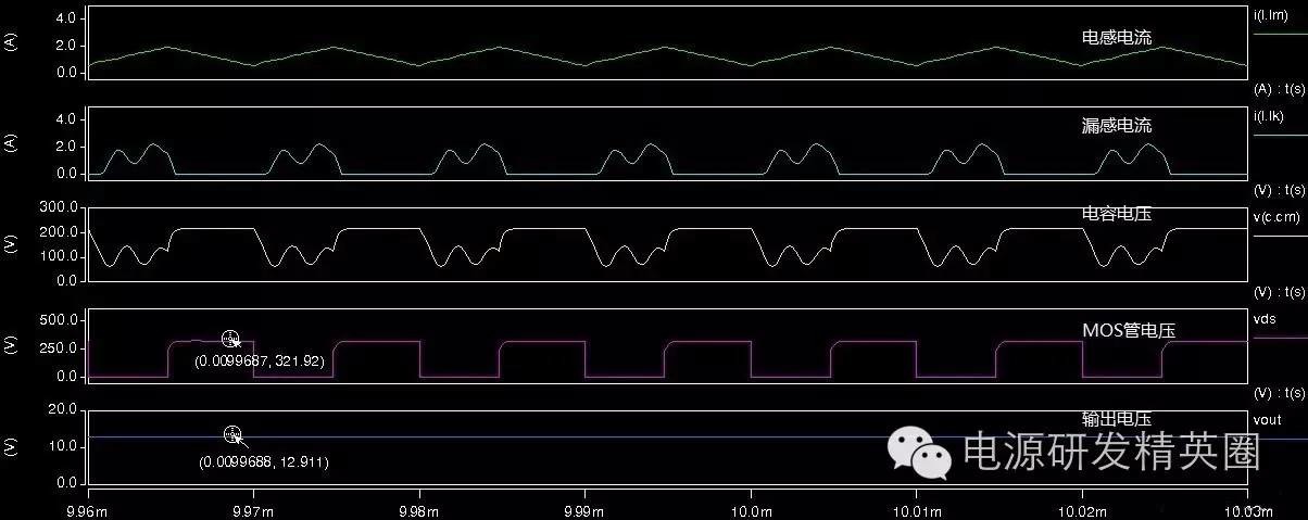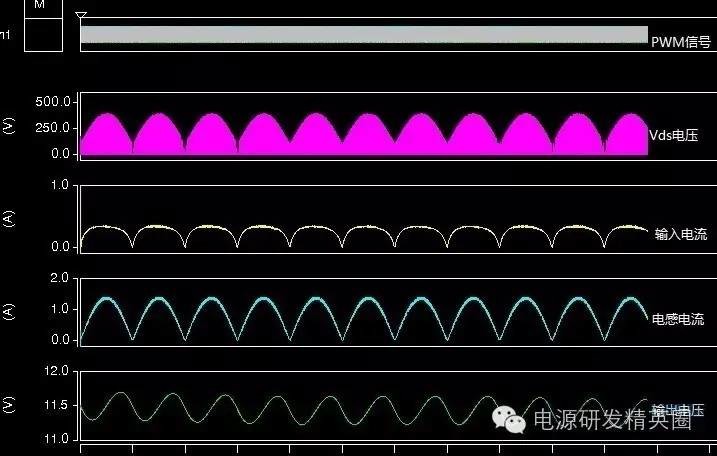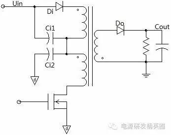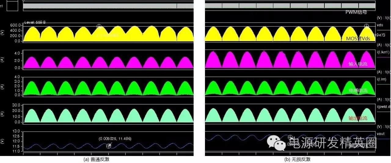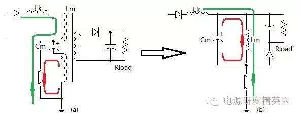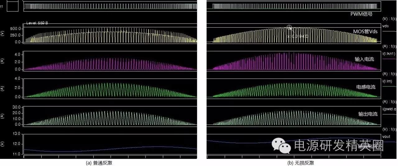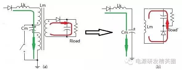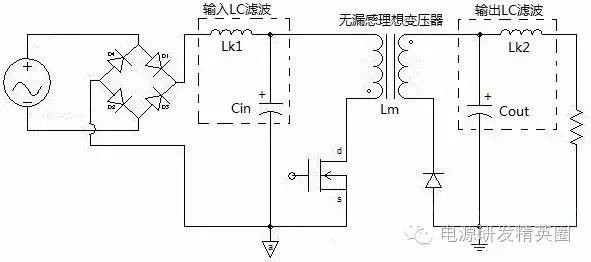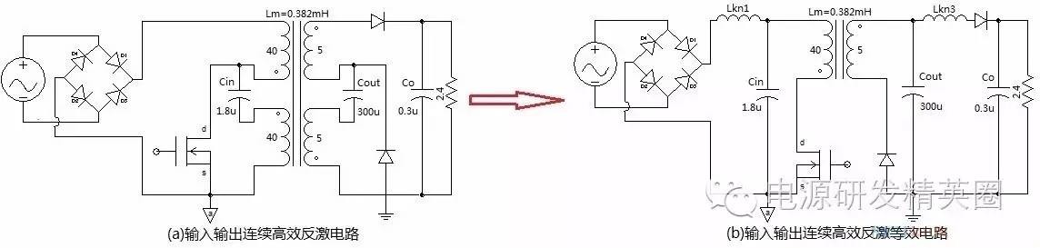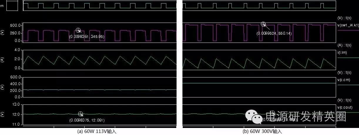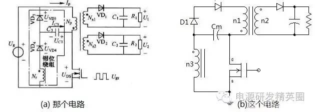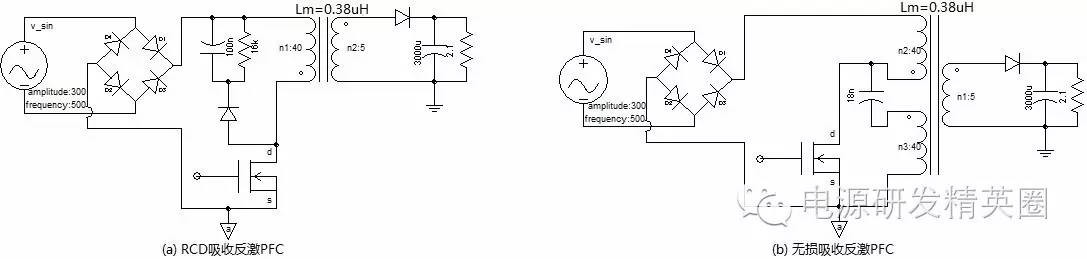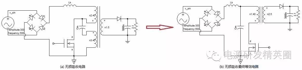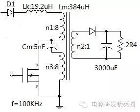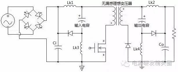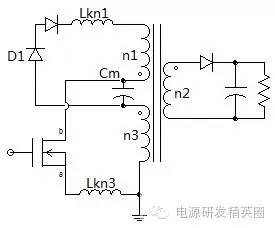 对于反激电路多数情况下是希望漏感越小越好,偶然发现一个电路可以将漏感的能量传递到次级同时还保持着反激电路简单、低成本的特性,并且通过略微调整可以得到几种不同的应用。对于软开关类的电路漏感又是有益的,一般漏感都是由工艺决定的,是否可以将漏感设计出来而非生产出来?如果能实现“零”漏感的变压器这个想法估计就可以实现。 这个电路的想法是源自于下面两种电路, ![]() 图1 无损吸收和一种电路 图1中(a)是无损吸收电路是将漏感的能量返回到输入端,这种电路如果参数不合适的话会有较大的无功损耗可能不适用于宽范围的场合。(b)电路是一个网友剖析的一个电路输出功率有1000多瓦,这个电路的缺点是输出功率全部需通过电容Cm来传递类似于Cuk、Speic类电路。综合电路(a)和(b)的特点就有了一个可以解决漏感问题的简单而又低成本的反激电路。 图1中(a)的后半部分加(b)的前半部分就构成了这种电路见下图 ![]() 图2 解决漏感问题的反激电路及等效电路 图2中的两个电路是一样的只是形式不同,如果去掉电容Cm电路的左侧就如同一个带去磁绕组的正激变压器初级侧,同样这里的线圈n1、n3也要采用双线并绕,如果两线圈耦合的好二极管D1是可以省掉的,如果耦合的不好就会产生图1中(a)的效果会有一部分无功损耗。 这个貌不惊人的电路其仿真结果却相当的理想,通过改变漏感Lk和电容Cm的参数还能得到几种不同的应用。限于水平也可能分析的不对,希望各位行家也能一起探讨下。 仿一个12V输出60W的反激电源,参数如下图 ![]() 图3 12V60W反激电路参数 假设初级线圈耦合的比较好可以去掉原D1二极管,因漏感和电容会发生震荡所以把D1串入到输入端只为方便观察波形。在有的应用中反而要加大这个LC震荡,比如QR模式的软开关。 输入为低压113V时的波形如下: 图3-1 漏感电流断续的反激波形在上图中漏感电流是断续的,电容Cm的最大电压200V左右,MOS管的Vds电压321V左右。 这个应用中电容Cm只是用来吸收漏感能量并在下个开关周期将漏感能量传递到次级,适当的增加Cm的容量会得到更好的效果。 ![]() 当电容Cm增大后对漏感的吸收也变强了,此时漏感可以设计的大一些,上图3-2中可以看到漏感的电流已经为连续模式了(可去掉二极管D1),漏感电流亦既输入电流,输入电流连续可以提升电源的性能如果用于功率因数校正可以实现连续模式的反激PFC功能。图中电容Cm的电压钳位在输入电压(113V)左右,MOS管的Vds电压215V左右为输入电压+反射电压(100V左右)之和,由此可推断在高压输入300V时MOS管的Vds电压为300+100=400V左右,MOS管可以选用低电压型号的,电容Cm容量大了成本也会高这个可能需要权衡一下。 先就自己的理解去分析下这个电路的原理,首先分析图3输入串二极管的电路。 ![]() 图4-1-1 开关导通时的工作模式及等效电路 图4-1-1中的(b)是开关导通时的等效电路,工作模式分两个阶段: 开关导通初期阶段,电容Cm上的电压高于输入电压所以先由Cm驱动电感Lm,当Cm的电压≤输入电压时这一阶段结束,电容Cm上只存储漏感的能量所以这一阶段时间很短。 开关导通后期阶段,漏感Lk和电感Lm串联由输入电压驱动同时电容Cm和电感Lm会发生轻微震荡(某些情况是靠这个震荡把漏感能量传递到次级)。 ![]() 图4-1-2 开关截止时的工作模式及等效电路 见图4-1-2中的(b)等效电路,在开关关断期间输入和输出可视为两个独立的电路,输入侧漏感Lk的能量被电容Cm吸收,输出侧电感Lm对负载释放能量。 由上面两个过程分析可知,在开关Toff期间电容Cm只存储漏感的能量,在开关Ton期间电容Cm只释放所存储的漏感能量并将其传递到输出侧,除此之外同普通的反激没什么区别。一般设计反激电路时会为漏感预设160V左右的余量,当用这个电路后这个160V可以忽略了(根据Cm的大小范围在0-160V之间)可用低耐压的MOS管同时漏感能量传递到次级整体效率会提升不少。 其次反激变压器在连续模式下其输出二极管有反向恢复问题,见下图 ![]() 反向恢复问题可等效的看作是在MOS管旁并联了一个大电容造成开启瞬间出现一个电流尖峰,根据反激开关电源的工作机理增大漏感可以抑制这个电流尖峰,见图4-2-2 ![]() 图4-2-2 漏感可抑制输出二极管反向恢复造成的电流尖峰 在以往情况下增加漏感意味着损耗增大效率降低,漏感小又有反向恢复问题效率也会降低只能折中选取一个漏感。当采用这种新拓扑的话问题就容易解决了,可以增大漏感又不影响效率。 在前面图2中初级线圈n1、n3是采用双线并绕,在这个应用中不采用并绕的方式或者是额外引入漏感使n1、n3线圈都寄生有漏感,电路如下 ![]() 图4-2-3 解决输出二极管反向恢复问题的电路 仿真结果如下: ![]() 图4-2-4 解决输出二极管恢复问题的仿真 从图4-2-4中可以看出增加的漏感Lkn3很好的抑制了电流尖峰,不过漏感Lkn3上的能量只能传递回电源形成无功功率,好在这部分能量不大无功损耗也就更小了。 有一篇叫做“反激变换器绕组钳位电路的设计与分析”的文章与这里的电路非常的相似 那个电路所具有的优点也是这个电路的优点,从而验证了之前的理论和仿真结果。不过这里的电路有着更优异的特点,见下面两个电路对比图 ![]() 图 4-2-5 那个电路与这个电路的对比 两个电路的区别就在于二极管的接法略有不同,图(b)这个电路能达到更高的效率而且可以实现软开关。 可能