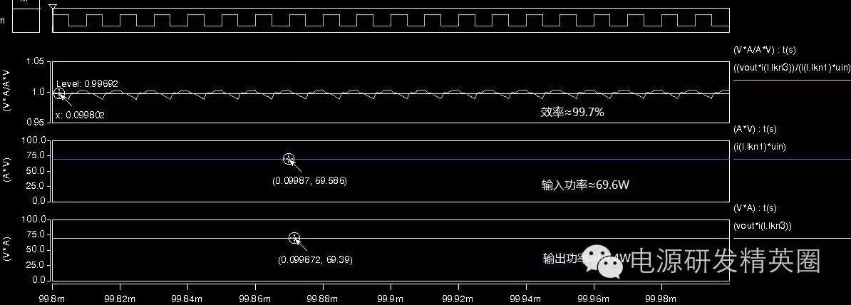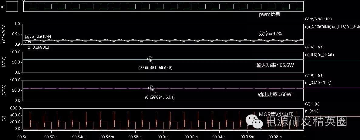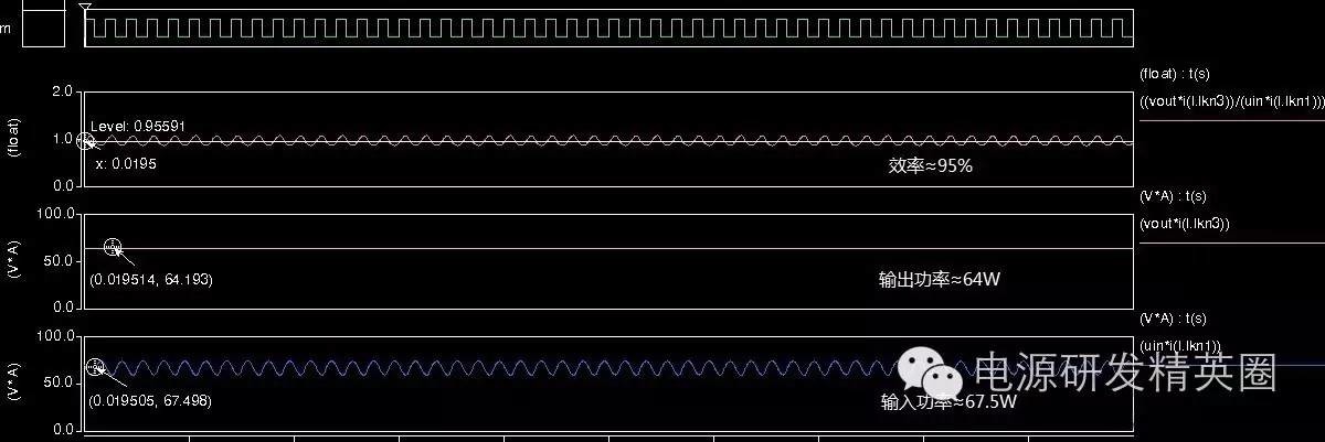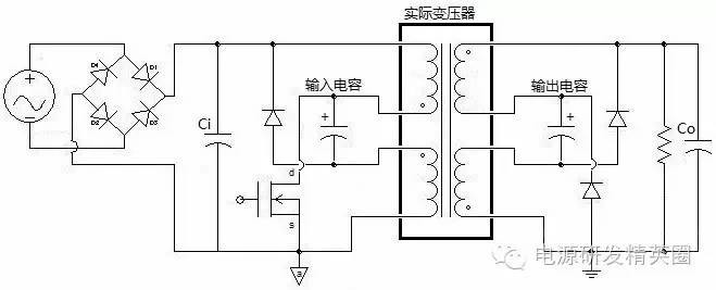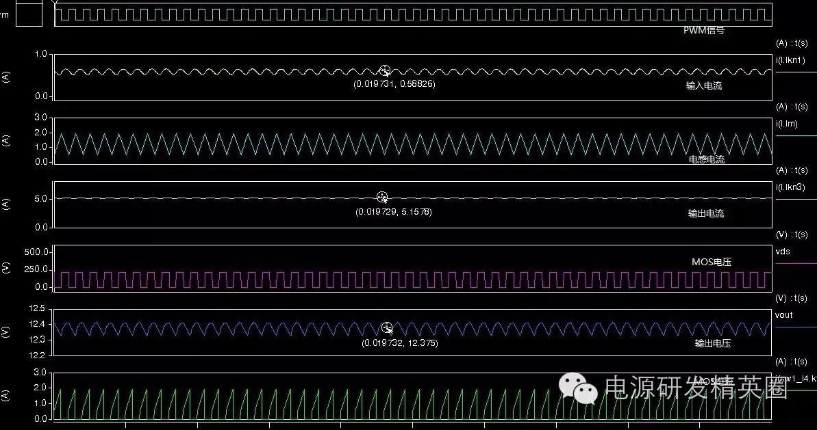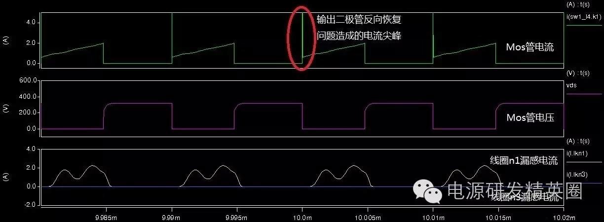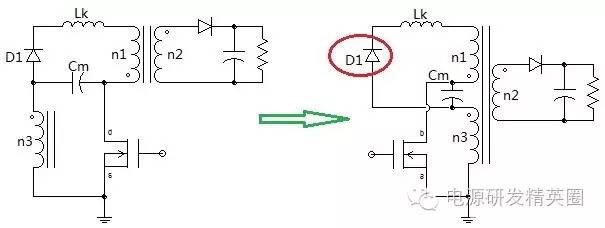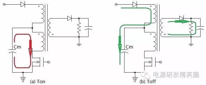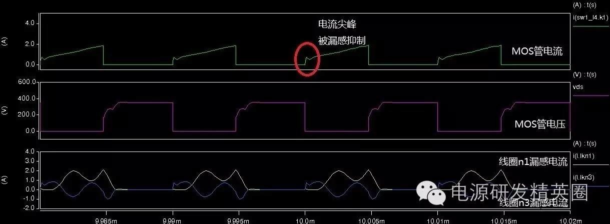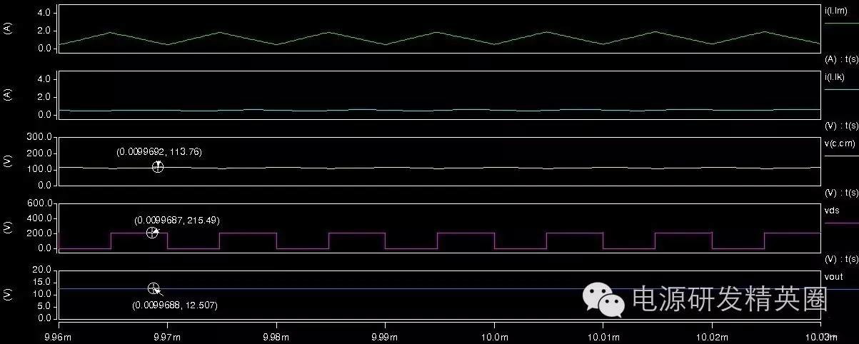 对于反激电路多数情况下是希望漏感越小越好,偶然发现一个电路可以将漏感的能量传递到次级同时还保持着反激电路简单、低成本的特性,并且通过略微调整可以得到几种不同的应用。对于软开关类的电路漏感又是有益的,一般漏感都是由工艺决定的,是否可以将漏感设计出来而非生产出来?如果能实现“零”漏感的变压器这个想法估计就可以实现。 这个电路的想法是源自于下面两种电路, ![]() 图1 无损吸收和一种电路 图1中(a)是无损吸收电路是将漏感的能量返回到输入端,这种电路如果参数不合适的话会有较大的无功损耗可能不适用于宽范围的场合。(b)电路是一个网友剖析的一个电路输出功率有1000多瓦,这个电路的缺点是输出功率全部需通过电容Cm来传递类似于Cuk、Speic类电路。综合电路(a)和(b)的特点就有了一个可以解决漏感问题的简单而又低成本的反激电路。 图1中(a)的后半部分加(b)的前半部分就构成了这种电路见下图 ![]() 图2 解决漏感问题的反激电路及等效电路 图2中的两个电路是一样的只是形式不同,如果去掉电容Cm电路的左侧就如同一个带去磁绕组的正激变压器初级侧,同样这里的线圈n1、n3也要采用双线并绕,如果两线圈耦合的好二极管D1是可以省掉的,如果耦合的不好就会产生图1中(a)的效果会有一部分无功损耗。 这个貌不惊人的电路其仿真结果却相当的理想,通过改变漏感Lk和电容Cm的参数还能得到几种不同的应用。限于水平也可能分析的不对,希望各位行家也能一起探讨下。 仿一个12V输出60W的反激电源,参数如下图 ![]() 图3 12V60W反激电路参数 假设初级线圈耦合的比较好可以去掉原D1二极管,因漏感和电容会发生震荡所以把D1串入到输入端只为方便观察波形。在有的应用中反而要加大这个LC震荡,比如QR模式的软开关。 输入为低压113V时的波形如下: 图3-1 漏感电流断续的反激波形在上图中漏感电流是断续的,电容Cm的最大电压200V左右,MOS管的Vds电压321V左右。 这个应用中电容Cm只是用来吸收漏感能量并在下个开关周期将漏感能量传递到次级,适当的增加Cm的容量会得到更好的效果。 ![]() 当电容Cm增大后对漏感的吸收也变强了,此时漏感可以设计的大一些,上图3-2中可以看到漏感的电流已经为连续模式了(可去掉二极管D1),漏感电流亦既输入电流,输入电流连续可以提升电源的性能如果用于功率因数校正可以实现连续模式的反激PFC功能。图中电容Cm的电压钳位在输入电压(113V)左右,MOS管的Vds电压215V左右为输入电压+反射电压(100V左右)之和,由此可推断在高压输入300V时MOS管的Vds电压为300+100=400V左右,MOS管可以选用低电压型号的,电容Cm容量大了成本也会高这个可能需要权衡一下。 先就自己的理解去分析下这个电路的原理,首先分析图3输入串二极管的电路。 ![]() 图4-1-1 开关导通时的工作模式及等效电路 图4-1-1中的(b)是开关导通时的等效电路,工作模式分两个阶段: 开关导通初期阶段,电容Cm上的电压高于输入电压所以先由Cm驱动电感Lm,当Cm的电压≤输入电压时这一阶段结束,电容Cm上只存储漏感的能量所以这一阶段时间很短。 开关导通后期阶段,漏感Lk和电感Lm串联由输入电压驱动同时电容Cm和电感Lm会发生轻微震荡(某些情况是靠这个震荡把漏感能量传递到次级)。 ![]() 图4-1-2 开关截止时的工作模式及等效电路 见图4-1-2中的(b)等效电路,在开关关断期间输入和输出可视为两个独立的电路,输入侧漏感Lk的能量被电容Cm吸收,输出侧电感Lm对负载释放能量。 由上面两个过程分析可知,在开关Toff期间电容Cm只存储漏感的能量,在开关Ton期间电容Cm只释放所存储的漏感能量并将其传递到输出侧,除此之外同普通的反激没什么区别。一般设计反激电路时会为漏感预设160V左右的余量,当用这个电路后这个160V可以忽略了(根据Cm的大小范围在0-160V之间)可用低耐压的MOS管同时漏感能量传递到次级整体效率会提升不少。 其次反激变压器在连续模式下其输出二极管有反向恢复问题,见下图 ![]() 反向恢复问题可等效的看作是在MOS管旁并联了一个大电容造成开启瞬间出现一个电流尖峰,根据反激开关电源的工作机理增大漏感可以抑制这个电流尖峰,见图4-2-2 ![]() 图4-2-2 漏感可抑制输出二极管反向恢复造成的电流尖峰 在以往情况下增加漏感意味着损耗增大效率降低,漏感小又有反向恢复问题效率也会降低只能折中选取一个漏感。当采用这种新拓扑的话问题就容易解决了,可以增大漏感又不影响效率。 在前面图2中初级线圈n1、n3是采用双线并绕,在这个应用中不采用并绕的方式或者是额外引入漏感使n1、n3线圈都寄生有漏感,电路如下 ![]() 图4-2-3 解决输出二极管反向恢复问题的电路 仿真结果如下: ![]() 图4-2-4 解决输出二极管恢复问题的仿真 从图4-2-4中可以看出增加的漏感Lkn3很好的抑制了电流尖峰,不过漏感Lkn3上的能量只能传递回电源形成无功功率,好在这部分能量不大无功损耗也就更小了。 有一篇叫做“反激变换器绕组钳位电路的设计与分析”的文章与这里的电路非常的相似 那个电路所具有的优点也是这个电路的优点,从而验证了之前的理论和仿真结果。不过这里的电路有着更优异的特点,见下面两个电路对比图 ![]() 图 4-2-5 那个电路与这个电路的对比 两个电路的区别就在于二极管的接法略有不同,图(b)这个电路能达到更高的效率而且可以实现软开关。 可能