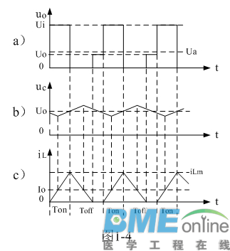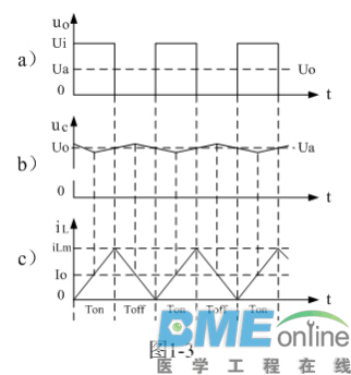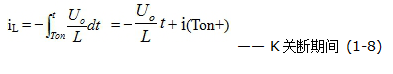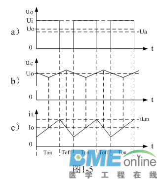 (连载02)串联式开关电源输出电压滤波电路 1-2-2.串联式开关电源输出电压滤波电路 大多数开关电源输出都是直流电压,因此,一般开关电源的输出电路都带有整流滤波电路。图1-2是带有整流滤波功能的串联式开关电源工作原理图。 ![]() 图1-2是在图1-1-a电路的基础上,增加了一个整流二极管和一个LC滤波电路。其中L是储能滤波电感,它的作用是在控制开关K接通期间Ton限制大电流通过,防止输入电压Ui直接加到负载R上,对负载R进行电压冲击,同时对流过电感的电流iL转化成磁能进行能量存储,然后在控制开关K关断期间Toff把磁能转化成电流iL继续向负载R提供能量输出;C是储能滤波电容,它的作用是在控制开关K接通期间Ton把流过储能电感L的部分电流转化成电荷进行存储,然后在控制开关K关断期间Toff把电荷转化成电流继续向负载R提供能量输出;D是整流二极管,主要功能是续流作用,故称它为续流二极管,其作用是在控制开关关断期间Toff,给储能滤波电感L释放能量提供电流通路。 在控制开关关断期间Toff,储能电感L将产生反电动势,流过储能电感L的电流iL由反电动势eL的正极流出,通过负载R,再经过续流二极管D的正极,然后从续流二极管D的负极流出,最后回到反电动势eL的负极。 对于图1-2,如果不看控制开关K和输入电压Ui,它是一个典型的反г 型滤波电路,它的作用是把脉动直流电压通过平滑滤波输出其平均值。 图1-3、图1-4、图1-5分别是控制开关K的占空比D等于0.5、 0.5时,图1-2电路中几个关键点的电压和电流波形。图1-3-a)、图1-4-a)、图1-5-a)分别为控制开关K输出电压uo的波形;图1-3-b)、图1-4-b)、图1-5-b)分别为储能滤波电容两端电压uc的波形;图1-3-c)、图1-4-c)、图1-5-c)分别为流过储能电感L电流iL的波形。 ![]() ![]() ![]() 在Ton期间,控制开关K接通,输入电压Ui通过控制开关K输出电压uo,然后加到储能滤波电感L和储能滤波电容C组成的滤波电路上,在此期间储能滤波电感L两端的电压eL为: eL = Ldi/dt = Ui – Uo K接通期间 (1-4) 式中:Ui输入电压,Uo为直流输出电压,即:电容两端的电压uc的平均值。在此顺便说明:由于电容两端的电压变化量ΔU相对于输出电压Uo来说非常小,为了简单,我们这里把Uo当成常量来处理。在某种情况下,如需要对电容的初次充、放电过程进行分析时,必须需要建立微分方程,并求解。因为输出电压Uo的建立需要一定的时间,精确计算得出的结果中一般 都含有指数函数项,当令时间变量等于无穷大时,即电路进入稳态时,再对相关参量取平均值,其结果就基本与(1-4)相等。对(1-4)式进行积分得: ![]() 式中i(0)为控制开关K转换瞬间(t = 0时刻),即:控制开关K刚接通瞬间流过电感L的电流,或称流过电感L的初始电流。 当控制开关K由接通期间Ton突然转换到关断期间Toff的瞬间,流过电感L的电流iL达到最大值:iLm =(Ui-Uo)Ton/L + i(0) K关断前瞬间 (1-6) 在Toff期间,控制开关K关断,储能电感L把磁能转化成电流iL,通过整流二极管D继续向负载R提供能量,在此期间储能滤波电感L两端的电压eL为: eL = Ldi/dt = – Uo K关断期间 (1-7) 式中–Uo前的负号,表示K关断期间电感产生电动势的方向与K接通期间电感产生电动势的方向正好相反。对(1-7)式进行积分得: ![]() 式中i(Ton+)为控制开关K从Ton转换到Toff的瞬间之前流过电感的电流,i(Ton+)也可以写为i(Toff-),即:控制开关K关断或接通瞬间,之前和之后流过电感L的电流相等。实际上(1-8)式中的i(Ton+)就是(1-6)式中的iLm,即: ![]() 上面计算都是假设输出电压Uo基本不变的情况得到的结果,在实际应用电路中也正好是这样,输出电压Uo的电压纹波非常小,只有输出电压的百分之几,工程计算中完全可以忽略不计。 从(1-4)式到(1-11)和图1-3、图1-4、图1-5中可以看出: 当开关电源工作于临界连续电流或连续电流状态时,在K接通和关断的整个周期内,储能电感L都有电流流出,但在K接通期间与K关断期间,流过储能电感L的电流的上升率(绝对值)一般是不一样的。在K接通期间,流过储能电感L的电流上升率为Ui-Uo/L: ;在K关断期间,流过储能电感L的电流上升率为: -Uo/L 因此: (1)当Ui = 2Uo时,即滤波输出电压Uo等于电源输入电压Ui的一半时,或控制开关K的占空比D为二分之一时,流过储能电感L的电流上升率,在K接通期间与K关断期间绝对值完全相等,即电感存储能量的速度与释放能量的速度完全相等。此时,(1-5)式中i(0)和(1-11)式中iLX均等于0。在这种情况下,流过储能电感L的电流iL为临界连续电流,且滤波输出电压Uo等于滤波输入电压uo的平均值Ua。参看图1-3。 (2)当Ui > 2Uo时,即:滤波输出电压Uo小于电源输入电压Ui的一半时,或控制开关K的占空比小于二分之一时:虽然在K接通期间,流过储能电感L的电流上升率(绝对值),大于,在K关断期间,流过储能电感L的电流上升率(绝对值);但由于(1-5)式中i(0)等于0,以及Ton小于Toff,此时,(1-11)式中的iLX会出现负值,即输出电压反过来要对电感充电,但由于整流二极管D的存在,这是不可能的,这表示流过储能电感L的电流提前过0,即有断流。在这种情况下,流过储能电感L的电流iL不是连续电流,开关电源工作于电流不连续状态,因此,输出电压Uo的纹波比较大,且滤波输出电压Uo小于滤波输入电压uo的平均值Ua。参看图1-4。 (3)当Ui < 2Uo时,即:滤波输出电压Uo大于电源输入电压Ui的一半时,或控制开关K的占空比大于二分之一时:在K接通期间,虽然流过储能电感L的电流上升率(绝对值),小于,在K关断期间,