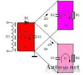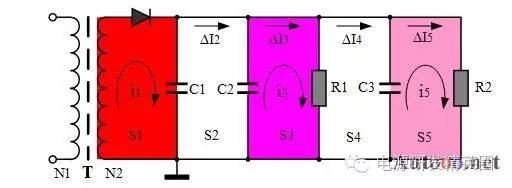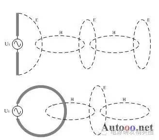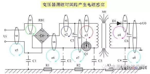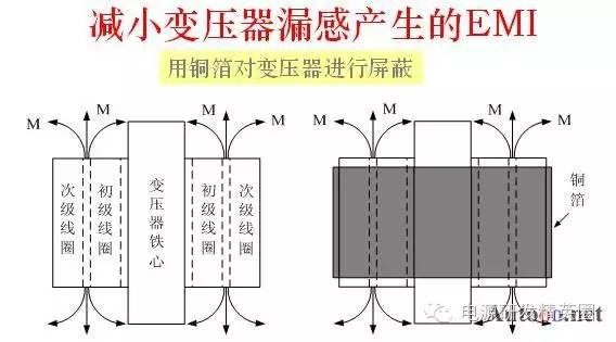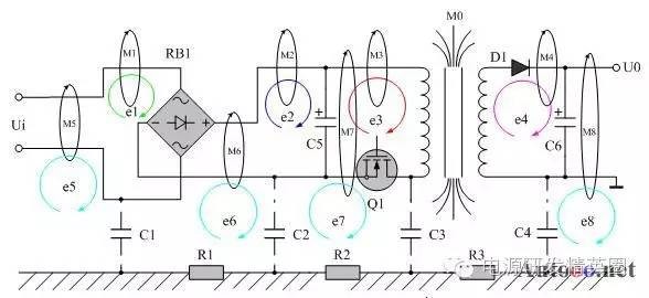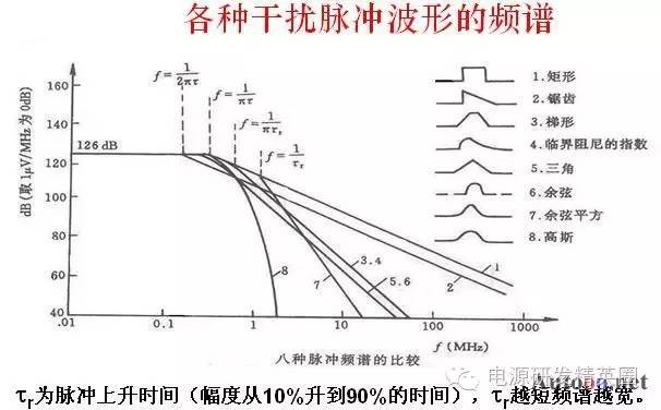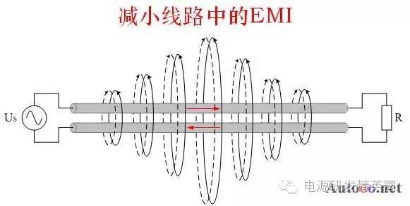 电磁干扰EMI中电子设备产生的干扰信号是通过导线或公共电源线进行传输,互相产生干扰称为传导干扰。传导干扰给不少电子工程师带来困惑,如何解决传导干扰?找对方法,你会发现,传导干扰其实很容易解决,只要增加电源输入电路中EMC滤波器的节数,并适当调整每节滤波器的参数,基本上都能满足要求,第七届电路保护与电磁兼容研讨会主办方总结八大对策,以解决对付传导干扰难题。对策一:尽量减少每个回路的有效面积 图1 传导干扰分差模干扰DI和共模干扰CI两种。先来看看传导干扰是怎么产生的。如图1所示,回路电流产生传导干扰。这里面有好几个回路电流,我们可以把每个回路都看成是一个感应线圈,或变压器线圈的初、次级,当某个回路中有电流流过时,另外一个回路中就会产生感应电动势,从而产生干扰。减少干扰的最有效方法就是尽量减少每个回路的有效面积。对策二:屏蔽、减小各电流回路面积及带电导体的面积和长度 如图2 所示,e1、e2、e3、e4为磁场对回路感应产生的差模干扰信号;e5、e6、e7、e8为磁场对地回路感应产生的共模干扰信号。共模信号的一端是整个线路板,另一端是大地。线路板中的公共端不能算为接地,不要把公共端与外壳相接,除非机壳接大地,否则,公共端与外壳相接,会增大辐射天线的有效面积,共模辐射干扰更严重。降低辐射干扰的方法,一个是屏蔽,另一个是减小各个电流回路的面积(磁场干扰),和带电导体的面积及长度(电场干扰)。对策三:对变压器进行磁屏蔽、尽量减少每个电流回路的有效面积 如图3所示,在所有电磁感应干扰之中,变压器漏感产生的干扰是最严重的。如果把变压器的漏感看成是变压器感应线圈的初级,则其它回路都可以看成是变压器的次级,因此,在变压器周围的回路中,都会被感应产生干扰信号。减少干扰的方法,一方面是对变压器进行磁屏蔽,另一方面是尽量减少每个电流回路的有效面积。对策四:用铜箔对变压器进行屏蔽 如图4所示,对变压器屏蔽,主要是减小变压器漏感磁通对周围电路产生电磁感应干扰,以及对外产生电磁辐射干扰。从原理上来说,非导磁材料对漏磁通是起不到直接屏蔽作用的,但铜箔是良导体,交变漏磁通穿过铜箔的时候会产生涡流,而涡流产生的磁场方向正好与漏磁通的方向相反,部分漏磁通就可以被抵消,因此,铜箔对磁通也可以起到很好的屏蔽作用。对策五:采用双线传输和阻抗匹配 图5如图5所示,两根相邻的导线,如果电流大小相等,电流方向相反,则它们产生的磁力线可以互相抵消。对于干扰比较严重或比较容易被干扰的电路,尽量采用双线传输信号,不要利用公共地来传输信号,公共地电流越小干扰越小。当导线的长度等于或大于四分之一波长时,传输信号的线路一定要考虑阻抗匹配,不匹配的传输线会产生驻波,并对周围电路产生很强的辐射干扰。对策六:减小电流回路的面积 图6如图6所示,磁场辐射干扰主要是流过高频电流回路产生的磁通窜到接收回路中产生的,因此,要尽量减小流过高频电流回路的面积和接收回路的面积。式中:e1、 Φ1、S1、B1分别为辐射电流回路中产生的电动势、磁通、面积、磁通密度; e2、 Φ2、S2、B2分别为辐射电流回路中产生的电动势、磁通、面积、磁通密度。 ![]() 图7下面以图7示意,对电流回路辐射进行详解。如图,S1为整流输出滤波回路,C1为储能滤波电容,i1为回路高频电流,此电流在所有的电流回路中最大,其产生的磁场干扰也最严重,应尽量减小S1的面积。在S2回路中,基本上没有高频回路电流,?I2主要是电源纹波电流,高频成分相对很小,所以S2的面积大小基本上不需要考虑。 C2为储能滤波电容,专门为负载R1提供能量,R1、R2不是单纯的负载电阻,而是高频电路负载,高频电流i3基本上靠C2提供,C2的位置相对来说非常重要,它的连接位置应该考虑使S3的面积最小,S3中还有一个?I3,它主要是电源纹波电流,也有少量高频电流成份。 在 S4回路中,基本上也没有高频回路电流,?I4主要为电源纹波电流,高频成分相对很小,所以S4的面积大小基本上也不需要考虑。 S5回路的情况基本上与S3回路相同,i5的电流回路面积也应要尽量的小。对策七:不要采用多个回路串联供电图 7中的几个电流回路,互相串联在一起进行供电,很容易产生电流共模干扰,特别是在高频放大电路中,会产生高频噪音。电流共模干扰的原因是: ?I2 = ?I3+ ?I4+ ?I5 图8而图8中各个电流回路,互相分开,采用并联供电,每个电流回路都是独立的,不会产生电流共模干扰。对策八:避免干扰信号在电路中产生谐振 图9如图9所示,共模天线的一极是整个线路板,另一极是连接电缆中的地线。要减小辐射干扰最有效的方法是对整个线路板进行屏蔽,并且外壳接地。电场辐射干扰的原因是高频信号对导体或引线进行充电,应该尽量减小导体的长度和表面积。磁场干扰的原因是在导体或回路中有高频电流流过,应该尽量减小线路板中电流回路的长度和面积。频率越高,电磁辐射干扰就越严重;当载流体的长度可以与信号的波长比拟时,干扰信号辐射将增强。当载流体的长度正好等于干扰信号四分之一波长的整数倍的时候,干扰信号会在电路中产生谐振,这时辐射干扰最强,这种情况应尽量避免。看到这里,是否觉得按此八步走,传导干扰尽在掌握之中?最后附上各种干扰脉冲波形的频谱供大家参考(如图10)。任何一个非正弦波都