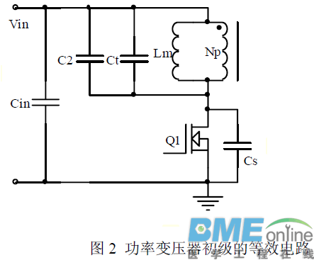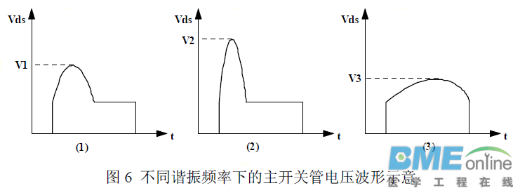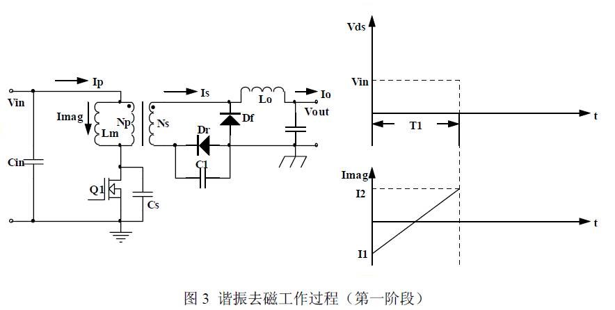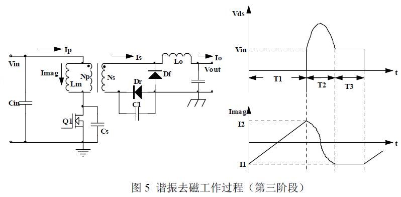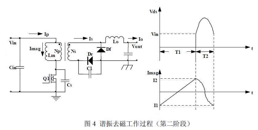 一 概述 单端正激型开关电源只使用一支功率开关管,整体电路结构比较简单,在中小功率输出的场合得到了广泛的应用。但这种拓扑结构形式的特点是功率变压器工作于B-H曲线的第一象限,变压器存在磁心饱和的潜在隐患,必须采用适当的去磁方法,将功率变压器在开关导通时存储的磁化能量在截止期间泻放或者消耗掉。否则,经过多个开关周期后,由于剩磁作用,变压器的工作点逐渐上移,极易由于磁心饱和而产生近似短路状态,导致功率开关管上流过较大的电流,超过其额定值而烧毁。 工程中常用的经典去磁方法包括增加去磁绕组、有源嵌位、R-C-D嵌位法、ZVT嵌位法等,其共同思路是:在主功率开关截止后,通过一定的途径,使变压器中剩余的磁化能量进行泻放或者消耗在无源功率电阻上。 实际上,由于目前的开关电源普遍采用MOSFET作为功率开关,因此仅利用其分布参数也能够较好的完成去磁工作,即采用谐振技术进行去磁。谐振去磁的基本原理为:在功率开关截止后,利用变压器的自感和电路中元器件的分布电容进行谐振,将变压器的磁化能量进行转移。这样,省去了相对复杂的去磁设计,使得电路结构得到简化。 二 谐振去磁的工作原理在分析利用谐振技术进行变压器去磁的工作原理之前,首先作出以下假设: (1)整个系统处于动态平衡的稳定状态。 (2)输出电感LO与输出电容CO与参与谐振的分布元件相比,近似为无穷大。 (3)变压器的漏感可以忽略不计。 (4)开关管与二极管均为理想器件,即开关管导通电阻和二极管的正向压降均可以近似认为是0。 (5)与开关周期和谐振工作时间相比,开关器件的过渡时间很短。 对于一个单端正激型电源,与该谐振去磁方法相关的基本电路元件分布位置如图1所示: ![]() 其中,Lm为变压器初级线圈的等效电感;Ct为功率变压器初级绕组的等效电容,与Lm为并联关系;Cs为开关管Q1的漏-源极结电容和为改善其开关环境而并联的外电容之和;C1为输出整流二极管的结电容。 图2为这些元器件等效到变压器初级的示意图。由图中可以看到,Dr的结电容C1等效到变压器初级的电容C2为: ![]() 且它与Ct为并联关系。同时,假定输入电压源Vin为理想电压源,其内阻可以忽略不计,因此在交流谐振状态时,Cs也与Ct呈并联关系。 ![]() 在一个完整的开关周期内,谐振去磁的整个工作过程由以下几个阶段组成: ![]() 第一阶段:图3中的T1阶段。在此之前, Q1处于截止状态,其漏-源极上的电压为输入电压Vin, Df续流导通,流过变压器磁心的磁化电流为负值I1(其大小与方向在后面进一步解释)。从t=0开始,Q1受控导通,主功率变压器磁心的磁化电流Imag为线性变化,由负值逐渐变为0,又开始正向增加。在这一阶段,由于极性关系,Dr导通,Df截止。而C1和Cs的端电压均近似为0,能量由输入端通过变压器耦合至输出负载。假定变压器初级磁化电流在该阶段开始时为I1,结束时为I2,则I1与I2的关系为: ![]() ![]() 第二阶段:图4中的T2阶段。在此阶段的开始,Q1受控制信号的作用截止,其漏-源极电压Vds开始迅速上升。当Vds超过输入电压Vin之后,变压器次级线圈的极性反转,Dr相应截止,Df导通。由于Q1的截止,变压器初级电感Lm与电路中的等效电容Cr(C2、Ct、Cs之和)形成一个并联谐振电路,开始谐振工作,去磁电流Imag开始以正弦形状变化并流过谐振电路。由电路理论可以得知,一个L-C并联电路以谐振方式工作时,电感上的电流与电容上的电压均为正弦形变化,且彼此相位相差90度,参与谐振的电感和电容所存储的能量互相交换。由于Cr在前一阶段的端电压为0,没有存储能量,而Lm中的能量在开关截止前达到了最大值,因此Lm与Cr产生能量交换;该阶段的持续时间为T2,且T2为一个完整谐振周期的一半。 ![]() Cr上的电压由0所能够达到的最大值为: ![]() 而Q1漏-源极电压Vds在Cr达到最大值时,也达到最大值: ![]() 这样,到了该阶段的末期,激磁电流Imag达到负向的最大值。由于系统处于稳定的动态平衡状态,且能够完全去磁,因此其值等于-I2。此时, Q1漏-源极电压Vds等于输入电压Vin。 这一阶段的等效电容Cr为: ![]() 谐振频率为: ![]() 由初始条件,可以得到磁化电流与等效电容电压的变化分别为: ![]() ![]() 在上述两个阶段,变压器中磁场强度H的变化与磁化电流Imag的变化相一致:当T1阶段,H向正方向增加;而在接下来的T2阶段,由于谐振作用,H向反方向变化。这样,通过谐振使变压器的激磁能量进行了转移,并且最终实现了磁化电流的反向流动,从而达到了去磁的目的。 ![]() 第三阶段:图5中的T3阶段。在此时间段内, Q1仍然保持截止状态,由于前一阶段Cr上的电压谐振地变化为0,因此Q1两端的电压为Vin。当Cr上的电压企图继续谐振,进一步降低时,就导致Dr导通。因此,该时间段开始时,Np与Ns的端电压均为0,Cr的端电压被嵌位为0,谐振结束,此时与Q1并联的Cs两端没有变化的交流电压,只有稳定的直流电压Vin。Dr与Df均可以看作是处于“导通”状态。而负向的磁化电流由于只有Df-Dr-Ns这样一条通路可以继续流动,且磁化电流I1在这一阶段保持恒定的负值I1不变,这种工作模式一直持续到下一个开关周期的到来。在系统处于稳定工作状态时,且保证每个开关周期都能够完全进行去磁的条件下,磁化电流I1也等于下一个开关周期开始时的I1,即: ![]() 如果电路的谐振频率恰好等于开关管截止的时间,则Ts的持续时间为0。而如果谐振周期大于Tr,可能会出现I1与I2