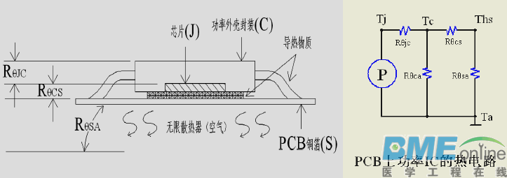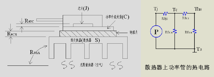 本篇文章主要介绍的内容如下 ●开关电源热分析与计算的意义 ●热设计的目标 ●热路与温度的计算 ●散热方式分析与选择 ●散热设计的一般原则与步骤 ●热设计仿真介绍 ●总结 开关电源热分析与计算的意义●高效率,高集成度,高功率密度是电源发展的重要方向,然而对于电源设计人员而言,功率器件跟整个电源系统的热设计,依然是非常有挑战性的工作。 如:一台输出700W的全砖模块电源,即使转换效率高达95%,然而依然有近37W的发热量需要处理,如果不仔细分析计算,将会影响整个系统的MTBF与可靠性,严重时甚至可能烧毁功率器件。 ●高温对电源的影响: 绝缘性能退化;元器件损坏;材料的热老化;低熔点焊缝开裂、焊点脱落; 器件之间的机械应力增大; ●对开关电源的热分析与计算的积极意义: 能精确计算元器件的温升,为电源寿命计算提供依据通过对系统的整体温升分析与计算,为器件的选型与降额设计提供依据通过对元器件热分析与计算,为散热方式与散热器件的选择提供依据能有效控制整体温升,降低元器件的早期失效率,大大提升可靠性 热设计的目标●确保任何的元器件不超过它的最大工作节温 也就是说如何的控制元器件的发热量,如果元器件的发热量得不到有效控制,那么元器件将在几分钟甚至更短的时间里失效。 一般而言,温度升高电阻阻值降低;高温会降低电容器的使用寿命;高温会使变压器、扼流圈绝缘材料的性能下降;晶体三极管的电流放大倍数加大;MOSFET的漏源导通电阻增大。 方法: a、优选控制方式:软开关技术(QR,LLC,有源钳位),移相控制技术,同步整流 b、选用低功耗的器件:CoolMOS,SiC diode,高磁导率的磁性材料等 c、根据应用的场合,做好元器件的降额设计 结温的推荐值: 根据标准,任何情况下器件的结温不要超出以下值: 民用等级:Tjmax≤150℃ 工业等级:Tjmax≤135℃ 军用等级:Tjmax≤125℃ 航天等级:Tjmax≤105℃ ●在给定有限的空间和重量条件下,尽量可能保持元器件良好的散热,使其在所处的工作环境条件下,不超过标准及规范所规定的最高温度。 这个目标就是提升系统的长期寿命跟可靠性。 有统计资料表明,电子元器件温度每升高2℃,可靠性下降10%元器件温升为50℃时的寿命只有温升为25℃时的1/6。而温升每超过10℃,电解电容的寿命就要下降一半。 方法: a、优化PCB上元器件的布局,Layout b、根据系统要求,选用合适的散热方式:传导,辐射,对流 c、选用更好的散热器件加强散热:涂硅脂,导热硅胶垫,散热片氧化发黑 温升的推荐值: 任何情况下,器件与整个电源内部环境以及外壳的温升不要超出60℃ 即 Δ T ≤ 60℃ 热路与温度的计算●热路实际上是欧姆定律的一个变形,可以与电路等效,在进行热路的分析与计算式,可以参照电路,建立热路模型进行计算。 ![]() 几个概念: 热阻: 电子器件耗散的热流在传输过程中(通过一定的介质)所遇到的阻力,是反映阻止热量传递的能力的综合参量。 用Rθ 表示,单位是℃/W;其特性跟电阻类似,与介质材料的热导率,体积,密度,结构,表面积大小,颜色,几何尺寸与冷却条件等因素有关在热平衡之前,热阻是时间的函数(热抗),但热稳定之后,热阻跟时间无关 Rθ = Δ T/ PD 其中 Rθ 是介质之间的热阻 Δ T是介质之间的温度差 PD是耗散的功率 ●普通穿孔插件型封装器件的典型热阻 ●表面贴片型封装器件的典型热阻热流: 也称为热流密度或热流量,指两种介质由于温度的差异而形成的热量传递。用Q表示,单位是J/s(W),其特性类似于电流,总是从温度高的介质传递到温度低的介质,其大小正比于热阻 即 Q ∝ (Δ T/Rθ ) 注:固态散热器的热流是线性,而液态与气态散热的热流是非线性的 热容量: 是指一定质量的某种物质升高一定温度所需的热量,用C表示,单位为J/K,跟物质本身的比热容有关 比热容 CT=△E/(m △T) △E为吸收的热量;m是物体的质量;△T是吸热(放热)后温度所上升(下降)的值 热容量 C = CT*m= △E/△T ●功率管与等效热电路模型![]() 因为Rθ ca的值很大,对整个热电路的分析影响很小,故可以忽略 Rθ ja ≈ Rθ jc + Rθ cs + Rθ sa ●贴片IC与等效热电路模型 ![]() 因为Rθ ca的值很大,对整个热电路的分析影响很小,故可以忽略 Rθ ja ≈ Rθ jc + Rθ cs + Rθ sa ●径向引线二极管与等效热电路模型 ![]() 因为Rθ La的值很大,对整个热电路的分析影响很小,故可以忽略 Rθ ja ≈ Rθ jL + Rθ Ls + Rθ sa ●结温的计算: 从以上几个热电路可以看出,结温等于热路中温升之和再加上环境温度。 即 Tjmax=PD*(Rθjc+Rθcs+Rθsa)+Ta 例: 某大功率工业电源的PFC电路,经计算IGBT的损耗为15W,升压二极管损耗为17W,两管同时装在一个散热器上;IGBT芯片到外壳的热阻为0.85℃/W,升压二极管到外壳的热阻为1.9℃/W,绝缘矽胶片与散热膏的总热阻为0.7℃/W,散热器的热阻为1.3℃/W;环境温度为60℃,求IGBT与二极管芯片的结温。 解:根据题意可以画出等效热电路(略) 对于IGBT,有 Tjmax1=(15+17)*1.3+(0.85+0.7)*15+60 =41.6+23.25+60 =124.85 ℃ 对于Diode,有 Tjmax2=(15+17)*1.3+(1.9+0.7)*17+60 =41.6+44.2+60 =145.8 ℃ ●散热片的计算: a:散热片的尺寸:可以求出散热片的热阻,再根据厂商提供的散热片参数选择合适的散热片。 即 Rθsa=(Tjmax-Ta)/PD-(Rθjc+Rθcs) 例: 某军工电源,现经计算主功率MOSFET IRFP460的总损耗为7.6W, 装在散热器上自然冷却;经查手册, Rθjc为0.45℃/W,Rθcs为0.24℃/W,绝缘矽胶片与散热膏的总热阻为0.7℃/W,当环境温度