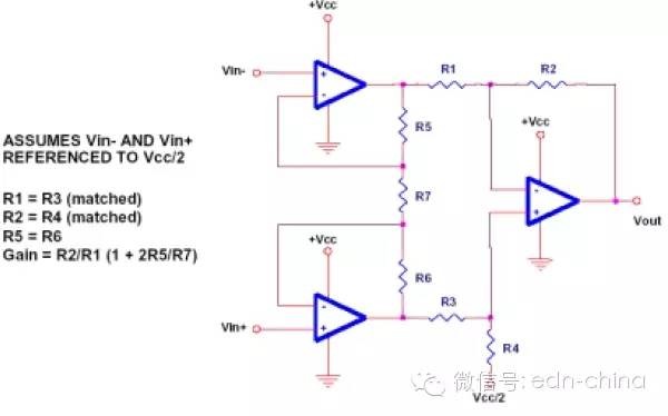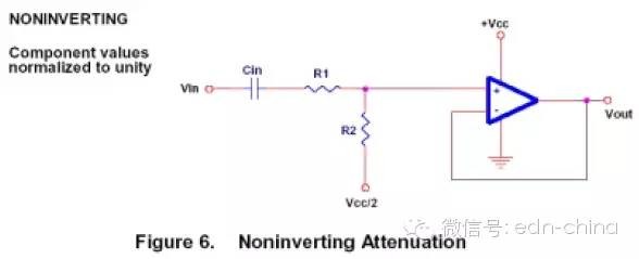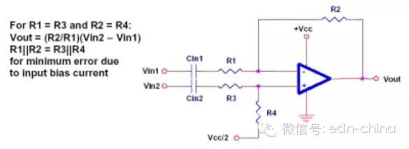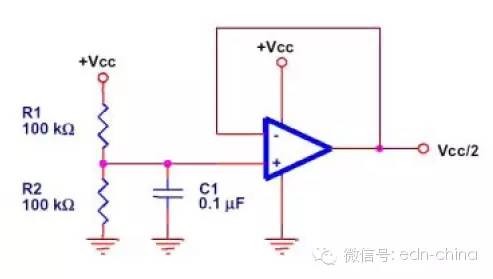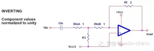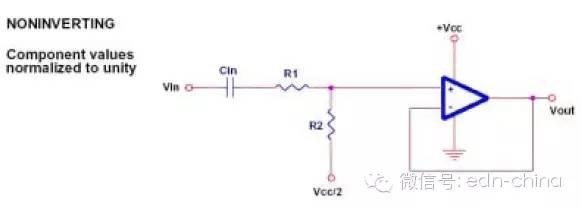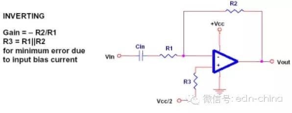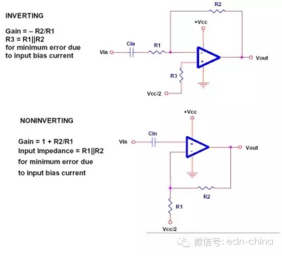 我们经常看到很多非常经典的运算放大器应用图集,但是这些应用都建立在双电源的基础上,很多时候,电路的设计者必须用单电源供电,但是他们不知道该如何将双电源的电路转换成单电源电路。 在设计单电源电路时需要比双电源电路更加小心,设计者必须要完全理解这篇文章中所述的内容。单电源应用图集如下: 1.1 电源供电和单电源供电 所有的运算放大器都有两个电源引脚,一般在资料中,它们的标识是VCC+和VCC-,但是有些时候它们的标识是VCC+和GND。这是因为有些数据手册的作者企图将这种标识的差异作为单电源运放和双电源运放的区别。但是,这并不是说他们就一定要那样使用――他们可能可以工作在其他的电压下。在运放不是按默认电压供电的时候,需要参考运放的数据手册,特别是绝对最大供电电压和电压摆动说明。 绝大多数的模拟电路设计者都知道怎么在双电源电压的条件下使用运算放大器,比如图一左边的那个电路,一个双电源是由一个正电源和一个相等电压的负电源组成。一般是正负15V,正负12V和正负5V也是经常使用的。输入电压和输出电压都是参考地给出的,还包括正负电压的摆动幅度极限Vom以及最大输出摆幅。 单电源供电的电路(图一中右)运放的电源脚连接到正电源和地。正电源引脚接到VCC+,地或者VCC-引脚连接到GND。将正电压分成一半后的电压作为虚地接到运放的输入引脚上,这时运放的输出电压也是该虚地电压,运放的输出电压以虚地为中心,摆幅在Vom 之内。有一些新的运放有两个不同的最高输出电压和最低输出电压。这种运放的数据手册中会特别分别指明Voh 和Vol 。需要特别注意的是有不少的设计者会很随意的用虚地来参考输入电压和输出电压,但在大部分应用中,输入和输出是参考电源地的,所以设计者必须在输入和输出的地方加入隔直电容,用来隔离虚地和地之间的直流电压。(参见1.3节) ![]() 图一 通常单电源供电的电压一般是5V,这时运放的输出电压摆幅会更低。另外现在运放的供电电压也可以是3V 也或者会更低。出于这个原因在单电源供电的电路中使用的运放基本上都是Rail-To-Rail 的运放,这样就消除了丢失的动态范围。需要特别指出的是输入和输出不一定都能够承受Rail-To-Rail 的电压。虽然器件被指明是轨至轨(Rail-To-Rail)的,如果运放的输出或者输入不支持轨至轨,接近输入或者接近输出电压极限的电压可能会使运放的功能退化,所以需要仔细的参考数据手册是否输入和输出是否都是轨至轨。这样才能保证系统的功能不会退化,这是设计者的义务。 1. 2 虚地 单电源工作的运放需要外部提供一个虚地,通常情况下,这个电压是VCC/2,图二的电路可以用来产生VCC/2的电压,但是他会降低系统的低频特性。 ![]() 图二 R1 和R2 是等值的,通过电源允许的消耗和允许的噪声来选择,电容C1 是一个低通滤波器,用来减少从电源上传来的噪声。在有些应用中可以忽略缓冲运放。 在下文中,有一些电路的虚地必须要由两个电阻产生,但是其实这并不是完美的方法。在这些例子中,电阻值都大于100K,当这种情况发生时,电路图中均有注明。 1. 3 交流耦合 虚地是大于电源地的直流电平,这是一个小的、局部的地电平,这样就产生了一个电势问题:输入和输出电压一般都是参考电源地的,如果直接将信号源的输出接到运放的输入端,这将会产生不可接受的直流偏移。如果发生这样的事情,运放将不能正确的响应输入电压,因为这将使信号超出运放允许的输入或者输出范围。 解决这个问题的方法将信号源和运放之间用交流耦合。使用这种方法,输入和输出器件就都可以参考系统地,并且运放电路可以参考虚地。当不止一个运放被使用时,如果碰到以下条件级间的耦合电容就不是一定要使用:第一级运放的参考地是虚地 第二级运放的参考第也是虚地 这两级运放的每一级都没有增益。任何直流偏置在任何一级中都将被乘以增益,并且可能使得电路超出它的正常工作电压范围。 如果有任何疑问,装配一台有耦合电容的原型,然后每次取走其中的一个,观察电工作是否正常。除非输入和输出都是参考虚地的,否则这里就必须要有耦合电容来隔离信号源和运放输入以及运放输出和负载。一个好的解决办法是断开输入和输出,然后在所有运放的两个输入脚和运放的输出脚上检查直流电压。所有的电压都必须非常接近虚地的电压,如果不是,前级的输出就就必须要用电容做隔离。(或者电路有问题) 1. 4 组合运放电路 在一些应用中,组合运放可以用来节省成本和板上的空间,但是不可避免的引起相互之间的耦合,可以影响到滤波、直流偏置、噪声和其他电路特性。设计者通常从独立的功能原型开始设计,比如放大、直流偏置、滤波等等。在对每个单元模块进行校验后将他们联合起来。除非特别说明,否则本文中的所有滤波器单元的增益都是1。 1. 5 选择电阻和电容的值 每一个刚开始做模拟设计的人都想知道如何选择元件的参数。电阻是应该用1 欧的还是应该用1 兆欧的?一般的来说普通的应用中阻值在K 欧级到100K 欧级是比较合适的。高速的应用中阻值在100 欧级到1K 欧级,但他们会增大电源的消耗。便携设计中阻值在1 兆级到10 兆欧级,但是他们将增大系统的噪声。用来选择调整电路参数的电阻电容值的基本方程在每张图中都已经给出。如果做滤波器,电阻的精