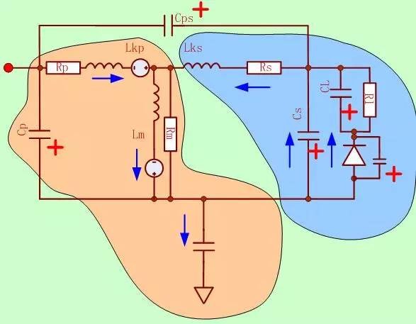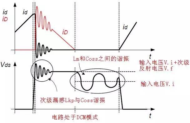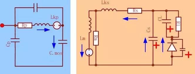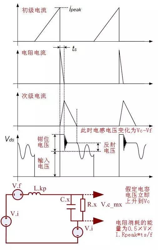 功率变压器模型 在分析Flyback电路之前,我觉得有必要把变压器模型做一个总结,因为我们对变压器的分析其实是在一定的模型上面进行分析的。这里阐述我的一个观点, 如果说实际测试和实验是非常重要的话,对分析对象有一个清晰的模型概念对电子工程师来说是非常必要的,建立的模型的目的完全是为了可以简化问题。当然建立 了模型进行分析,可能和实际的测试结果有出入,每一个对象的实际总有偏差,但大规模生产有个前提就是需要控制对象的参数分布在一定范围内。 功率变压器在电源中起着能量变换和能量传送的作用(联接信号源与负载的中介)。一般的变压器模型是一个双端口网络,在大部分仿真软件中的模型如下: ![]() 不过因为双端口模型不利于我们的分析,我们一般不直接使用这种模型。(当然软件中大部分都是这么分析)这种模型忽略了漏磁电感和激磁电抗,需要进行改进才能得出比较精确的结果。 我们也可以将变压器与负载分开(独立的器件), 变压器则等效成为附加一定电抗的电感器, 次边电磁参数以一定变换归一化到原边进行处理, 可看成一个单口网络进行等效, 从而使模型得以简化。最简单的模型如下: ![]() 图中各个参数为:C:端口分布电容Rc:线圈交流电阻Rm:磁心损耗电阻Ls:线圈漏感Lm:磁心磁化电感RL’:负载折合到原边的等效电阻主要缺点有两个: 1)I.c=I.m+I.lm+I.l,变压器的铜损(线圈电阻损耗)与铁损(磁芯损耗)是相关的,很难成为独立的两个参量。 2)当开关通断的频率比较高时,不同绕组间的电容效应已较为明显, 次边绕组的铜损折合至原边的等效阻抗已经能够明显的影响变压器的响应。 如果各位对上面的模型不太清楚,以下这张图能够比较清晰的反应变压器线圈的分布参数: 我们可以建立了一个绕组的模型,端口电容也可以认为是绕组的分布电容(匝间电容和层间电容),分布电容经过叠加折算得:绕组的等效并联电容C′= Ci/ ( N - 1) ( N > 1)Φm为主磁通(产生感应电动势)对应磁芯磁化电感Lm,Φc为漏磁通对应线圈漏感 ![]() 第一个改进型模型: ![]() Cp:端口并联等效分布电容(初级线圈)Rp:端口并联等效介质损耗电阻(次级线圈)Cs:初级和次级绕组间等效耦合电容Rs:初级和次级绕组间等效介质漏Ls:线圈漏电感,分为Lse和LsmLm:励磁电感,分为Lma和LmlRm:磁心损耗等效电阻Rcp:原边绕组的等效电阻Rce:次边绕组的等效电阻RL:折算到原边的负载等效电阻模型主要特点: 流过Rce的电流I.Rce ,流过Rcp的电流I.Rcp ,流过Rm的电流I.Rm 相互独立, 模型使源边副边的铜损与磁芯损耗(铁损)不再相关。不过个人认为下面这个模型更好理解一些: ![]() Cps为初级和次级绕组之间的电容Lkp:初级绕的漏感Cp:初级绕组的寄生电容(分布电容)Rp:初级绕组的线圈电阻Lks:次级绕的漏感Cs:次级绕组的寄生电容(分布电容)Rs:次级绕组的线圈电阻Lm:变压器励磁电感Rm:磁芯损耗的电阻RL:折算到原边的负载等效电阻CL:折算到原边的负载等效电容这个模型可能好理解一些,不过我们分析的时候可以从这些模型开始参照,或者说分析的时候通过某些参数的变化来分析整个趋势。 反激式电源的开关过程分析 关于这个论题很多人已经给出了它们的分析,不过呢寥寥几句有时候带给人更多的是疑惑和迷茫。参考了一些论文和分析,把我个人对这个问题的分析表述出来,可 能和设计的分析会有一些误差,不过提出一个大家看得懂的问题总是比努力去看懂一些生涩的文字要好些(这里说明一点,做的分析和示意可能并不是对的)。 ![]() 我们分析的主要问题还是在Q1管子在关断过程中的响应,至于设计电路减小这个响应的影响,方法有很多,个人以为就取值和影响合在一起做一个小专题。 在关断过程中,如果不考虑加入抑制暂态过程的电路,我们看到的波形将不会是理想的,如下图所示: ![]() 把上面的功率变压器模型改进模型2带入其中分析: ![]() Mos管关断前的稳态分析: 励磁电感和漏电感中均储存能量,同时由于二极管的结电容存在,次级电容上都存在一定的电压,次级漏感中无电流。 ![]() 然后我们把Mos管关掉,看下图: ![]() 我们来吧上面的过程整理一下: 1.MOS管关断后,初级电流(励磁电感和初级漏电感和电源的综合作用)给MOS输 出电容充电,初级电容,初次级之间电容,次级电容,次级二极管电容,负载电容则开始放电(你可以这样理解,因为压差小了,电容放电,也可以理解为反向充 电),Mos管DS端电压是上升的(这里可以认为是上面所涉及的分布参数之间的谐振,这个电路的Q之很小的),此时的电压可以认为是线性上升的。注意此时的次级的二极管是没有导通的,因为DS端电压比较小。 2.当DS端电压上升,次级的电压达到输出电压(这是客观存在的,因为我们要保证输出电压的稳定)+整流管的电压后,如果没有次级漏感,次级回路就导通了,因此DS端电压会继续上升,当克服了次级漏感的影响后,次级电流开始上升,在这个时候励磁电感的能量由于有更小的阻抗通路,从初级来看,初级电流会减小。 ![]() 3.这个时候起决定性作用的就变成了初级漏感,它不能耦合到次级上没有小的阻抗通路,因此初级漏电感就和Mos管输出电容之间和初级电容之间谐振,电压形成几个震荡(如果没有吸收和clamped电路这个过程会持续很久)。 初级漏感电流是初级电流的一部分,因此伴随着初级漏感电流的下降的是次级电流的上升,如果没有clamped电路,电流的下