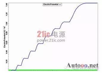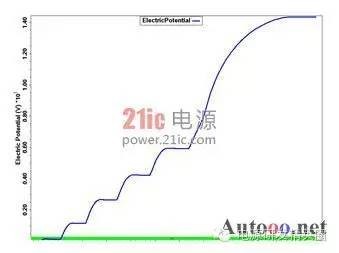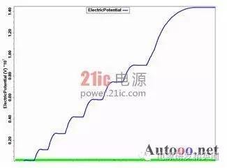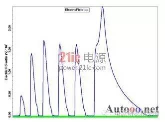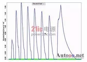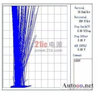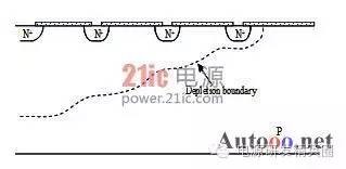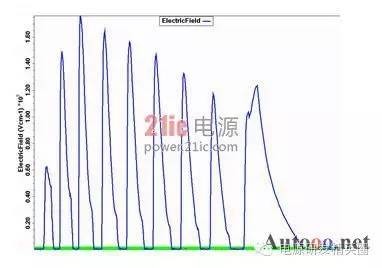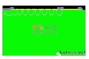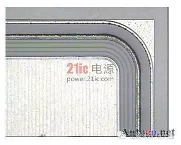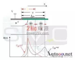 快恢复二极管(简称FRD)是一种具有开关特性好、反向恢复时间短的半导体二极管,主要应用于开关电源、PWM脉宽调制器、变频器等电子电路中,作为高频整流二极管、续流二极管或阻尼二极管使用。击穿电压是最重要得参数之一,它和最大电流容量一起决定了电力电子器件的额定功率,其中功率FRD通常是通过大面积PN结保证实现大电流。但是对于高压工作的FRD来说,平面工艺不可避免的存在着结面弯曲效应而影响击穿电压,使得器件实际击穿电压只有理想情况的10%-30%。因此为了保证FRD能工作在高电压下,就需要使用结终端技术来消除结面弯曲带来的影响,提高FRD器件的耐压。在提高耐压采用终端技术的同时,还要兼顾到其它特性的影响和优化。如本文后面将要提到的,在采用金属场板终端提高耐压的同时,还要防止圆片打火问题的发生。 1场限环的基本结构 图1:场限环结构示意图 ![]() 图2:多个场限环结构示意图 ![]() 场限环的基本结构见图1,图2.。就是在被保护的主结周围间隔一定距离,扩散形成一定大小的同心环。扩散环改变了主结边缘空间电荷分布,减轻了电场集中效应。提高了耐压。单环的作用有限,一般在高压下需要通过多个环来达到预定的电压。 2 场板的基本结构分析 图3:场板结构示意图 ![]() 场板的基本结构见图3,也是常用的提高耐压的方法之一。场板下除边缘部分外,电场分布是一维的,类似于MOS电容。击穿时的击穿电压为击穿时半导体的电压和氧化层的压降之和。在场版的边缘,电力线集中。如果场板长度比内部耗尽层还大,N+P结的场板有电力线从板向半导体发出,在半导体表面有电力线进入,这等效于半导体表面有正电荷,他对电场的影响可看做是无穷大的半导体中间增加了一层电荷,这些正电荷产生垂直于表面的场外,也将产生平行于表面的场,每一正电荷在其左边产生指向左的场,在其右边产生指向右的场。所以在场版下面的多数区域,正电荷产生的横向电场是互相削弱。然而在场板的边缘,所有正电荷产生的横向场是互相加强的,结果在那里造成一个横向场的峰值。如果场板很短或者无场板时,在PN结的边缘就有很强的电场,场板上所有正电荷都是使这点电场减少的,因此场板愈长,电场峰值愈小。 3 气隙的击穿特性 我们知道,影响空气间隙放电电压的因素有很多。主要有电场的情况,比如均匀与不均匀;电压的形式,比如直流,交流还是雷电冲击;大气的条件,比如温度,湿度,气压等。较均匀电场气隙的击穿电压与电压极性无关,直流,工频击穿电压(峰值)以及50%冲击击穿电压都相同,分散性很小。 ![]() 当S不过于小时(S>1cm), 均匀空气中的电场强度大致等于30KV/cm。稍不均匀的电场气隙的击穿电压,可以看作球与球之间,球与板之间,圆柱与棒之间,同轴圆柱的间隙之间的击穿。它的特点是不能形成稳定的电晕放电,电场不对称时,有极性效应,不很明显,直流,工频下的击穿电压以及50%冲击击穿电压相同,分散性不大,击穿电压和电场均匀程度关系极大,电场越均匀,同样间隙距离下的击穿电压就越高。直流电压下的击穿电压具有极性效应,棒棒电极间的击穿电压介于极性不同的棒板电极之间,平均击穿场强正棒和负板间约4.5KV/cm,负棒和正板间约10KV/cm,棒和棒之间约4.8-5KV/cm。击穿电压与间隙距离接近正比,在一定范围内,击穿电压与间隙距离呈线性关系。球与球间隙之间存在邻近效应,对电场会有畸变作用,使间隙电场分布不对称,同一距离下,球直径越大,击穿电压也越高。 图4 击穿电压与间隙距离的关系 ![]() 4 实验过程 4.1失效现象与分析 FRD在开发过程中工程批流片出来后测试击穿电压,当电压加到几百伏时,可开始看到有严重的打火现象,测试打火曲线如图5,打火发生后,圆片上可看到终端外围两个金属铝条有明显发黑的迹象,如图6。 图5 FRD 圆片击穿电压测试曲线 ![]() 图6 FRD 圆片打火位置图片 ![]() 其中距离cell区较近的金属是终端的一个金属场板,在最外围的一个是截止环的金属。从失效现象来看,打火应该是最外围的两个金属之间进行的。工艺上,当初为了节省成本,金属完成后没有加钝化层次,因此两个金属之间是没有氧化等介质的。检查版上数据,金属场板到截止环金属之间距离为72um,怀疑可能此距离太小,又没有介质,因此导致金属之间电场过强,引起打火,为了验证,特对原结构进行了模拟。 4.2原结构模拟结果 如图7所示原始结构进行模拟,结果击穿电压约1500V,最外围的金属场板与最外围截止环金属之间电势差约800V,最外围场板承担了较大的电压,从表面电场分布看,最外围金属场板处表面电场最强,约2.6E5V/cm,前面其它环的电场基本在1.6E5V/cm左右,金属场板处电场较集中。而空气的击穿场强约为30KV/cm,金属场环和截止环之间距离为72um,空气耐压约220V,据此推断失效的原因应该是金属之间距离较近,电压较大引起空气击穿,从而发生打火现象。 图7:FRD 原版结构 ![]() 图8 FRD原版模拟结果电势分布图 ![]() 图9 FRD原版模拟结果表面电场分布图 ![]() 4.3 新设计模拟 由以上分析认为,圆片测试打火的主要原因在金属场板和截止环金属之间电势较大,引起金属间打火,下一步主要从考虑降低两者之间的电势,减小金属场板处的表面电场出发,进行了以下模拟。 4.3.1增加两个环 考虑在金属场板前再增加两个场限环,使得前面的分压增加,以减少金属之间的电势差,模拟结