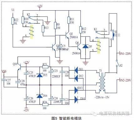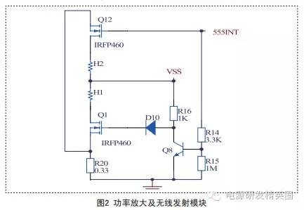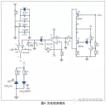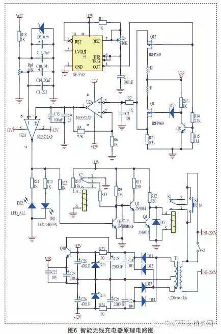 因不同的类型电子产品需要使用不同的充电器,充电时还要寻找合适的插口和理顺接线,笔者利用电磁感应原理,设计了智能无线充电器。该无线充电器具有 自动感应充电和充满电后智能断电功能,不仅适用于各种不同充电电压和容量的电子产品,而且能够对多台不同的电子产品同时进行充电。作品采用智能无线充电的 设计思想,具有使用方便、适用面广的优点,有较高的推广应用价值。 1.系统概述 1.1当前充电模式情况 在电子科技技术高速发展的今天,全球范围内的手机用户数量已经达到了33亿,再加上MP3、MP4等其他周边电子产品,平均不到2人就拥有一个需要充电 的便携式电子产品。目前普遍使用的都是数据线插接式充电,这种充电方式数据线接口用久了通常会有触不良等现象,而且单个充电器适应面不广,因不同的类型电 子产品需要使用不同的充电器,充电时还要寻找合适的插口和理顺接线,真可谓费时费力;各种便携式电子产品的充电是一件令人头痛的麻烦事。为了改良上面的现 象,研发智能无线充电器是很有必要的。 1.2作品简介及优点 智能无线充电器利用 电磁感应原理,是非接触充电系统,不再通过导线(充电线)传输电能,而是无线传输方式充电。没有充电所用的物理接口,与一般充电器相比,避免了插线或拔电 池的麻烦,具有一般充电器的工作原理;作品采用一(充电器)对多(感应负载)充电、智能充电的设计思想;无线充电器对负载充电时,指示灯将由绿灯转换为七 彩灯,手机也正确显示充电状态并智能完成充过程(实验产品为手机)。本充电器可以同时对多个负载充电,可以自动感应是否有负载充电,达到自动充电,充满电 后10秒自动断电,达到智能化;从而大大方便了用户。智能无线充电器使用十分方便、一个充电器就可以满足一个家庭的需要,具有较高的推广应用价值、成本低 廉(与一般充电器价格相差不多)等优点,现在世界上许多大公司(如Sony,Intel,apple,飞利普等)也正在火热研究中;智能无线充电必将是取 代物理直插的发展方向,将肯定受到人们的欢迎和重视。 基于以上思路,充分运用所学电子技术知识,经过老师悉心指导。设计、制作智能无线充电器,它具有如下优点: (1)成本低廉 电路由脉冲产生部分、功率放大部分,滤波部分、比较部分及发射和接收部分组成,每部分只是几个小元件组成,制作简单。 (2)一对多充电 一台充电器可以对多个负载充,一个家庭购买一台充电器就可以满足全家人使用,随着负载的增加,工作效率也会增高,因此可以节约用电同时亦可减少不必要的开销。 (3)方便性 与一般充电器相比,减少了插拔的麻烦,同时亦避免了接口不适用,接触不良等现象,老年人也能很方便地使用。 (4)智能化 只要把感应负载往充电器上面放,就可以自动感应充电,通过信息反馈,当感应负载满电后,自动断电,实现充电过程智能化。 2.工作原理概述 2.1系统模块 无线充电器利用电磁感应原理。通过NE555D芯片产生一个36.7K的脉冲频率(因为经过调试在36.7K频率时,效率达到最高),IRFP460功 率放大,使发射线圈产生磁场,当接收线圈靠近时,产生感应电流,经过全波整流和稳压,得到负载(手机)所需要的充电电压和电流。发射线圈的电流会随着感应 负载的增加而增大,通过运放把0.33欧的负载电压23倍放大,再经过1N4148整流滤波得到电压U1与基准源Uo比较。充电时,U1大于Uo七彩灯闪 亮,表示正在充电;空负载或充满电时,U1小于Uo,绿灯亮,若10秒钟后没有感应负载,自动断电;按一下复位键则充电器重新启动。具体电路分析如下: 2.1.1NE555D脉冲发生器模块 如图1,根据T=(R1+Rp)C1,f=1/T,调节Rp使NE555D输出一个36.7KHZ的脉冲频率。 ![]() 2.1.2功率放大及无线发射模块 主要把NE555D产生的一个36.7KHZ的脉冲功率放大,经发射线圈发射出去。当脉冲为高电平时,Q12栅极为高电平,Q12导通,此时Q8饱 和,Uceq电压只有0.67V,经D10-4148后Q1栅极电压为0,Q1截止。当脉冲为低电平时,Q8、Q12同时截止,电流直接由 R16D10Q1,Q1导通。整个过程中Q1与Q12均以一开一关的形式工作。电路如图2: 2.1.3感应线圈模块 如图3,当感应线圈靠近发射线圈时,就会产生感应电流,经过全波整流后,根据不同的电子产品的充电电压,可选择不同的稳压二极管稳压,再经三极管Q100放大电流后供给不同电子产品充电。 2.1.4充电检测模块 当有感应负载时,R20(0.33欧)电阻上的电压会增大,经运 放U2A放大A=1+R5/R6=23倍后,电压变化明显,再经过1N4148整流滤波,得电压U1与基准源U。比较,此时U1>U。,运放输出Ui为高 电平,七彩灯闪烁;当感应负载充满电(或没有感应到负载),此时U1 2.1.5智能断电模块 (1)当开关S2断开时,整充电器处于智能充电过程。充电器启动时,继电器K1闭合,同时K2为断开状态。当有感应负载时,七彩灯闪烁,Ui为高电平, 此时Q5饱和,电压Uceq为0.67V,低于Q2+Q4的导通电压之和(1.34V),Q2与Q4构成达林顿,同时截止,继器K1吸合;当感应负载充满 电(或无感应负载)时,绿灯亮,即Ui为低电平,此时Q3截止,电容C5与R9构成RC充电电路,当电容充电电压到达Q2与Q4的导通电压时,Q2导通, 使Q4饱和,此时继电器工作电压只有0.67V,继电器断开,整个电路处于完全断电状态。断电后,继电器K2闭合,此时C5与R13构成RC放电电路,给 C5快速放电。当按一下轻触复位开关时,充电器重新启动。当感应负载充满电(或无感应负载)时,电容C5充电,其电压为Ut 由公式Ut=12*(1-e-t/R9C5)得:t=-R9C5ln(1-Ut/12) 