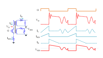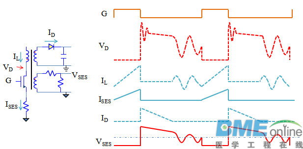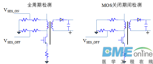 概要 ●PSR简介 ●PSR的输出检测方法 ●PSR特有的问题 需要文档→超实用--开关电源原边反馈技术.ppt的朋友请加小编个人微信:gcj5055免费索取 原边反馈(PSR)简介 ●在小功率消费类电子应用中,反激式电源是主流,因为反激式电源非常适合小功率段,同时天然提供了隔离的效果。 ●隔离后,如果要检测输出的情况,需要用隔离元件,比如光耦等,这样就增加了电源的成本,光耦本身的寿命也会成为电源的瓶颈,基于此,开发出了原边反馈技术。 -原边反馈不从输出直接采样,而是从初级线圈采样,通过初级线圈的情况来计算次级线圈的情况,进一步推算输出的情况。 -部分信息难以从初级线圈直接得到,因此通常还使用一个辅助线圈,辅助线圈和初级线圈共地,和次级隔离 辅助线圈的用途●增加辅助线圈会增加成本和复杂度,因此,最好能让辅助线圈完成更多的工作,一般辅助线圈都同时做2件事情: -反映初级线圈和次级线圈的情况,辅助线圈通过电阻分压,将原边和副边的电压情况反映在VSES点,此时辅助线圈和原边/副边构成变压器。 -和初级线圈形成一个反激结构,给IC供电,由于反激结构本身无法恒压,因此要加一个限压的二极管。 ![]() ●如果不要求辅助线圈供电,那么是否可以用其他检测方法,比如在初级线圈上检测来做原边反馈? ●理论上是可行的,思路如下: -在初级线圈上并联一个高阻支路,对初级线圈进行采样,同时提供TOFF期间初级线圈的回路。 -考虑到检测电压必须为正,因此有两种基本形式,如下图: ![]() ●原边反馈不能得到所有的输出信息,但可以得到较多的输出信息。 -不能得到输出电流信息,但可以得到初级的电流信息。 -不能直接得到输出电压信息,可以通过辅助绕组来得到输出电压信息。 ![]() ●电感两端电压太高,检测IL和VD很困难,通过ISES和VSES检测; ●考虑到隔离要求,次级电流和输出电压不能直接检测,只能通过其他值计算出来。 ![]() ●MOS管关断后,变压器中储存的能量都由次级和辅助线圈释放出来,次级线圈和辅助线圈形成变压器,此时VSES上的电压为: ![]() ●VD和次级线圈的电流有关,电流越小,VD越小,电流为0时,VD为0。 ●因此,在去磁点时刻,VO电压为: ![]() ●当流过次级二极管的电流为0后,变压器退磁,此时VD比VIN高一个反射电压,初级电感和寄生电容形成的LC电路开始震荡,初级电感上的电压将从VD-VIN开始,以正弦方式往下降。 ●这样,在VSES上看到的电压将呈现出一个膝盖状,因此,将退磁点电压称为膝电压。 因为正弦起始点处的斜率为-1,膝电压就是电压斜率从负载消耗导致的斜率变化到-1的时刻的电压。 ![]() ●MOS管关断后,变压器中储存的能量都由次级和辅助线圈释放出来,此时次级的平均电流为: ![]() ●ISND_PK无法直接测到,只能由ISES_PK近似换算得到: ![]() 最新评论论坛新帖更多>医工工具 |