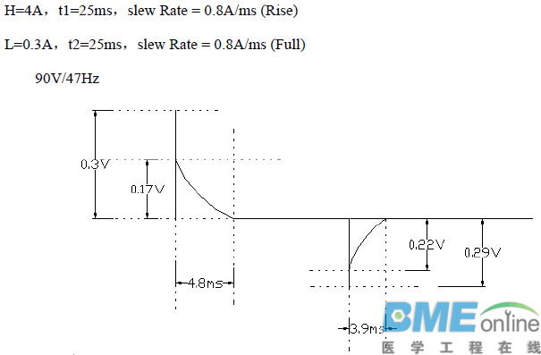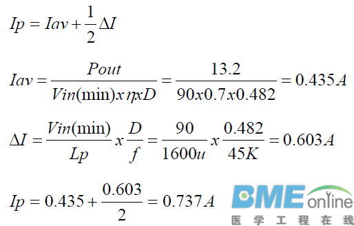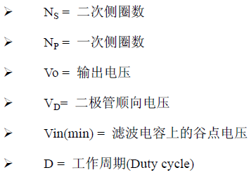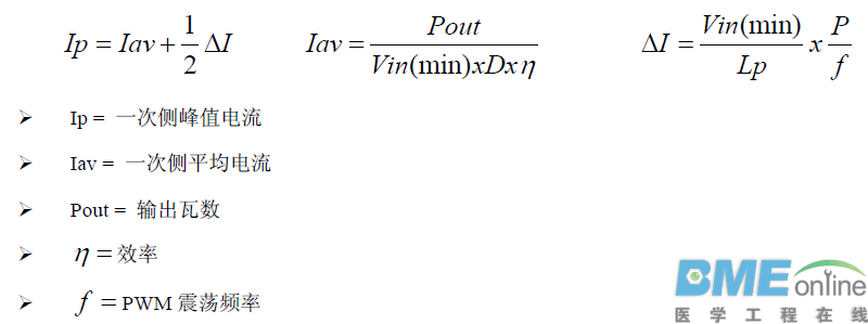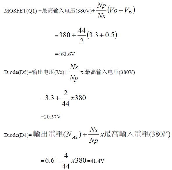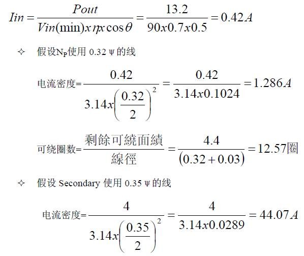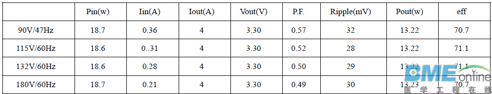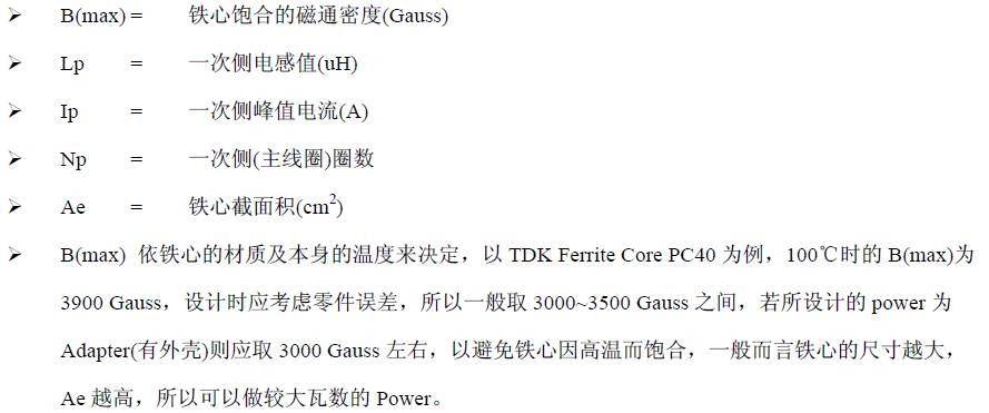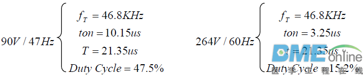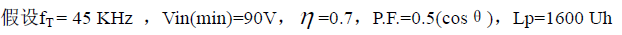 电源设计全过程 本次讲解电源以一个13.2W电源为例 输入:AC90~264V 输出:3.3V/4A 原理图 ![]() 变压器是整个电源供应器的重要核心,所以变压器的计算及验证是很重要的。 决定变压器的材质及尺寸: 依据变压器计算公式 ![]() ![]() 获取本文原版文档电源设计实例--手把手教你到每一个元器件.pdf方法如下 关注本公众号回复"设计实例"免费获取 决定一次侧滤波电容: 滤波电容的决定,可以决定电容器上的Vin(min),滤波电容越大,Vin(win)越高,可以做较大瓦数的Power,但相对价格亦较高。 决定变压器线径及线数: 当变压器决定后,变压器的Bobbin即可决定,依据Bobbin的槽宽,可决定变压器的线径及线数,亦可计算出线径的电流密度,电流密度一般以6A/mm2为参考,电流密度对变压器的设计而言,只能当做参考值,最终应以温升记录为准。 决定Duty cycle (工作周期): 由以下公式可决定Duty cycle ,Duty cycle的设计一般以50%为基准,Duty cycle若超过50%易导致振荡的发生。 ![]() ![]() 决定Ip值: ![]() 决定辅助电源的圈数: 依据变压器的圈比关系,可决定辅助电源的圈数及电压。 决定MOSFET及二次侧二极管的Stress(应力): 依据变压器的圈比关系,可以初步计算出变压器的应力(Stress)是否符合选用零件的规格,计算时以输入电压264V(电容器上为380V)为基准。 其它: 若输出电压为5V以下,且必须使用TL431而非TL432时,须考虑多一组绕组提供Photo coupler及TL431使用。 将所得资料代入 ![]() 公式中,如此可得出B(max),若B(max)值太高或太低则参数必须重新调整。 变压器计算: 输出瓦数13.2W(3.3V/4A),Core = EI-28,可绕面积(槽宽)=10mm,Margin Tape = 2.8mm(每边),剩余可绕面积=4.4mm. ![]() 计算式: 变压器材质及尺寸: 由以上假设可知材质为PC-40,尺寸=EI-28,Ae=0.86cm2,可绕面积(槽宽)=10mm,因Margin Tape使用2.8mm,所以剩余可绕面积为4.4mm. 假设滤波电容使用47uF/400V,Vin(min)暂定90V。 ●决定变压器的线径及线数: ![]() ![]() ●决定Duty cycle: ![]() ●决定Ip值: ![]() ●决定辅助电源的圈数: ![]() ![]() ●决定MOSFET及二次侧二极管的Stress(应力): ![]() ●其它: 因为输出为3.3V,而TL431的Vref值为2.5V,若再加上photo coupler上的压降约1.2V,将使得输出电压无法推动Photo coupler及TL431,所以必须另外增加一组线圈提供回授路径所需的电压。 ![]() ●变压器的接线图: ![]() 零件选用: ![]() ●FS1: 由变压器计算得到Iin值,以此Iin值(0.42A)可知使用公司共享料2A/250V,设计时亦须考虑Pin(max)时的Iin是否会超过保险丝的额定值。 ●TR1(热敏电阻): 电源激活的瞬间,由于C1(一次侧滤波电容)短路,导致Iin电流很大,虽然时间很短暂,但亦可能对Power产生伤害,所以必须在滤波电容之前加装一个热敏电阻,以限制开机瞬间Iin在Spec之内(115V/30A,230V/60A),但因热敏电阻亦会消耗功率,所以不可放太大的阻值(否则会影响效率),一般使用SCK053(3A/5Ω),若C1电容使用较大的值,则必须考虑将热敏电阻的阻值变大(一般使用在大瓦数的Power上)。 ●VDR1(突波吸收器): 当雷极发生时,可能会损坏零件,进而影响Power的正常动作,所以必须在靠AC输入端 (Fuse之后),加上突波吸收器来保护Power(一般常用07D471K),但若有价格上的考量,可先忽略不装。 ●CY1,CY2(Y-Cap): Y-Cap一般可分为Y1及Y2电容,若AC Input有FG(3 Pin)一般使用Y2- Cap , AC Input若为2Pin(只有L,N)一般使用Y1-Cap,Y1与Y2的差异,除了价格外(Y1较昂贵),绝缘等级及耐压亦不同(Y1称为双重绝缘,绝缘耐压约为Y2的两倍,且在电容的本体上会有“回”符号或注明Y1),此电路因为有FG所以使用Y2-Cap,Y-Cap会影响EMI特性,一般而言越大越好,但须考虑漏电及价格问题,漏电(Leakage Current )必须符合安规须求(3Pin公司标准为750uA max)。 ●CX1(X-Cap)、RX1: X-Cap为防制EMI零件,EMI可分为Conduction及Radiation两部分,Conduction规范一般可分为: FCC Part 15J Class B 、 CISPR 22(EN55022) Class B 两种 , FCC测试频率在450K~30MHz,CISPR 22测试频率在150K~30MHz, Conduction可在厂内以频谱分析仪验证,Radiation 则必须到实验室验证,X-Cap 一般对低频段(150K ~ 数M之间)的EMI防制有效,一般而言X-Cap愈大,EMI防制效果愈好(但价格愈高),若X-Cap在0.22uf以上(包含0.22uf),安规规定必须要有泄放电阻(RX1,一般为1.2MΩ 1/4W)。 ●LF1(Common Choke): EMI防制零件,主要影响Conduction 的中、低频段,设计时必须同时考虑EMI特性及温升,以同样尺寸的Common Choke而言,线圈数愈多(相对的线径愈细),EMI防制效果愈好,但温升可能较高。 ●BD1(整流二极管): AC电源以全波整流的方式转换为DC,由变压器所计算出的Iin值,可知只要使用1A/600V的整流二极管,因为是全波整流所以耐压只要600V即可。 ●C1(滤波电容): 由C1的大小(电容值)可决定变压器计算中的Vin(min)值,电容量愈大,Vin(min)愈高但价格亦愈高,此部分可在电路中实际验证Vin(min)是否正确,若AC Input 范围在90V~132V (Vc1 电压最高约190V),可使用耐压200V的电容;若AC Input 范围在90V~264V(或180V~264V),因Vc1电压最高约380V,所以必须使用耐压400V的电容。 ![]() ●D2(辅助电源二极管): 整流二极管,一般常用FR105(1A/600V)或BYT42M(1A/1000V),两者主要差异: 1. 耐压不同(在此处使用差异无所谓) 2. VF不同(FR105=1.2V,BYT42M=1.4V) ●R10(辅助电源电阻): 主要用于调整PWM IC的VCC电压,以目前使用的3843而言,设计时VCC必须大于8.4V(Min. Load时),但为考虑输出短路的情况,VCC电压不可设计的太高,以免当输出短路时不保护(或输入瓦数过大)。 ●C7(滤波电容): 辅助电源的滤波电容,提供PWM IC较稳定的直流电压,一般使用