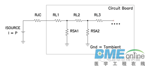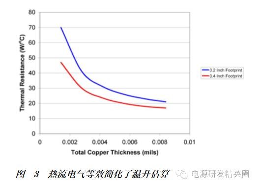 过去估算半导体温升十分简单。您只需计算出组件的功耗,然后采用冷却电路电模拟即可确定所需散热片的类型。现在出于对尺寸和成本因素的考虑,人们渴望能够去除散热片,这就使得这一问题复杂化了。贴装在散热增强型封装中的半导体要求电路板能够起到散热片的作用,并提供所有必需的冷却功能。如图 1 所示,热量经过一块金属贴装片和封装流入印刷线路板 (PWB)。然后,热量由侧面流经 PWB 线迹,并通过自然对流经电路板表面扩散到周围的环境中。影响裸片温升的重要因素是 PWB 中的铜含量以及用于对流导热的表面面积。 半导体产品说明书通常会列出某种 PWB 结构下结点至周围环境的热阻。这就是说,设计人员只需将这种热阻乘以功耗,便可计算出温升情况。但是,如果设计并没有具体的结构,或者如果需要进一步降低热阻,那么就会出现许多问题。 图 2 所示为热流问题的简化电模拟,我们可据此深入分析。IC 电源由电流源表示,而热阻则由电阻表示。在各电压下对该电路求解,其提供了对温度的模拟。从结点至贴装面存在热阻,同时遍布于电路板的横向电阻和电路板表面至周围环境的电阻共同形成一个梯形网络。这种模型假设1)电路板为垂直安装,2)无强制对流或辐射制冷,所有热流均出现在电路板的铜中,3)在电路板两侧几乎没有温差。 图 2 热流电气等效简化了温升估算图 3 所示为增加 PWB 中的铜含量对提高热阻的影响。将 1.4 mils 铜(双面,半盎司)增加到 8.4 mils(4 层,1.5 盎司),就有可能将热阻提高 3 倍。图中两条曲线:一条表示热流进入电路板、直径为 0.2 英寸的小尺寸封装;另一条表示热流进入电路板、直径为 0.4 英寸的大尺寸封装。这两条曲线均适用于 9 平方英寸的 PWB。这两条曲线均同标称数据紧密相关,同时都有助于估算改变产品说明书电路板结构所产生的影响。但是使用这一数据时需要多加谨慎,其假设 9 平方英寸 PWB 内没有其他功耗,而实际上并非如此。 ![]() |