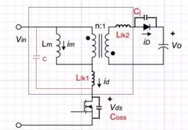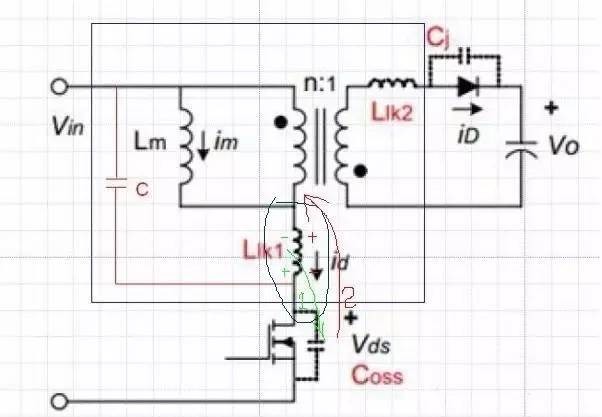 反激开关MOSFET 源极流出的电流(Is)波形的转折点的分析。 很多工程师在电源开发调试过程中,测的的波形的一些关键点不是很清楚,下面针对反激电源实测波形来分析一下。问题一,一反激电源实测Ids电流时前端有一个尖峰(如下图红色圆圈里的尖峰图),这个尖峰到底是什么原因引起的?怎么来消除或者改善? 大家都知道这个尖峰是开关MOS开通的时候出现的,根据反激回路,Ids电流环为Vbus经变压器原边、然后经过MOS再到Vbus形成回路。本来原边线圈电感特性,其电流不能突变,本应呈线性上升,但由于原边线圈匝间存在的分布电容(如下图中的C),在开启瞬间,使Vbus经分存电容C到MOS有一高频通路,所以形成一时间很短尖峰。 下面再上两个英文资料,上面的C在下图中等效于Cp或者是Ca![]() 经分析,知道此尖峰电流是变压器的原边分布参数造成,所以要从原边绕线层与层指尖间着手,可以加大间隙来减少耦合,也可以尽量设计成单层绕组。例如变压器尽量选用Ae值大的,使设计时绕组圈数变少减少了层数,从而使层间电容变小。也可减少线与线之间的接触面,达到减少分布电容的目的。如三明治绕法把原边分开对此尖峰有改善,还能减少漏感。当然,无论怎样不能完全避免分布电容的存在,所以这个尖峰是不能完全消除的。并且这个尖峰高产生的振荡,对EMI不利,实际工作影响倒不大。但如果太高可能会引起芯片过流检测误触发。 所以电源IC内部都会加一个200nS-500nS的LEB Time,防止误触发,就是我们常说的消隐。 问题二,开关MOS关端时,IS电流波形上有个凹陷(如下图红色圈内的电流波形的凹陷)这是怎么回事?怎么改善? ![]() 说这个原因之前先对比下mos漏极电流Id与mos源极电流Is的波形。 实测Id波形如下 实测Is波形如下 从上面的这两个图中看出,ID比IS大一点是怎么回事?其实Is 是不等于Id的,Is = Id+Igs(Igs在这里是负电流,Cgs的放电电流如下图),那A,B 两点波形,就容易解释了。![]() Id比Is大,是由于IS叠加了一个反向电流,所以出现Is下降拐点。显然要改善这个电流凹陷可以换开关MOS管型号来调节。 看了上面Id的电流波形后问题又来了,mos关断时ID的电流为何会出现负电流?如下图 ![]() MOS关断时,漏感能量流出给Coss充到高点,即Vds反射尖峰的顶点上。到最高点后Lk相位翻转,Coss反向放电,这时电流流出,也就是Id负电流部份的产生。 ![]() |