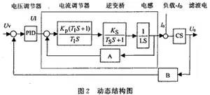 3 斜波补偿及工作稳定性分析控制电路的核心是电流型双路推挽输出的UC3825,电源中所有的故障、启停都可通过控制芯片的启停来实现。控制电路包含了输出电压、电流控制器;电网输入的过压、欠压、缺相保护;输出直流电源的过压、短路保护;散热器的过温保护;风扇的智能驱动及故障检测;几组模拟电压、电流给定信号的自动切换,微控板可以检测到所有的信号。如果说主电路的设计优劣关系到整机可靠性的话,那么,控制电路将直接影响到输出直流电源的品质。控制主芯片UC3825为电流型器件,所有电流型PWM控制器件有一个共同的特点:当反馈电流大于内部给定电流时立即关断所驱动的器件。这样,当反馈电流的波形前沿有毛刺时很容易引起系统的不稳定。解决的方法有:(1)在电磁式电流互感器两端并接电容去掉毛刺;(2)充分利用器件特性,在器件的电流输入端和振荡器斜波输入端并接电容、阻容。事实证明:这两种方法都能克服系统的不稳定。根据主电路方案及性能要求,输出电流、输出电压采用双路并联控制方式,其中电流环为比例一积分控制的单环系统,电压环为双闭环系统,内环为电流环,外环为电压环,采用比例一积分一微分控制方式。动态结构图如图2所示,虚线框内是电流环的动态结构图。图2中A,B分别为电流电压反馈系数,其他参数对应各自环节的物理量。
