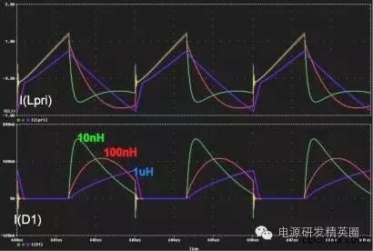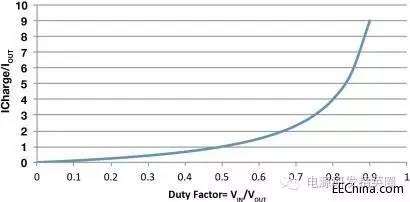 Fly-Buck 是实现简单隔离式偏置电压的便捷之选,但在考虑高占空比运行时需要谨慎。有时候,您会遇到需要从宽泛输入电源获得简单、低功耗隔离式输出电压的情况。这时,稳压可能并不重要,重要的是成本和电路板空间。满足这些需求的良好解决方案是Fly-Buck电源,这只是一款带耦合绕组的降压稳压器。稳压的实现方法是在低侧一次开关开启时对耦合电感器的二次绕组进行整流。这可将一个电压反射给二次绕组,计算方法是用降压输出电压乘以耦合电感器匝数比。图1 展示了Fly-Buck电路的简单程度。在该设计中,同步降压电源开关包含在控制IC内,只需几个分立部件和一个变压器就可完成设计。成功设计的真正诀窍在于耦合电感器的规范或选择。尤其需要构建对匝数、漏电感和磁化电感的要求。 图1:Fly-Buck是提供稳压、隔离式输出的简单方法。 在图1所示电路中,变压器的匝数比由一次及二次输出电压确定。它将只是一二次电压之比与二极管(D1)电压限值及任何绕组电阻压降限值之和。在这种情况下,需要了解一次输出电压与最小输入电压之间的关系。显然,该降压无法提供比输入高的输出电压。如果这两个值太接近了,电路可能就没有正常工作。您可能会受到最大控制占空比限制,因为输出电压大概就是占空比与输入的乘积。第二个挑战是极高占空系数下的电路工作问题,此时电流会变得非常高。这些高电流可能由电荷守恒及基本电路工作所致。从电荷守恒来看,输出电容器只在开关节点为低时充电。在该周期剩余的时间里,它会提供负载电流。电荷平均储存公式为: 图2 是这一结果的曲线,其中 Icharge/Iout与D对比标绘。在占空系数大于75%时,该比值大于3,并随占空系数的增大而迅速攀升。高电流可对二次输出稳压产生影响。二极管导电时,耦合电感器可将一个反射的一次输出电压提供给耦合电感器漏电感、串联寄生电阻以及输出滤波器电容器的串联组合。 图2:在高占空系数或Vo 接近 图3:漏电感会对充电电流波形产生强烈影响(绿色 = 10nH,红色 = 100nH,蓝色 = 1uH)。 图4:漏电感是稳压杀手。 作者:Robert Kollman