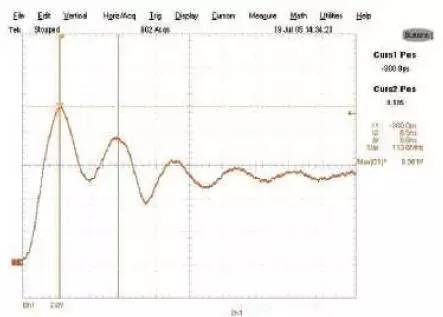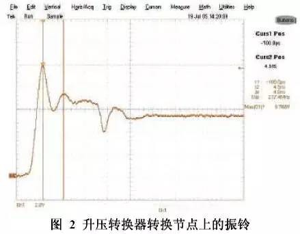 图一 的电路图显示了升压转换器的关键环路,该环路由寄生电感和电容构成,分别标识为 LPAR 和 CPAR 参考指定器。在两个开关和电感器件的开关转换器相交处的节点被称作开关节点。在开关节点上,寄生电感和电容交互作用并引起电压在 200-MHz+ 范围内振铃是比较正常的。如果该振铃的振幅大于低压侧开关的额定电压的最大绝对值,将对开关产生破坏性作用。另外,传导发射和/或振铃产生的电磁干扰 (EMI) 也会使附近的集成电路出现问题。 ![]() 图 2 给出了一个升压转换器转换节点的振铃频率范围图,时间量程 (time scale) 为 5-ns/div。我们使用了带宽均为 500-MHz 的示波器和示波器探针(大约是 200-MHz 振铃频率的 2 倍)来表示示波器图形。将示波器探针的接地环路最小化以避免感应拾取造成测量结果失真。由于 VIN = 3.3 V,并且 VOUT = 5 V,所以转换节点的峰值电压不应大于 VOUT + VDIODE≈5.7 V,但是转换节点振铃的振幅峰值为 9.8 V,其会损坏低压侧开关。在最小化振铃的设计阶段,电源设计人员会有多种选项。如果使用了控制器,设计人员还应选用拥有最小寄生电容的 FET 和二极管,并且合理布置电路板,使开关和电感器之间的距离最小化,从而使 LPAR2 和 LPAR3 最小化。此外,设计人员还可以通过减小 FET 电源引脚和电源接地点或接地层之间的距离来使 LPAR2 最小化。通过将大输出电容尽可能地靠近二极管的阴极和接地电源放置,也可以使 LPAR4 和 LPAR5 最小化。推荐使用介于输出值(0.01 mF – 2.2 mF)和接地电源之间的高频旁路电容 (COUT-BYP) 来最小化振铃。由于电路板的尺寸限制或是由于内部 CPAR#、LPAR1、LPAR2 以及 LPAR3 均被集成在FET 电源 IC 中,改善电路板布局是不大可能的。因此,就要求设计一个缓冲电路,该电路由从开关节点至接地电源的 RSNUB 和 CSNUB 组成,是一个用来消除在闭合开关时电路寄生电感引起的尖峰电压的能量吸收电路。在开关闭合时,通过为电流流经电路寄生电感提供一条接地的替代路径,该缓冲电路可以减少电压瞬态并抑制寄生电感上发生的继起振铃。该应用报告的以下部分将讲述在没有明显减少转换关闭上升时间或降低整体效率情况下,如何布置缓冲电路组件来抑制振铃的步骤。在确定了由寄生电感 [L∑PAR#] 和寄生电容 [C∑PAR#] 引起的振铃频率(fINIT = 217 MHz)后(如图 2 振铃频率范围图所示),在转换节点和接地之间添加足够的电容[CADD],振铃频率就可减半。图 3 显示了在添加了 300 pF 电容后,振铃频率为 113 MHz。