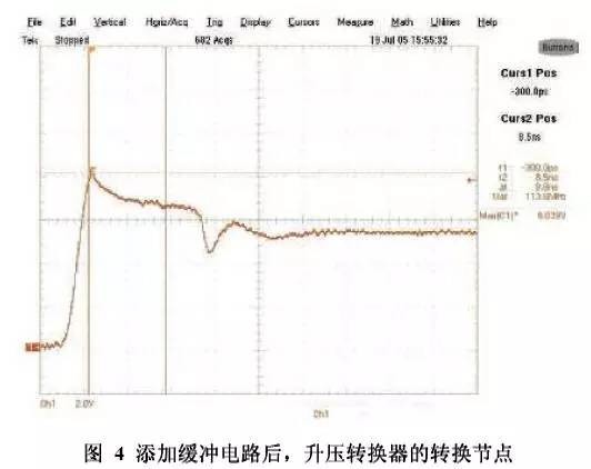 LC 电路的谐振频率与 LC 积的平方根成反比,因此现在的电路总电容 [C∑PAR# + CADD] 是其原始值 [或 C∑PAR# = CADD/3] 的 4 倍。这是加载于 CSNUB 的最小电容值。引起振铃的寄生电感值可以通过如下方程式计出: 重新整理,得出 在此例中,L∑PAR# 为 5.4nH。最后,最理想的缓冲电阻为原始寄生电容 [C∑PAR# = CADD/3=100pF] 和杂散电感 [L∑PAR# = 5.4 nH] 的特性阻抗: 从公式 3 中,(我们可以看出) RSNUB = 7.3Ω,采用上舍入法后,取 10Ω。将 CSNUB 的值设置为 330pF 后,下一个标准值大于 CADD 的计算值,从转换节点至接地的 RSNUB 值为 10Ω,第二个转换节点振铃频率范围图如图 4 所示。 显然现在振铃基本消除,振铃的峰值振幅降低了 1.8V,现为 8V,相当于减少了20%,并且转换跳闸时间只缩短了 2ns。设计人员可以极大地增加 CSNUB 值,直到转换节点角开始弯曲(即,在 Q=1 时,L∑PAR#,CSNUB,以及 RSNUB 电路被有效的抑制)。但是,随着 CSNUB 值的增加,缓冲电路所吸收的能量也有所增加,因此 RSNUB 的功耗也得相应增加,而同时降低升压转换器的效率。RSNUB 的功耗可由下式计算得出 PSNUB = ? CSNUB×VPK2×fSW,其中,VPK 为减少后的峰值振幅,FSW为升压转换器的转换频率。设计人员必须确保 RSNUB 包 (package) 足够大来实现上述功耗。总的来说,下一标准值需大于振荡频率减半 (1/2 [CADD]) 所需的值,在这一标准值上来选择 CSNUB,这样峰值振幅就可以降低 20% 左右,而峰值效率的降低则不是很明显。 |