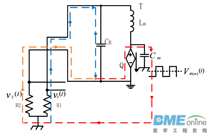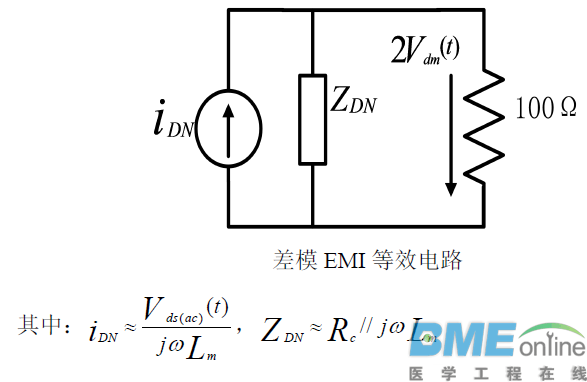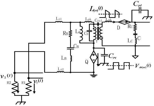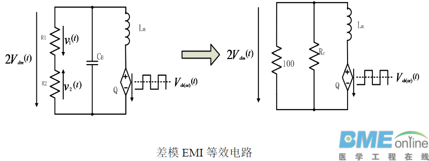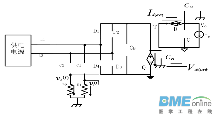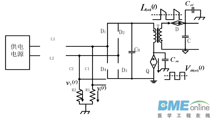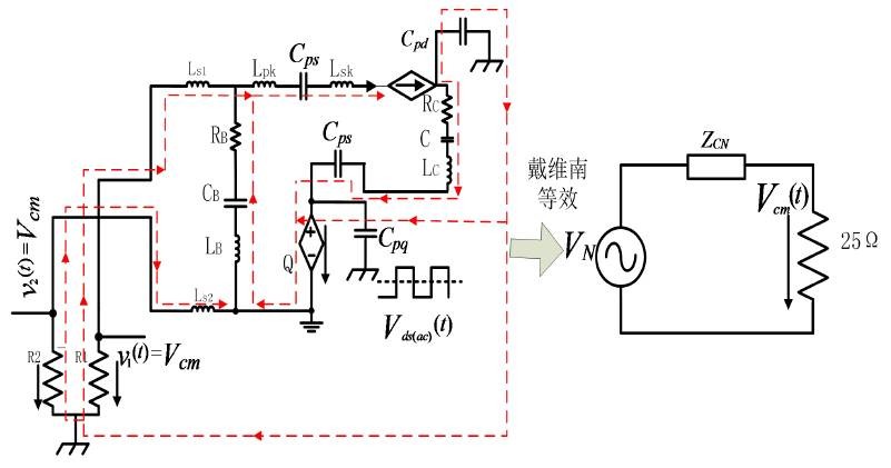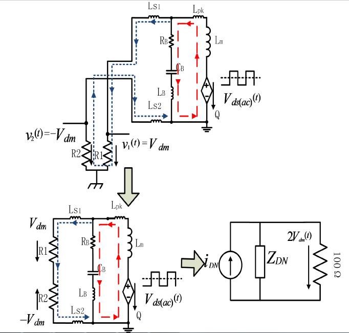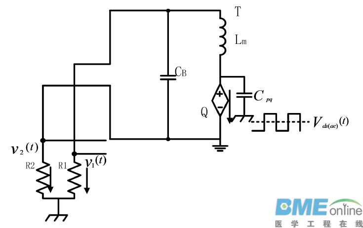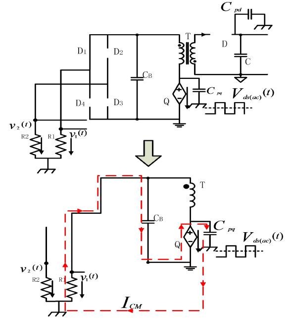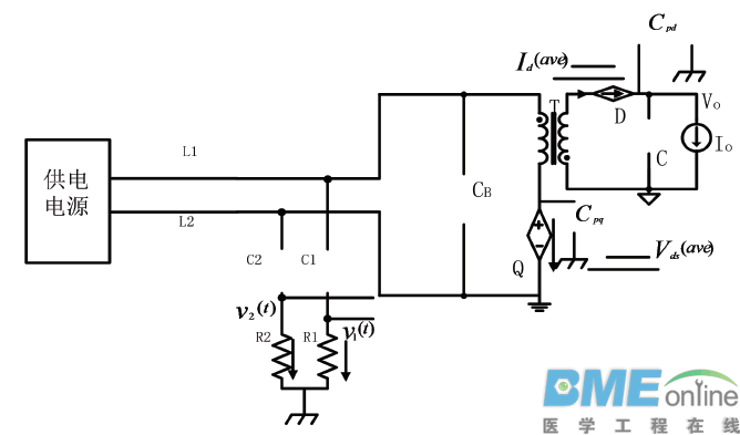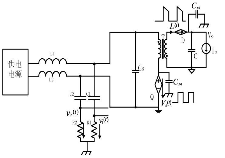 一、开关电源传导EMI 产生的根源1测试传导EMI 的线路图![]() LISN Line Impedance Stabilization Network 源阻抗稳定网络(人工电源网络)。 LISN 是电力系统中电磁兼容中的一项重要辅助设备。它可以隔离电网干扰,提供稳定的测试阻抗,并起到滤波的作用。 LISN 是在进行传导干扰发射测试中,为了客观地考核受试设备(DUT)的干扰,在电网与受试设备之间加入的网络。该网络具有以下功能: 1)、在规定的频率范围内提供一个规定的稳定的线路阻抗。由于电网受各种因素影响,使其线路阻抗不稳定。可是,在传导干扰的测量中,阻抗是非常重要的。为了用电压法在进行传导发射电压的测量中能有一个统一的测试条件,而人为的拟制一个稳定的线路阻抗。一般在射频段提供50Ω网络阻抗。 2)、LISN 将电网与受试设备进行隔离。供给DUT 的电源必须是纯净的。否则,电网将会向DUT 注入干扰,EUT 也会向电网馈入干扰,这就会在EMC分析仪上搞不清哪些是EUT 上的干扰。所以,只有将二者隔离,测量结果才是有效的。 3)、利用LISN 的高通滤波器使DUT 产生的干扰信号耦合至EMC 分析仪上,并阻止电网电压加至EMC 分析仪。供电电源可以是直流,也可以是交流,图中用直流电压源表示,负载用直流电流源表示。 A:在供电电源低频段,上述EMI 测试线路可等效为: ![]() 此时L1 和L2 可等效为短路,C1 和C2 可等效为开路,低频电流(功率电流部分)不会流入LISN 的两个测试电阻,LISN 不影响开关电源的正常工作点。 B:在EMI 标准规定的频段内,上述EMI 测试线路可等效为: ![]() 此时L1 和L2 可等效为开路,C1 和C2 可等效为短路,无高频分量的输入电压源和负载也可分别等效为短路及开路,开关电源用其EMI 等效电路等效,它产生的EMI 因LISN 的存在,不会流进输入,而直接流进LISN 的两个电阻,其等效电路如下: 电阻R1 和电阻R2 两端的电压可以用如下式子进行标示:![]() V1(t) 和 V2(t) 分别是线1和线2上的EMI噪声电压,测试时用其频谱标示,单位为dB/uV,从这个等效电路可初步判断,开关电源产生传导EMI 的根源是开关电源内的高频源及到负载之途径的阻抗。实际交流电源的差模噪声是由摇摆的(脉动)电流产生的但差模噪声源与电压源(电流在阻抗上形成一定的电压)更为相似。另一方面,共模噪声是由摇摆的电压引起的(快速变化的电压在寄生电容上形成快速变化的电流),但共模噪声源更像是电流源。这正是共模噪声更“顽固”的原因,像任何电流源一样,它们要求有流通的回路。因为其路径包括机架,所以外壳变成了高频天线。 2产生传导EMI的根源一个开关电源的传导EMI 等效电路,可用下面的一般结构加以表示: ![]() 从传导EMI 等效电路可知,产生传导EMI 的根源有三个,一个是EMI 源(在开关电源中,往往是功率开关器件电压或电流波形中的交流分量),一个是EMI 途径(与具体拓扑结构有关),再一个是EMI 的负载。等效电路中的EMI负载是固定的50Ω电阻,而变换的是EMI 源及EMI 途径(用EMI 阻抗等效)。如何确定用不同功率变换器、不同控制方式等等实现的开关电源之传导EMI 等效电路是分析和设计传导EMI 滤波器的关键,同时也是知道抑制传导EMI 的有力手段。 二、开关电源的传导EMI 等效电路1反激式开关电源的传导EMI 等效电路(1)电路原理图 ![]() (2)两种工作模式 在半个电网周期内,输入整流桥有两种大的工作模式,即:整流桥工作模式Ⅰ和整流桥不工作模式Ⅱ。 ![]() (3)工作模式Ⅰ的EMI 等效电路推导 3-A、工作模式Ⅰ的等效电路(正负半周工作一样) ![]() 在工作模式Ⅰ的情况下,两种工作工作模式在正负半周都会出现,此时整流桥是导通工作的。 3-A-1:工作模式Ⅰ在有LISN 时的等效电路 ![]() 3-A-2:工作模式Ⅰ在有LISN 时的等效受控源电路 ![]() 开关变换器的时变因素与非线性因素主要是由开关元件导致的。为了使变换器的等效电路成为线性电路,开关元件平均模型法采取了对开关元件直接进行分析的方法。 首先对开关元件的电压或电流变量在一个开关周期内求平均,并用以该平均变量为参数的受控源代替开关元件,得到等效的平均参数电路。平均参数等效电路消除了变量波形中因开关动作引起的脉动,即消除了时变因素,但仍然是一个非线性电路。这样的电路由于同时包含了直流分量与交流分量的作用,称为大信号等效电路。 其次,若使大信号等效电路中的各平均变量均等于其对应的直流分量,同时考虑到直流电路中稳态时电感相当于短路、电容相当于开路,可以得到变换器的直流等效电路,直流等效电路为线性电路;若使大信号等效电路中的各平均变量分解为相应的直流分量与交流小信号分量之和,即分离扰动,并忽略小信号分量的乘积项(即二阶微小量)使其线性化,再剔除各变量中的直流量,可以得到变换器的小信号等效电路,小信号等效电路也为线性电路。可见,开关元件平均模型法的指导思想仍然是求平均、分离扰动和线性化。 上图中开关管Q 等效为受控电压源,整流二极管D 等效为受控电流源。有源开关Q 时而接通是输入电压Vg,时而短路,用状态变量输入电压的平均值表征有源开关元件Q 的端电压是合理的,因此用一个电压控制的受控电压源来代替有源开关管Q;无源开关D 时而接通副边电感电流,时而开路,由于电感电流是一个状态变量,用电感电流的平均值表征无源开关元件D 的平均电流也是合理的,因此用一个电流控制的受控电流源代替无源开关元