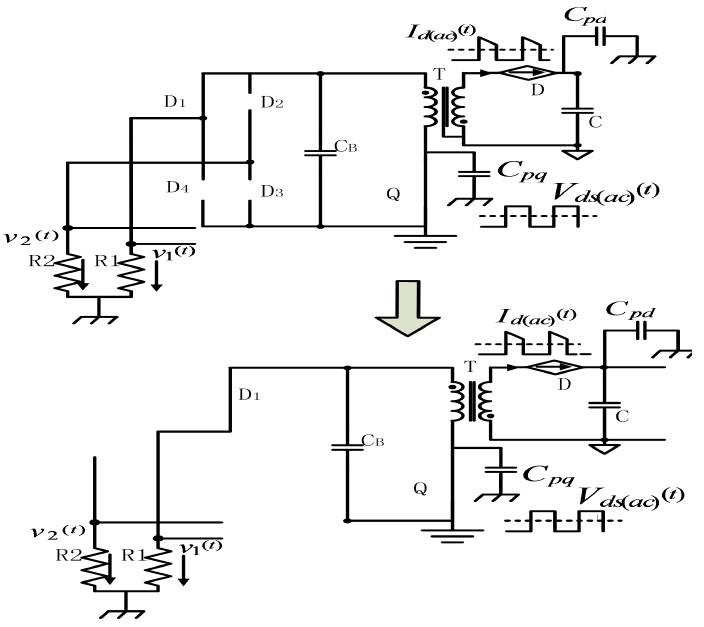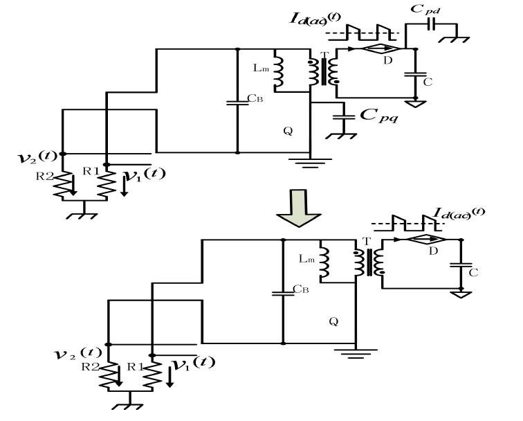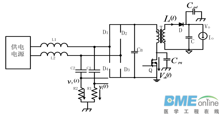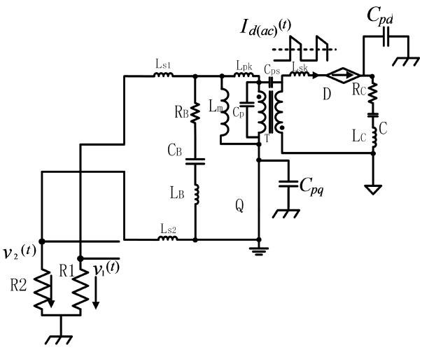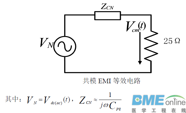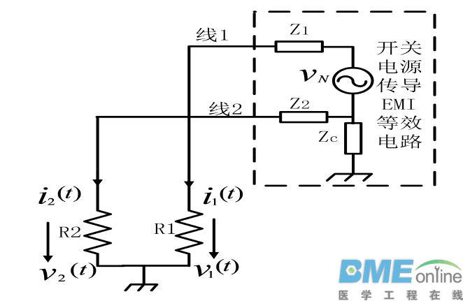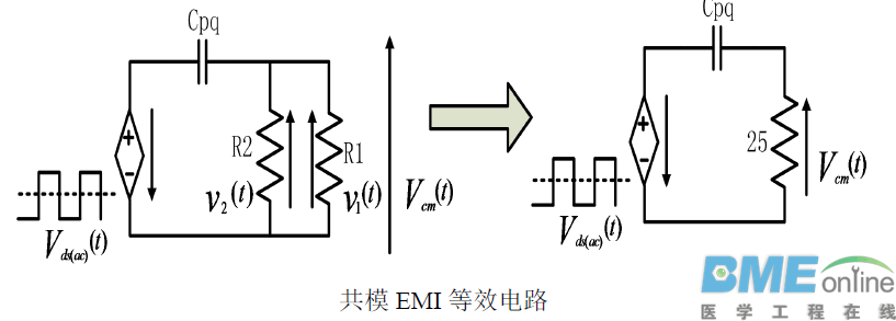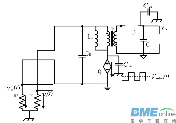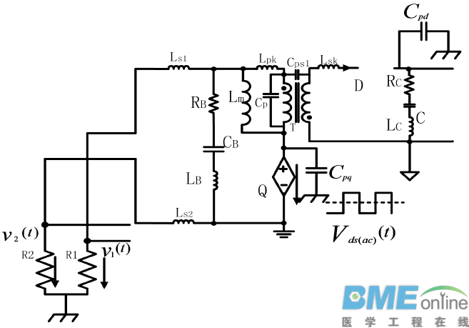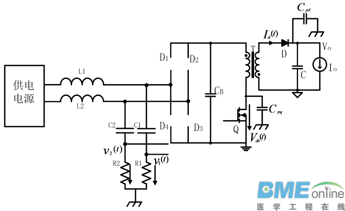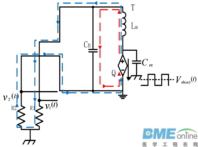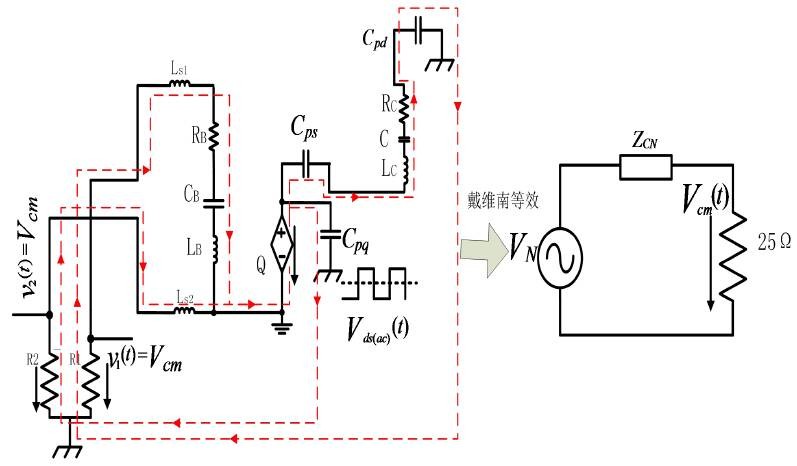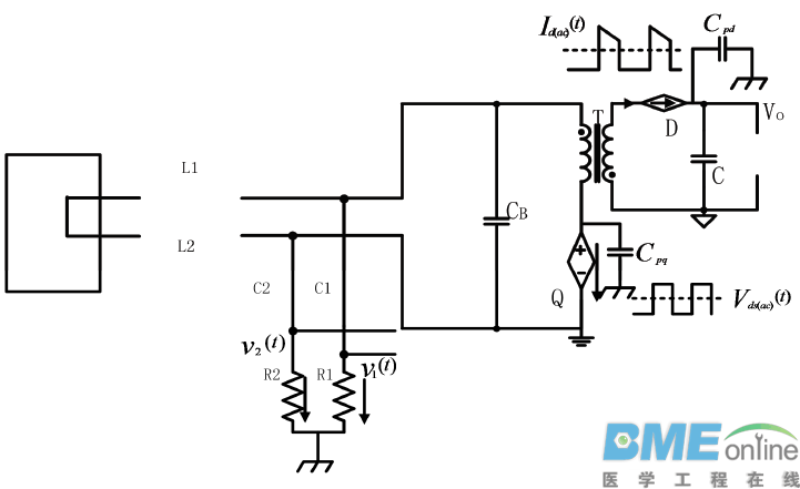 一、开关电源传导EMI 产生的根源1测试传导EMI 的线路图![]() LISN Line Impedance Stabilization Network 源阻抗稳定网络(人工电源网络)。 LISN 是电力系统中电磁兼容中的一项重要辅助设备。它可以隔离电网干扰,提供稳定的测试阻抗,并起到滤波的作用。 LISN 是在进行传导干扰发射测试中,为了客观地考核受试设备(DUT)的干扰,在电网与受试设备之间加入的网络。该网络具有以下功能: 1)、在规定的频率范围内提供一个规定的稳定的线路阻抗。由于电网受各种因素影响,使其线路阻抗不稳定。可是,在传导干扰的测量中,阻抗是非常重要的。为了用电压法在进行传导发射电压的测量中能有一个统一的测试条件,而人为的拟制一个稳定的线路阻抗。一般在射频段提供50Ω网络阻抗。 2)、LISN 将电网与受试设备进行隔离。供给DUT 的电源必须是纯净的。否则,电网将会向DUT 注入干扰,EUT 也会向电网馈入干扰,这就会在EMC分析仪上搞不清哪些是EUT 上的干扰。所以,只有将二者隔离,测量结果才是有效的。 3)、利用LISN 的高通滤波器使DUT 产生的干扰信号耦合至EMC 分析仪上,并阻止电网电压加至EMC 分析仪。供电电源可以是直流,也可以是交流,图中用直流电压源表示,负载用直流电流源表示。 A:在供电电源低频段,上述EMI 测试线路可等效为: ![]() 此时L1 和L2 可等效为短路,C1 和C2 可等效为开路,低频电流(功率电流部分)不会流入LISN 的两个测试电阻,LISN 不影响开关电源的正常工作点。 B:在EMI 标准规定的频段内,上述EMI 测试线路可等效为: ![]() 此时L1 和L2 可等效为开路,C1 和C2 可等效为短路,无高频分量的输入电压源和负载也可分别等效为短路及开路,开关电源用其EMI 等效电路等效,它产生的EMI 因LISN 的存在,不会流进输入,而直接流进LISN 的两个电阻,其等效电路如下: 电阻R1 和电阻R2 两端的电压可以用如下式子进行标示:![]() V1(t) 和 V2(t) 分别是线1和线2上的EMI噪声电压,测试时用其频谱标示,单位为dB/uV,从这个等效电路可初步判断,开关电源产生传导EMI 的根源是开关电源内的高频源及到负载之途径的阻抗。实际交流电源的差模噪声是由摇摆的(脉动)电流产生的但差模噪声源与电压源(电流在阻抗上形成一定的电压)更为相似。另一方面,共模噪声是由摇摆的电压引起的(快速变化的电压在寄生电容上形成快速变化的电流),但共模噪声源更像是电流源。这正是共模噪声更“顽固”的原因,像任何电流源一样,它们要求有流通的回路。因为其路径包括机架,所以外壳变成了高频天线。 2产生传导EMI的根源一个开关电源的传导EMI 等效电路,可用下面的一般结构加以表示: ![]() 从传导EMI 等效电路可知,产生传导EMI 的根源有三个,一个是EMI 源(在开关电源中,往往是功率开关器件电压或电流波形中的交流分量),一个是EMI 途径(与具体拓扑结构有关),再一个是EMI 的负载。等效电路中的EMI负载是固定的50Ω电阻,而变换的是EMI 源及EMI 途径(用EMI 阻抗等效)。如何确定用不同功率变换器、不同控制方式等等实现的开关电源之传导EMI 等效电路是分析和设计传导EMI 滤波器的关键,同时也是知道抑制传导EMI 的有力手段。 二、开关电源的传导EMI 等效电路1反激式开关电源的传导EMI 等效电路(1)电路原理图 ![]() (2)两种工作模式 在半个电网周期内,输入整流桥有两种大的工作模式,即:整流桥工作模式Ⅰ和整流桥不工作模式Ⅱ。 ![]() (3)工作模式Ⅰ的EMI 等效电路推导 3-A、工作模式Ⅰ的等效电路(正负半周工作一样) ![]() 在工作模式Ⅰ的情况下,两种工作工作模式在正负半周都会出现,此时整流桥是导通工作的。 3-A-1:工作模式Ⅰ在有LISN 时的等效电路 ![]() 3-A-2:工作模式Ⅰ在有LISN 时的等效受控源电路 ![]() 开关变换器的时变因素与非线性因素主要是由开关元件导致的。为了使变换器的等效电路成为线性电路,开关元件平均模型法采取了对开关元件直接进行分析的方法。 首先对开关元件的电压或电流变量在一个开关周期内求平均,并用以该平均变量为参数的受控源代替开关元件,得到等效的平均参数电路。平均参数等效电路消除了变量波形中因开关动作引起的脉动,即消除了时变因素,但仍然是一个非线性电路。这样的电路由于同时包含了直流分量与交流分量的作用,称为大信号等效电路。 其次,若使大信号等效电路中的各平均变量均等于其对应的直流分量,同时考虑到直流电路中稳态时电感相当于短路、电容相当于开路,可以得到变换器的直流等效电路,直流等效电路为线性电路;若使大信号等效电路中的各平均变量分解为相应的直流分量与交流小信号分量之和,即分离扰动,并忽略小信号分量的乘积项(即二阶微小量)使其线性化,再剔除各变量中的直流量,可以得到变换器的小信号等效电路,小信号等效电路也为线性电路。可见,开关元件平均模型法的指导思想仍然是求平均、分离扰动和线性化。 上图中开关管Q 等效为受控电压源,整流二极管D 等效为受控电流源。有源开关Q 时而接通是输入电压Vg,时而短路,用状态变量输入电压的平均值表征有源开关元件Q 的端电压是合理的,因此用一个电压控制的受控电压源来代替有源开关管Q;无源开关D 时而接通副边电感电流,时而开路,由于电感电流是一个状态变量,用电感电流的平均值表征无源开关元件D 的平均电流也是合理的,因此用一个电流控制的受控电流源代替无源开关元