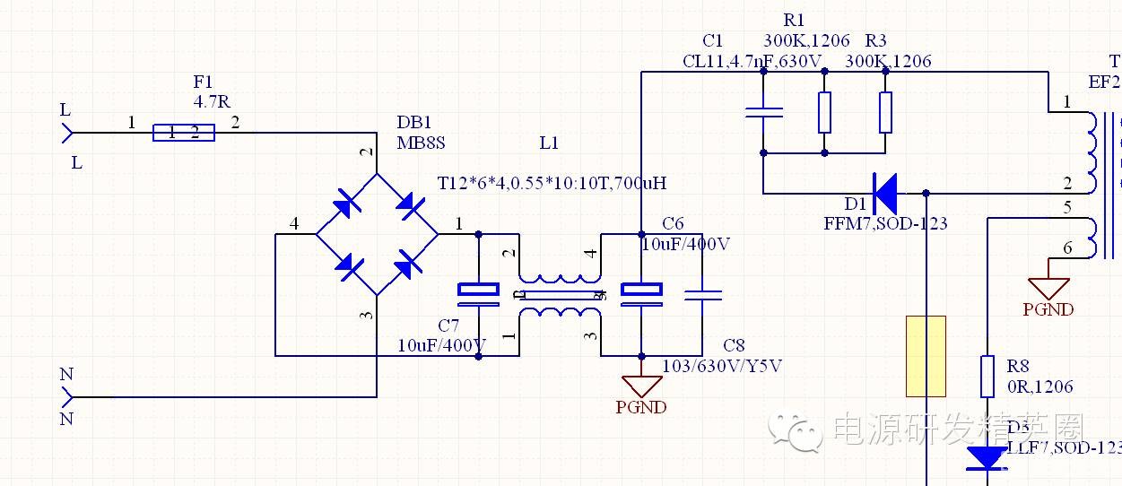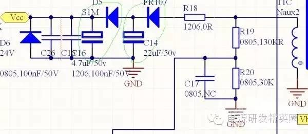 开关电源六级能效设计攻略1关于电源六级能效 近两年内,很多电源厂家或者电源工程师都在为了更新六级能效而忙碌,新规要求倒逼产品升级换代,是好事,也是挑战。 六级能效的标准是什么呢?到底怎么样做? 关于六级能效,两个要求: 一,待机功耗二,平均效率 针对这两点,光选用哪家公司的新芯片是不够的,还有电源电路中很多细节设计也是非常重要的,下面咱们一起来分析分析。 首先,了解标准必不可少: 美国能效要求![]() ![]() ![]() 当你用的芯片没有启动关断功能的芯片该怎么?下面分享一个小技巧如下图,Vcc只能尽量大启动电阻,大的启动电阻又需要较快的启动时间时,可以这样做,Vcc两级DC接法,C16用于启动储能,C14用于辅助供电储能,使启动时较大R的情况下C能更快充到IC启动阈值: X电容放电 IEC60950要求1S内电压下降到37% IEC60065要求2S内电压下降到35V以下 X电容放电时间常数RC需小于1, 设X电容为0.33uF,Rx*Cx<1,那么Rx<3MΩ,由于电容量存在20%误差,那么此电阻选值留足裕量,那应在Rx*0.7内,约2MΩ。 电阻损耗, PR=U2/R,设ACmax=264V PR=2642/2M PR=34.8mW CoC要求49W以下75mW待机或DoE要求49W以下100mW待机,不管那个标准,这部份的损耗都显得巨大。需要符合安规要求,放电必须快,但损耗又大那该如何入手呢。像下面这种接法肯定是行不通的。 怎么办?下面分享一下技巧不放放电电阻又过不了安规,可以选择使用更小的X电容,但X电容不放有时EMI不好整,得进一步想办法让这个R更灵活一点,如下: 技巧一、在断电后,利用IC的HV脚对Cx进行放电。 ![]() Vcc供电电路 1)、尽量选用芯片供电电压和电流小的芯片。2)、 尽量小的Vcc限流电阻,减小损耗。 3)、变压器设计时在保证芯片能正常工作的情况下匝数尽量少不但能降低待机功耗还能提升工作时整机效率,最后实际测试后尽量优化。 环路采样电阻 较小的电压标测环流,如图流经R11、R16的静态电流。图中两电阻75K+7.5K,回路静态电流约U/R=0.3mA, I2R约7.5mW。如设为47K+4.7K,则U/R=0.49mA, I2R约12.5mW。所以在环路允许的情况下,建议选取较大值。 假负载 一般为了稳定环路在输出预加一定的假负载,在目前6级能效来说,几乎不能接受,假设一个5V1A的电源预加1KR电阻假负载,实际消耗P=U2/R,实际上消耗25mW的功耗,已占COC待机要求的1/3。 所以要稳定,设整合适的环路才是正道。 待机功耗设计攻略小结 1,Vcc启动回路 对于传统芯片由于启动电流比较大,可选用启动电流尽量小的芯片,最好选用有启动后关断启动电阻通路的芯片。 2,X电容放电回路 安规标准里要求关断输入电源在很短时间内输入端口的电压要降到百分之三十多,所以这个要利用一定的技巧来放电: 利用芯片的高压启动脚放电 利用启动电阻放电 把X电容放到整流桥之后 3,IC Vcc供电回路 1)、尽量选用芯片供电电压和电流小的芯片。 2)、 尽量小的Vcc限流电阻,减小损耗。 3)、变压器设计时在保证芯片能正常工作的情况下匝数尽量少不但能降低待机功耗还能提升工作时整机效率,最后实际测试后尽量优化。 4,电压(电流)检测环路 选择环路检查电阻的时候,在环路稳定的前提下尽量用大的电阻来降低损耗。一定要确保环路稳定哦。 5,假负载 环路稳定的前提下尽量选大阻值的电阻 6,选取间歇式振荡的芯片,在电源待机时效果非常的明显。 7、线路中所有元件均存在消耗,所以,对各部份电路具体核算功耗,再尽可能把功耗降到最低。 2平均效率设计攻略涉及效率,几乎包含了电源的整个系统设计,从整流到变压器转换,再到整流DC输出所有有电流过的地方都涉及损耗,包括EMI的抑制。要提升效率就是提升整个系统设计的合理性和平衡。不再大范围讲解,主要讲述一些重点和我们容易忽略的一些细节。 桥堆桥堆的在电源工作时损耗是比较大的地方,桥堆二极管的压降(Vf值)有很大差异选取时要注意。看看下面两个表,压降差了0.1V Pdiode=Vf*Iavg input curretn 常被忽略的参数,其实一直在侵食我们的效率。输出整流二极管 输出整流D5选用更低Vf的二极管,CCM下需要更快的Trr,如肖特基。 Vf直接影响损耗及发热 较低的Vf会有小的Pd=Vf*Iout 如下,同品牌在同等条件下参数对比: MBRB20100CT Vf:0.95V MBR20H100CT Vf:0.88V 损耗差Pd=(0.95-0.88)*Iout 当然实际使用电流下的Vf并不一定为上面标称值,但两者的差别对比,在设计效率上应尽量用更低Vf整流二极管。变压器对变压器的几点要求:1,尽量低的漏感,可降低损耗,设漏感为LkpPlk=(1/2*Lkp*Ipk^2)*F在确定的F情况下,较低的Ipk和Lkp可得到较低的漏感损耗改善方法:增加耦合面,用三明治或五明治绕线副边较粗的线从Bobbin两端出线,不要横跨线包到Pin脚,减少后面绕组的间隙,降低漏感。2,铜损、铁损平衡两方损耗,监测两方面的温升,调整线匝及气隙,使温升平均尽量绕满绕线窗,最大利用变压器功率密度.。 然后变压器的磁芯方面要注意,选取横截面积比较大的磁芯可以减少绕组的圈数,这对于降低铜损是很有意义的。 合理的EMI