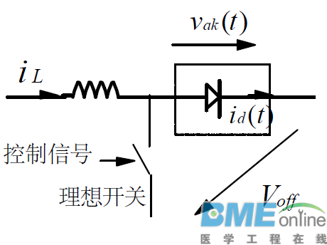 功率二极管的正向导通等效电路 (1):等效电路 ![]() (2):说明: 二极管正向导通时可用一电压降等效,该电压与温度和所流过的电流有关,温度升高,该电压变小;电流增加,该电压增加。详细的关系曲线可从制造商的手册中获得。 功率二极管的反向截止等效电路(1):等效电路 ![]() (2):说明: 二极管反向截止时可用一电容等效,其容量与所加的反向电压、环境温度等有关,大小可从制造商的手册中获得。 功率二极管的稳态特性总结 (1):功率二极管稳态时的电流/电压曲线 ![]() (2):说明: 二极管正向导通时的稳态工作点: ![]() 当Vin >>Vd 时,有: ![]() 而Vd对于不同的二极管,其范围为 0.35V~2V。 二极管反向截止时的稳态工作点: Id≈0,Vd = -Vin (3):稳态特性总结: -- 是一单向导电器件(无正向阻断能力); -- 为不可控器件,由其两断电压的极性控制通断,无其它外部控制; -- 普通二极管的功率容量很大,但频率很低; -- 开关二极管有三种,其稳态特性和开关特性不同: -- 快恢复二极管; -- 超快恢复,软恢复二极管; -- 萧特基二极管(反向阻断电压降<<200V,无反向恢复问题); -- 器件的正向电流额定是用它的平均值来标称的;只要实际的电流平均值没有超过其额定值,保证散热没问题,则器件就是安全的; -- 器件的通态电压呈负温度系数,故不能直接并联使用; -- 目前的 SiC 功率二极管器件,其反向恢复特性非常好。 功率二极管的开通和关断过程原理 (1):开通和关断过程实验电路 ![]() (2):二极管两端的电压和流过的电流: ![]() (3):开关过程原理: 开通过程[ t1 ~ t2 ]: --- 在 t1 前,二极管工作于截止状态,t1 时,理想开关关断,二极管的电流开始上升,对反偏二极管的结电容充电,使二极管的电压也开始上升,因PN 结耗尽区的工作机理(详细见半导体物理),使电压的上升比电流的上升要慢很多,电压正偏后,还会有一个几伏-几十伏的正向电压峰值,然后才进入稳定的正向导通状态。 关断过程[ t3 ~ t5 ]: --- 在 t3 前,二极管工作于导通状态,t3 时,理想开关开通,二极管的电流开始下降,因为少子电荷在正向电流降为零时仍存在,故二极管的电压仍维持正偏,为使其承受反向阻断的能力,必需将这些少子电荷抽掉,t3-t4 是抽走反向电荷的阶段,在t4时刻,二极管可开始反向阻断,t4-t5则是对二极管结电容(耗尽区)进行充电的过程,直到二极管完全承受外部所加的反向电压,进入稳定的反向截止状态。 实际的开通过程较短,分析时一般可忽略。通常可只分析关断过程,器件商会给出反向恢复时间和反向恢复电荷等参数。 功率二极管的功率损耗公式 (1):导通损耗: ![]() (2):容性开通损耗: ![]() (3):开关损耗: 开通损耗:通常可忽略 关断损耗:无公式,但存在。 对于低电压输出的开关电源,二极管的最大损耗是导通损耗。 功率二极管的选择原则与步骤 (1):选择原则 (A):根据电源规格,设计的工作频率等,合理选择: -- 高电压应用,当选用快恢复和超快恢复二极管; -- 15V 以下电源中的输出整流二极管应尽可能选萧特基; (B):选择时,如工作电流较大,则在相同的器件额定参数下, -- 应尽可能选择正向导通电压小的二极管; -- 应尽可能选择反响恢复快或软恢复的二极管; -- 应尽可能选择萧特基二极管。 (2):选择步骤 (A):根据电源规格,计算所选变换器中二极管的稳态参数: -- 反向阻断电压最大值; -- 最大的正向电流平均值; (B):从器件商的DATASHEET 中选择合适的二极管,可多选一些以便实验时比较; (C):从所选的二极管的其它参数,如正向通态压降,反向恢复时间等等,估算其工作时的最大损耗,与其它元器件的损耗一起,估算变换器的效率; (D):由实验选择最终的二极管器件。 特别推荐:牛人居然把功率MOS剖析成这样,很难得的资料!