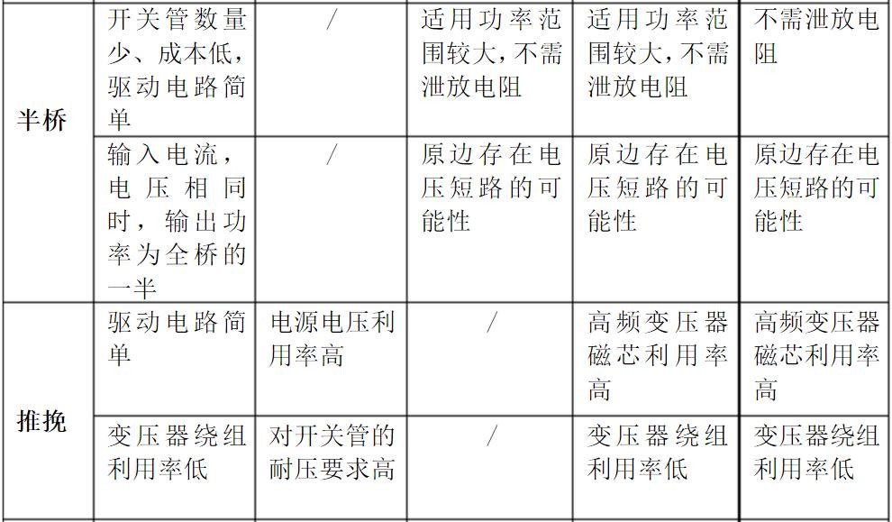 优缺点列表 ![]() ![]() ![]() ![]() ![]() 适用场合分析: 全桥:当输出相同功率时,半桥式电路的输入电流就要是全桥式电路的2倍;换句话说,如果他们的开关电流一样,电源输入电压也相等,半桥式的输出功率将是全桥式的一半。因此全桥式电路可用于大功率的逆变电路,通常使用在1KW以上超大功率开关电源电路中。 半桥:半桥式电路不适用于大功率的逆变电路。这种电路常常被用于各种非稳压输出的DC变换器,如电子荧光灯驱动电路中。 推挽:推挽电路适用于低电压大电流的场合,广泛应用于功放电路和开关电源中。 正激:就是只有在开关管导通的时候,能量才通过变压器或电感向负载释放,当开关关闭的时候,就停止向负载释放能量。结构简单,省掉了一个和变压器体积大小差不多的电感,而在中小功率电源中得到广泛的应用。用在150瓦到几百瓦之间。 反激:反激式电源功率只能做到几十瓦,输出功率超过100瓦就没有优势,实现起来有难度。 最全 PFC实战视频教程120讲60小时可能是史上完整的PFC视频教程(共计时长:120讲 60小时)第一部分:开关电源BUCK部分(30小时)一是基于PTS5430芯片的Buck电路;二是基于分立器件去搭Buck电路;三基于LNK306芯片的BUCK电路。第二部分:BOOST部分(10小时)基于UC3842电源芯片的Boost电路。第三部分:功率因素校正(PFC)部分(20小时)基于NCP1654芯片的PFC部分