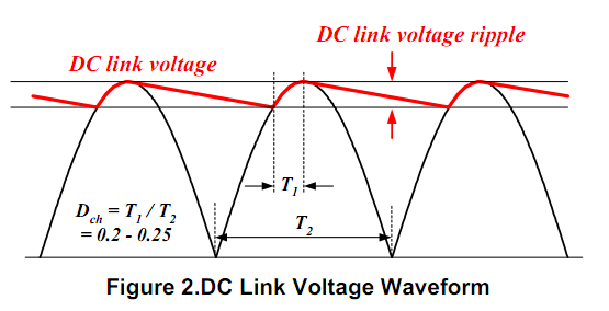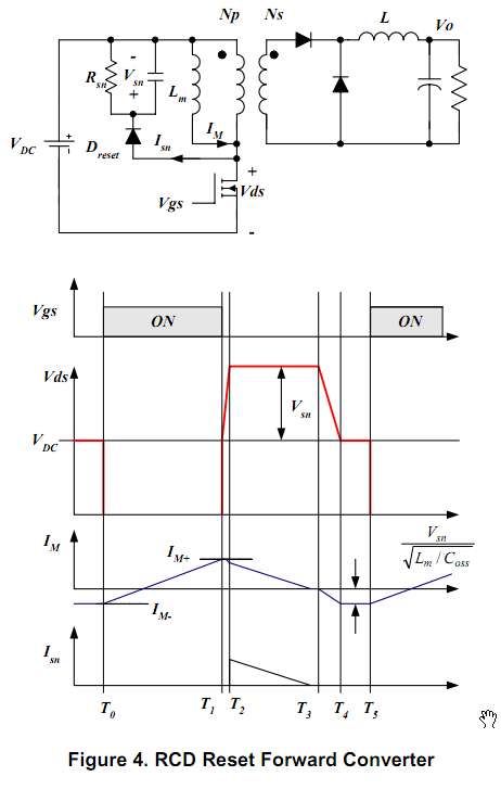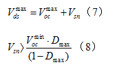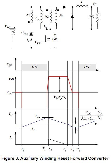 步骤一 确定系统对象![]() 图1 线性电源范围 ![]() 电压倍压电路如图1所示,通常是用于正激式电路,在普通电压输入的情况下。所以最小的线性电压是实际电压的2倍。 线性频率fL 最大输出功率P0 预计功率:这是需要估计这功率转换器的效率去计算出这最大的输入电压。如果无法参考资料,设Eff=0.7~0.75,用于低电压输出的设备;设Eff=0.8~0.85,用于高电压输出的设备。 确定的估计效率,这最大的输出功率是 ![]() 基于输入最大功率,选择适合的开关芯片。因为MOSFET管的两端电压是转换器的两倍电压,一个额定电压是800V的开关芯片,MOS管就可用于一般的电压输入。开关芯片的种类的额定功率已经在设计软件之内。 步骤二 确定DC电容()和DC电压范围 ![]() 图2 这最大的DC电压(DC link voltage)波纹是: ![]() Dch是是链电容(DC link capacitor)占空比,如图2,通常值为0.2。 ![]() 用于倍压器的两个电容要串联,每个电容值是方程(2)中所需电容的2倍。 在已知的最大电压波纹,那么这最小和最大的直流链电压(DC link voltage)是: ![]() 步骤三 确定变压器重置方式和最大占空比(Dmax) 正激式开关电源一个固有的限制,在MOSFET关闭的时候,就是变压器必须重置。因此,额外的重置方案应该被纳入。 现有两个重置方案: a. 辅绕组重置 该方案有益于效能,因为能量被储存在磁化电感中,且能量会释放回输入电路中。 但是额外的绕组会使得变压器的构造更复杂。 ![]() 图3 MOSFET管上最大的电压和最大占空比是: ![]() Np和Nr和分别分别是初级(primary winding)匝数(笔者注:初级=主绕组)和辅绕组匝数。 由方程(5)(6)可得,当Dmax逐渐减少,在MOSFET管上最大的电压会跟着减少。然而,减小的Dmax导致在次边的电压应力上升。因此,在一般输入电压下,设定Dmax=0.45和Np和Nr是比较合适的。 在辅边重置电路中,开关芯片内部已经限制占空比低于50%,用于阻止磁饱和现象发生在变压器上。 b. RCD重置 图4画出带有RCD重置的正激式简化电路图。缺点是储存在磁电感中的能量被消耗。在RCD缓冲器中,不像辅绕组重置方案可以返还能量于输入电压中,但是,因为它简单,这方案广泛应用于许多预算有限的开关电源中。 ![]() 这最大的电压应力和缓冲器电容电压分别为: ![]() 因为缓冲器电容电压是固定不变的,而且几乎不受输入电压影响。所以当转换器工作电压在幅度较小的情况下,MOSFET管两端电压可以低些,这是相对于辅绕组重置方案而言的。 对于辅组重置方案而言,RCD重置方案另外一个优点是:这可以把占空比设置到最大,大于50%;而相对地,MOSFET管两端因此减轻了次级的电压应力。 而相对辅边绕组重置方案而言,MOSFET两端电压较其低,从而减轻了次级的电压应力。 步骤四 确定输出电感电流的纹波因素 ![]() 图5 给出输出电感的电流。 这电流因素定义为:kRF=△I/2I0;是最大输出电流。在大多数实际设计当中,设kRF=0.1~0.2一旦纹波因素确定,那么MOSFET管的rms电流(电流有效值)就如下: ![]() 检查MOSFET管最大峰值(Idspeak)是否低于开关芯片的脉冲电流(峰峰值电流)的限制. 步骤五 确定变压器合适的磁芯和最小主绕组匝数,以确防止磁芯饱和 事实上,磁芯最初的选择是受原材料所限制的,因为实在太多可变因素了。其中一种方法去选择合适的磁芯是查阅磁芯制造商的磁芯选择指南。如果没有合适的参考资料,用以下的公式作为一个开始点: ![]() AW是空窗面积,AE是磁芯的横截面积(单位mm2 )。 ![]() 确定了磁芯后,变压器主绕组最小的匝数是(能避免磁饱和): ![]() 步骤六 确定变压器各绕组匝数 首先,确定主边(初级)和反馈控制次边(次级)的匝数比,以作为参考。 ![]() Np和Ns1分别是主绕组的匝数和参考输出绕组匝数,Vo1是输出电压,VF1是输出端的二极管管压降。 然后,确定合适的Ns1匝数(取整数),那么Np就取比Np.min大的数值,见公式(14)。 主边电感值是: ![]() 是AL-value值(电感系数)在无间隙的情况下(nH/turn2) n-th输出的匝数是 ![]() VO(n)是输出电压,而VF(n)是第n个输出(n-th)的二极管管压降。 下一步是确定VCC(笔者注:VCC是芯片端口名)绕组的匝数。VCC绕组的匝数是由不同重置方案而定。 (a)辅绕组重置: 若选取辅绕组重置方案,则VCC绕组线圈是: ![]() V*CC是标称电压(nominal voltage),VFa是二极管管压降。当取用辅绕组重置方案时,因为VCC与输入电压成比例,所以应该把V*CC设为等于VCC开启电压,以此去避免在正常工作中产生过压保护。 (b)RCD重置: RCD重置法,VCC绕组线圈数是: ![]() V*CC是标称电压(即额定电压nominal voltage),因为取用RCD重置方案,VCC几乎是一个常量,所以V*CC设为比VCC开启电压高2~3V。 步骤七 基于有效电流(rms current)确定每个变压器的绕线直径 第n个线圈的有效电流值 ![]() IO(n)是第n个最大输出电流。 如果用辅绕组重置法,那么辅绕组的有效电流是 ![]() 当绕线比较