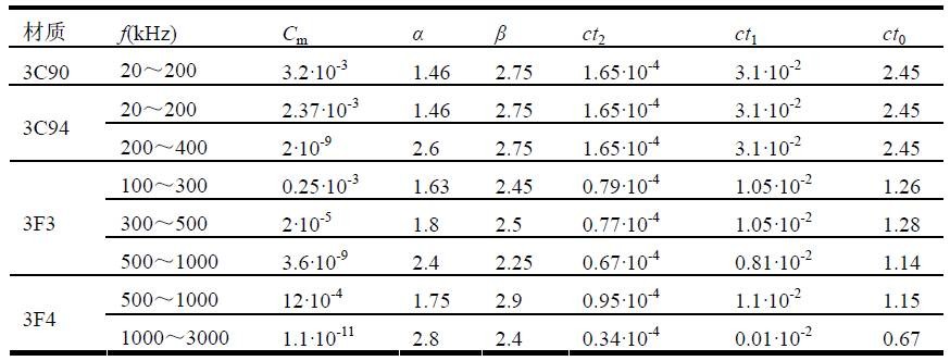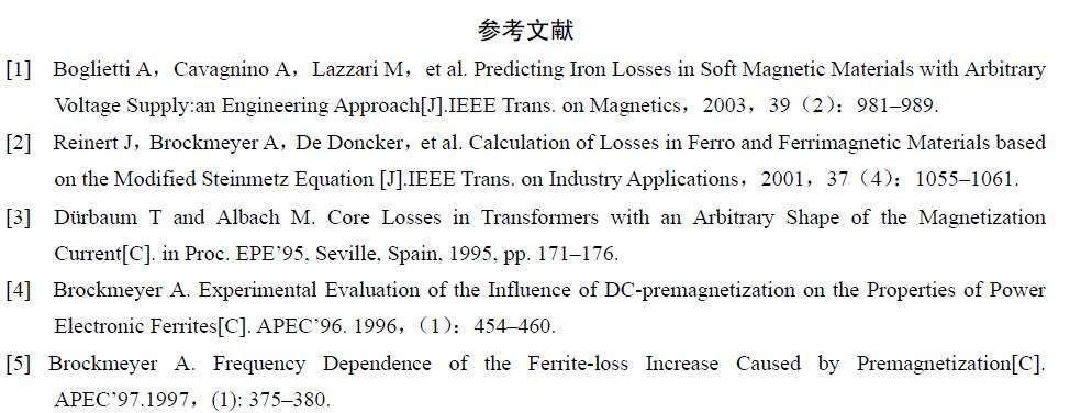 1.引言 磁性元件是开关电源设备中的重要元件,它对开关电源设备的体积、效率有很大影响。在高频下,磁性元件损耗占整机的比重很大。因此对磁性元件的损耗进行相关研究是十分重要的。 磁芯损耗与磁性材料特性和工作频率等密切相关。在交流磁化过程中,磁芯损耗功率(Pv)由磁滞损耗(Ph)、涡流损耗(Pe)和剩余损耗(Pc)组成。磁滞损耗(Ph)是磁性材料在磁化过程中,磁畴要克服磁畴壁的摩擦而损失的能量,这部分损失最终使磁芯发热而消耗掉。单位体积磁芯损耗的能量正比于磁滞回线包围的面积。每磁化一个周期,就要损耗与磁滞回线包围面积成正比的能量,所以可以得出:磁滞曲线面积越小,磁滞损耗就越小;频率越高,损耗功率越大。涡流损耗(Pe)是因磁芯材料的电阻率不是无限大,有一定的电阻值,在高频时还是会由于激磁磁场在磁芯中产生涡流而导致损耗。剩余损耗(Pc)是由于磁化弛豫效应或磁性滞后效应引起的损耗。所谓弛豫是指在磁化或反磁化的过程中,磁化状态并不是随磁化强度的变化而立即变化到它的最终状态,而是需要一个过程,这个‘时间效应’便是引起剩余损耗的原因。本文对高频下磁芯损耗的计算进行了研讨。 2.磁芯损耗的经典计算方法 前面对磁芯损耗的构成进行了分析,磁芯损耗功率(Pv)由磁滞损耗(Ph)、涡流损耗(Pe)和剩余损耗(Pc)组成: ![]() 对于软磁铁氧体,文献[1]分别给出了正弦波形激励下Ph,Pe,Pc 的计算模型,但并不适合工程上的应用。在一个世纪以前Steinmetz 总结出一个实用于工程计算磁芯损耗的经验公式: ![]() 这个公式表明单位体积的损耗Pv 是重复磁化频率和磁通密度的指数函数。Cm ,α 和β 是经验参数,两个指数都可以不为整数,一般的1<α<3 和 2<β<3。对于不同的材质,生产厂家一般会给出其相应的一套参数,但公式和参数仅仅适用于正弦的磁化情况,这是该经验公式应用于开关电源领域的一个主要缺陷。 3.Steinmetz 经验公式的应用与调整 3.1 频率和温度的影响 借助 Steinmetz 模型计算磁损在工程上的应用十分广泛,然而该模型的参数随频率变化,也就是说用来反映频率和最大磁感应强度与磁损关系的幂指数α 和β 的拟合值在不同频率时是不同的,同时温度对磁芯损耗的影响也很大。 图1给出了飞利浦公司的3F3 材料单位体积损耗和温度的关系。既然磁芯损耗随温度的变化而变化,那么计算公式就应该考虑温度的影响。但式(2)中没有明显体现温度影响的参数。为此,一些产商在Steinmetz 经验公式的基础上进行改进,把温度和频率的影响包括在一个更加通用的公式中,比如下式就是飞利浦公司提出的计算正弦波下的单位体积的磁芯损耗公式(W/m3)。 ![]() 其中: 式(3)中参数Cm、α、β 反映了频率对磁芯损耗的影响。而参数ct0、ct1、ct2,和T 体现了温度的影响,温度的总体影响用参数CT 来表示。表1 为飞利浦公司提供的材料的相应参数。应用式(3)和(4) ,Steinmetz 经验公式(2)可以用来计算正弦波励磁时,不同频率和温度下磁芯材料的单位体积损耗。 ![]() 表1 飞利浦公司常用磁材料的单位体积损耗(W/m^3)的参数列表 ![]() 3.2 非正弦激磁的影响 前人试图通过对任意的非正弦波进行傅立叶展开,来克服Steinmetz 模型不能应用于非正弦激磁下的磁芯损耗计算的缺陷,但叠加的方法只适合线性系统,对与非线性的磁材料而言,用傅立叶展开再叠加的方法来计算磁芯损耗是不正确的。 式(2)表达的Steinmetz 模型被证明是最有用的计算磁芯损耗的工具,该公式只需要三个参数,而且生产厂家一般都提供这些参数。对于正弦的磁通波形,用该式进行磁芯损耗计算可以得到较高的精度和应用上的便利。因此值得把该式扩展到非正弦的情况下。为此Reinert 提出了修正的Steinmetz 经验公式来计算磁芯损耗[2]。已经得到证明的一个事实是:宏观的重复磁化速率和磁芯损耗有直接关系。因此式(2)的扩展任务主要就是把式(2)中的频率f 用物理上的参数dM/dt 来代替,而dM/dt 是和磁通变化率dB/dt 相对应的。 首先,对磁通变化率dB/dt 在一个完整的磁化周期里进行平均,得到下式: ![]() 其中△B=Bmax-Bmin,式(5)可变为: ![]() 文献[3]指出,上式可以通过转化因子:2/△Bπ^2 得到一个等效的正弦重复磁化频率feq: ![]() 和Steinmetz 经验公式相似,可以推出一个磁化周期的能量损耗表达式如下: ![]() 如果磁化周期为Tr=1/fr,则单位体积的损耗为(W/m^3)可表示为: ![]() 式(9)称为修正的Steinmetz 经验公式,该式可用于任意的非正弦磁化波形。注意的是公式中的参数Cm ,α 和β 要根据feq 来选择。 3.3 直流偏置的影响 Brockmeyer[4-5]通过比较不同磁感应强度的交流分量BAC和直流分量BDC作用下的磁芯损耗发现,损耗随两个分量的增加而增加。同时发现只有当反复磁化过程不会因为直流偏置而趋于饱和,并且当交流磁感应量非常小时,直流偏置对反复磁化造成的磁芯损耗的影响才可忽略。考虑直流偏置磁化的影响,Brockmeyer通过调整损耗参数Cm,得到下述经验公式: ![]() 其中: ![]() 其中:K1,K2 为常数,用来表征磁性材料的直流偏置特性,可通过不同频率和磁化状态下所测量的磁芯损耗拟合得到。 4.当前存在的问题和今后的工作展望 在前面的叙述中,指出了磁芯损耗和温度密切相关,并指出了在不同温度下,磁芯损耗的计算方法。但在实际工作中磁芯的温度并不能事先知道,为了准确的计算磁芯损耗,应该建立磁性元件的热模型,把磁