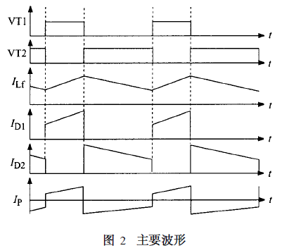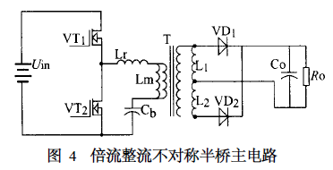 引言 不对称半桥具有结构简单,控制方便和无需辅助器件就可以实现软开关等优点,所以在中小功率的应用场合很有优势。但是这种不对称的控制方法却导致变换器中的隔离变压器励磁电流具有直流分量。这就要求变压器必须有足够能力承受直流偏磁,通常对于铁氧体磁芯要开一定的气隙以防止饱和。但是变压器开气隙,会令变压器的励磁电感减小,从而增加励磁电流和损耗。 本文详细分析了不对称半桥变压器直流偏磁的产生机理,并且探讨了两种解决偏磁问题的方法。 1 、不对称半桥结构分析 传统的半桥采用两路相位相差180°,脉冲宽度相同的驱动信号分别驱动上下两个开关管。不对称半桥并没有改变传统半桥的主电路结构,而是采用两路互补的驱动信号分别驱动开关管。当一个开关的占空比为D ,则另外一个开关管占空比为1 - D(忽略死区时间) 。这样利用变压器的漏感或者串联谐振电感可以实现两个开关管的零电压开通。图1为不对称半桥的主电路结构。Lr 为谐振电感, Lm为变压器原边励磁电感,Lf 为输出滤波电感, T为理想变压器。 ![]() 在电流连续模式下,输入输出电压关系为: ![]() 这里n = ns / np 为次级绕组和初级绕组的比值,如果次级采用平衡绕组,则两个次级绕组和初级绕组的比值为n1 = n2 = n。从式(1)中可知,当占空比D = 0. 5的时候, Uo 最大。所以通常把D 限制在<0. 5或者> 0. 5。 2、变压器直流偏磁机理分析 对于对称半桥,在稳态工作条件下,变压器是双向对称磁化的。也就是,励磁电流没有直流分量。所以,对称半桥的变压器无需开气隙。但是,不对称控制下的半桥变压器的励磁电流具有直流分量,而且与两个开关管占空比的不对称度和输出电流有关。 图2为两个开关管VT1和VT2的驱动波形(忽略死区) 、次级滤波电感的电流波形、两个整流二极管的电流波形以及理想变压器的原边电流。VT1和VT2的占空比分别为D 和12D。电感电流的平均值为输出电流Io。两个整流管的电流ID1和ID2 ,也就是两个变压器次级的输出电流,分别在其占空时间D和12D中,平均值也为Io。依据理想变压器的电流关系,可以得到理想变压器原边电流Ip。从其波形中可以得知, Ip 具有直流分量。而对于半桥电路,变压器原边串了一个电容Cb。在稳态工作情况下,只有交流电流能通过Cb ,从而励磁电感Lm 上电流Im 也必然会有直流分量,其值为 ![]() 从式(2)可以看出, Imdc与Io 和D 有关,当D 等于0. 5的时候Imdc = 0;当D等于0和1的时候Imdc达到最大。 ![]() 通常开关电源变压器多采用铁氧体磁芯。铁氧体磁芯虽然磁导率高,但是饱和磁密低,所以承受直流偏磁能力很弱。图3为铁氧体磁芯不加气隙和加气隙的磁滞回线。 对于磁化强度: ![]() 所以从图3可以看到不加气隙的铁氧体磁芯能承受的直流电流非常小,所以只有采取加气隙的方式来解决这个问题。但是气隙会导致励磁电流增加,降低了变压器的利用率,不利于减小变压器体积和提高效率。 ![]() 3、解决方法 (1)不对称绕组解决偏磁问题 对于对称绕组的不对称半桥,只有在D = 0. 5的时候,变压器才不会出现直流偏磁。然而实际情况中,让变换器工作在D = 0. 5是不可能的。采用不对称绕组,也就是两个次级相对于初级的变比不同。假设一个为n1 ,另外一个为n2 ,则变压器励磁电流直流分量为: ![]() (2)次级倍流整流解决偏磁问题 除了采用次级不对称绕组之外,还可以采用次级倍流整流的方式来解决偏磁问题。图4为倍流整流的不对称半桥主电路。该电流次级采用两个滤波电感L1 和L2 ,比较适合大电流输出的场合。 ![]() 对于次级倍流整流的不对称半桥的输出电压为: ![]() 这里n为变压器次级和初级的匝比。若整流电感L1 和L2 的平均电流分别是IL1和IL2 ,则变压器次级输出电流的平均值为: ![]() 而对于电感L1 和L2 ,两者的平均电流是根据其等效串联电阻RL1和RL2分配的: ![]() 把式(10)代入式(11) ,得到 ![]() 也就是说满足式(12 )就可以消除变压器的直流偏磁。 4、仿真分析 利用仿真软件saber对三种电路分别做仿真。输入电压为300 V,输出电压为15 V,输出电流为10A。占空比D = 0. 3。图5为仿真后变压器原边励磁电感的电流,分别为:次级对称绕组n = 1 /8, Imdc =456 mA;次级不对称绕组n1 = 1 /6, n2 = 1 /14 Imdc =28. 5 mA;次级倍流整流: n = 1 /4, RL1 = 0. 07Ω, RL2= 0. 03Ω, Imdc = 0. 69 mA。 ![]() 5. 结论 传统不对称半桥的变压器因为有直流偏磁,所以变压器的利用率不高。本文从理论上分析了直流偏磁产生的原因,并且探讨了次级不对称绕组和次级倍流整流这两种方法来解决偏磁问题。最后通过仿真验证了两种方法的可行性。