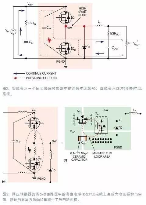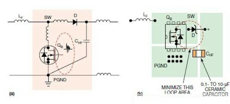 1.引言 一个良好的布局设计可优化效率,减缓热应力并尽量小走线与元件之间噪声作用。这切都 源于设计人员对电中流传导路径以及信号的理解。 当一块原型电源板首次加时,最好的情况 是它不仅能工作而且还安静、发热低。然这种并不多见。 开关电源的一个常见问题是 “不稳定 ”的开关波形。有些时候,抖动处于声段磁性元件会产生 出音频噪声。如果问题在印刷电路板的布局上, 要找原因可能会很困难此开关电源 设计初期的 正确 PCB布局 就非常关键。 电源设计 者要很好地理解技术细节,以及最终产品的功能需求。因此从电 路板设计项目一开始源设计者应就关键性电布局,与 PCB布局设计人员展开密切合作。 一个好的布局设计可优化电源效率,减缓热应力;更重要的是,它最大限度地减小了噪声,以及走线与元件之间的相互作用。为实现这些目标,设计者必须了解开关电源内部的电流传导路径以及信号流。要实现非隔离开关电源的正确布局设计,务必牢记以下这些设计要素。 2.布局规划 对一块大电路板上的嵌入dc/dc电源,要获得最佳的电压调节、负载瞬态响应和系统效率,就要使电源输出靠近负载器件,尽量减少PCB走线上的互连阻抗和传导压降。确保有良好的空气流,限制热应力;如果能采用强制气冷措施,则要将电源靠近风扇位置。 另外,大型无源元件(如电感和电解电容)均不得阻挡气流通过低矮的表面封装半导体元件,如功率MOSFET或PWM控制器。为防止开关噪声干扰到系统中的模拟信号,应尽可能避免在电源下方布放敏感信号线;否则,就需要在电源层和小信号层之间放置一个内部接地层,用做屏蔽。 关键是要在系统早期设计和规划阶段,就筹划好电源的位置,以及对电路板空间的需求。有时设计者会无视这种忠告,而把关注点放在大型系统板上那些更“重要”或“让人兴奋”的电路。电源管理被看作事后工作,随便把电源放在电路板上的多余空间上,这种做法对高效率而可靠的电源设计十分不利。 对于多层板,很好的方法是在大电流的功率元件层与敏感的小信号走线层之间布放直流地或直流输入/输出电压层。地层或直流电压层提供了屏蔽小信号走线的交流地,使其免受高噪声功率走线和功率元件的干扰。 作为一般规则,多层PCB板的接地层或直流电压层均不应被分隔开。如果这种分隔不可避免,就要尽量减少这些层上走线的数量和长度,并且走线的布放要与大电流保持相同的方向,使影响最小化。 图1a和1c分别是六层和四层开关电源PCB的不良层结构。这些结构将小信号层夹在大电流功率层和地层之间,因此增加了大电流/电压功率层与模拟小信号层之间耦合的电容噪声。 ![]() 图中的1b和1d则分别是六层和四层PCB设计的良好结构,有助于最大限度减少层间耦合噪声,地层用于屏蔽小信号层。要点是:一定要挨着外侧功率级层放一个接地层,外部大电流的功率层要使用厚铜箔,尽量减少PCB传导损耗和热阻。 3.功率级的布局开关电源电路可以分为功率级电路和小信号控制电路两部分。功率级电路包含用于传输大电流的元件,一般情况下,要首先布放这些元件,然后在布局的一些特定点上布放小信号控制电路。 大电流走线应短而宽,尽量减少PCB的电感、电阻和压降。对于那些有高di/dt脉冲电流的走线,这方面尤其重要。 图2给出了一个同步降压转换器中的连续电流路径和脉冲电流路径,实线表示连续电流路径,虚线代表脉冲(开关)电流路径。脉冲电流路径包括连接到下列元件上的走线:输入去耦陶瓷电容CHF;上部控制FET QT;以及下部同步FET QB,还有选接的并联肖特基二极管。 ![]() 图3a给出了高di/dt电流路径中的PCB寄生电感。由于存在寄生电感,因此脉冲电流路径不仅会辐射磁场,而且会在PCB走线和MOSFET上产生大的电压振铃和尖刺。为尽量减小PCB电感,脉冲电流回路(所谓热回路)布放时要有最小的圆周,其走线要短而宽。 高频去耦电容CHF应为0.1μF~10μF,X5R或X7R电介质的陶瓷电容,它有极低的ESL(有效串联电感)和ESR(等效串联电阻)。较大的电容电介质(如Y5V)可能使电容值在不同电压和温度下有大的下降,因此不是CHF的最佳材料。 图3b为降压转换器中的关键脉冲电流回路提供了一个布局例子。为了限制电阻压降和过孔数量,功率元件都布放在电路板的同一面,功率走线也都布在同一层上。当需要将某根电源线走到其它层时,要选择在连续电流路径中的一根走线。当用过孔连接大电流回路中的PCB层时,要使用多个过孔,尽量减小阻抗。 图4显示的是升压转换器中的连续电流回路与脉冲电流回路。此时,应在靠近MOSFET QB与升压二极管D的输出端放置高频陶瓷电容CHF. ![]() 图5是升压转换器中脉冲电流回路的一个布局例子。此时关键在于尽量减小由开关管QB、整流二极管D和高频输出电容CHF形成的回路。 ![]() 图5 图5,本图显示的是升压转换器中的热回路与寄生PCB电感(a);为减少热回路面积而建议采用的布局(b)。 图6和图7(略)提供了一个同步降压电路的例子,它强调了去耦电容的重要性。图6a是一个双相12VIN、2.5VOUT/30A(最大值)的同步降压电源,使用了LTC3729双相单VOUT控制器IC.在无负载时,开关结点SW1和SW2的波形以及输出电感电流都是稳定的(图6b)。但如果负载电流超过13A,SW1结点的波形就开始丢失周期。负载电流更高时,问题会更恶化(图6c)。 ![]() 在各个通道的输入端增加两只1μF的高