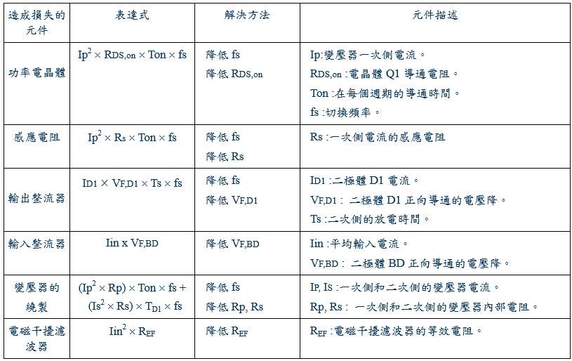 开关电源十五种损耗分析与对策 以图一中典型的反激转换器(flyback converter)为例,去分析电源转换器的损耗。因为反激转换器低价位和广泛的输入范围的特性,在实际应用层面受到欢迎。对一个开关电源而言, 主要的损耗包括了传导损耗(conduction loss)和切换损耗(switching loss),以及由控制电路所造 成的损耗。表二、三、四分别对这些主要损耗,包括主要的传导损耗和切换损耗,控制电路 所造成的损耗,列出了大约的估算,和常用的解决对策。 ![]() 表二 主要的开关损耗 ![]() 表三 主要的传导损耗 ![]() 表四 控制电路的主要损耗 ![]() 可以很明显的发现无论是传导损耗或切换损耗,都和切换频率有很密切的关系。降低切 换频率可以有效的降低损耗,特别是在轻载时。但由波宽调变产生器所产生的波宽必须被控 制,免得造成磁性元件的饱和。而且,反激转换器的输出能量可以表示为 Po = (Vdc^2 × Ton^2) /(2 × Lp × T) ×η,其中η代表转换效率。在轻载时,导通时间(Ton)很短暂,增长切换週期(T), 或降低切换频率(fs),是一个很直觉的想法。 点击左下角“阅读原文”与四万电源工程师一起学习电源知识