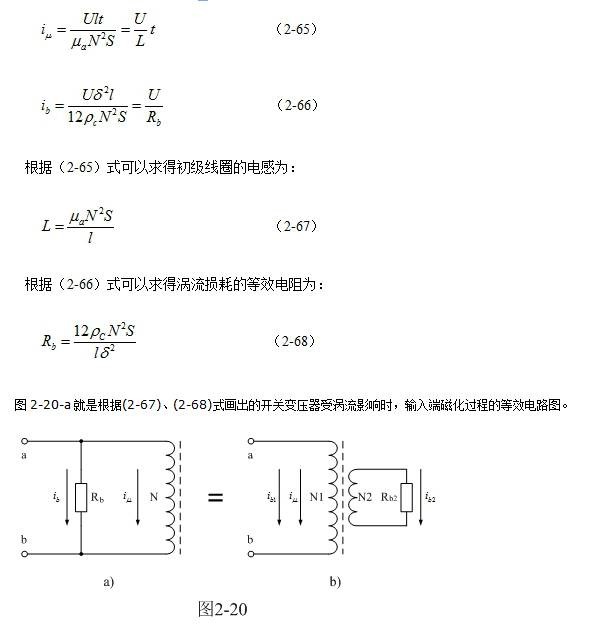 (连载62)开关电源变压器涡流损耗分析-part2 (连载01)开关电源的基本工作原理 (连载02)串联式开关电源输出电压滤波电路 (连载03)串联式开关电源储能滤波电感的计算 (连载04)串联式开关电源储能滤波电容的计算(2) (连载05)反转式串联开关电源 (连载06)反转式串联开关电源储能电感的计算 (连载07)反转式串联开关电源储能滤波电容的计算 (连载08)并联式开关电源的工作原理 (连载09)并联式开关电源输出电压滤波电路 (连载10)并联开关电源储能电感的计算 (连载11)单激式变压器开关电源 (连载12)单激式变压器开关电源工作原理 (连载13)正激式变压器开关电源 (连载14)正激式变压器开关电源的优缺点 (连载15)正激式变压器开关电源电路参数的计算 (连载16)正激式开关电源变压器参数的计算 (连载17)正激式开关电源变压器初、次级线圈匝数比的计算 (连载18)反激式变压器开关电源part1 (连载19)反激式变压器开关电源part2 (连载20)开关电源电路的过渡过程part1 (连载21)开关电源电路的过渡过程part2 (连载22)反激式变压器开关电源电路参数计算 (连载23)反激式开关电源变压器参数的计算 (连载24)反激式开关电源变压器初级线圈电感量的计算 (连载25)反激式变压器开关电源的优缺点 (连载26)双激式变压器开关电源part1 (连载27)双激式变压器开关电源part2 (连载28)整流输出推挽式变压器开关电源 (连载29)推挽式变压器开关电源储能滤波电感、电容参数的计算 (连载30)推挽式变压器开关电源储能滤波电容参数的计算 (连载31)推挽式开关电源变压器参数的计算 (连载32)推挽式开关电源的优缺点 (连载33)半桥式变压器开关电源 (连载34)交流输出半桥式变压器开关电源part1 (连载35)交流输出半桥式变压器开关电源part2 (连载36)交流输出单电容半桥式变压器开关电源part1 (连载37)交流输出单电容半桥式变压器开关电源part2 (连载38)单电容半桥式变压器开关电源输出电压 (连载39)整流输出半桥式变压器开关电源 (连载40)半桥式开关电源储能滤波电感、电容参数的计算 (连载41)半桥式开关电源变压器参数的计算 (连载42)半桥式变压器开关电源的优缺点 (连载43)全桥式变压器开关电源 (连载44)整流输出全桥式变压器开关电源 (连载45)全桥式开关电源变压器参数的计算 (连载46)全桥式变压器开关电源的优缺点 (连载47)开关电源主要器件之开关电源变压器 (连载48)开关变压器的工作原理 (连载49)脉冲序列对单激式开关电源变压器铁芯的磁化part1 (连载50)脉冲序列对单激式开关电源变压器铁芯的磁化part2 (连载51)变压器铁芯的初始磁化曲线 (连载52)单激式开关电源变压器的伏秒容量与初级线圈匝数的计算 (连载53)单脉冲序列对双激式开关电源变压器铁心的磁化 (连载54)双激式开关电源变压器伏秒容量与初级线圈匝数的计算 (连载55)各种波形电源变压器初级线圈匝数的计算 (连载56)双激式开关电源变压器存在的风险 (连载57)开关电源变压器磁滞损耗分析-part1 (连载58)开关电源变压器磁滞损耗分析-part2 (连载59)开关电源变压器铁芯磁滞回线测量-part1 (连载60)开关电源变压器铁芯磁滞回线测量-part2 (连载61)开关电源变压器涡流损耗分析-part1 当铁芯或铁芯片表面磁场强度的最大值Hm高于磁场强度的平均值Ha时,其差值为: ![]() 该数值和磁场强度增量?H之比等于:μaδ2/12ρcτ ,它表征涡流的影响,并与平均导磁率μa及铁芯片厚度δ的平方成正比,与铁芯片材料的电阻率ρc及脉冲宽度τ成反比。 根据(2-62)式可知,铁芯或铁芯片表面的磁场由两个部分组成: (1)平均磁场,它随时间线性增长,由线圈中固定的电动势感应所产生; (2)常数部分,它不随时间变化,由补偿涡流的产生的去磁场所形成。 对应铁芯片表面的两部分磁场,我们可以把它们分别看成是由 和 两部分电流产生的。根据安培环路定律:磁场强度矢量沿任意闭合路径一周的线积分,等于穿过闭合路径所包围面积的电流代数和。以及磁路的克希霍夫定律:在磁场回路中,任一绕行方向上磁通势NI(N为线圈匝数,I为电流强度)的代数和恒等于磁压降 Hili(Hi 为磁场强度, li为磁路中磁场强度为Hi的平均长度)的代数和。即: Hm=N*i/l =N(iμ+ib)/l (2-64) (2-64)式中, l为磁回路的平均长度; i =iμ +ib , iμ为变压器线圈中的励磁电流; ib为因涡流影响使流过变压器线圈电流增加的电流。根据(2-62)式和(2-7)式求得: ![]() 图2-20-a中,Rb为涡流损耗等效电阻,N为变压器初级线圈。由此可以看处,由于受涡流损耗的影响,变压器铁芯被磁化时,相当于一个涡流损耗等效电阻Rb与变压器初级线圈N并联。图2-20-b是更形象地把涡流损耗等效成一个变压器次级线圈N2给损耗电阻Rb2提供能量输出,流过变压器次级线圈N2的电流 ,可以通过电磁感应在变压器初级线圈N1中产生电流ib1 。根据(2-66)式和图2-20,可求得变压器的涡流损耗为: ![]() (2-69)式中,Sl=Vc 为变压器铁芯的体积,S为变压器铁芯的面积, l为磁回路的平均长度, δ为铁芯片的厚度,N为变压器初级线圈匝数, ρc为铁芯片的电阻率,τ为脉冲宽度,?B为磁通密度增量。 由此,我们可以看出:变压器铁芯的涡流损耗,与磁感强度增量和铁芯的体积成正比,与铁芯片厚度的平方成正比,与电阻率及脉冲宽度的平方成反比。 值得注意的是,上面各式中代表面积S的属性,它既可以代表某一铁芯片的截面积,也可以代表变压器铁芯的总面积,当S变压器铁芯的总面积时,相当于