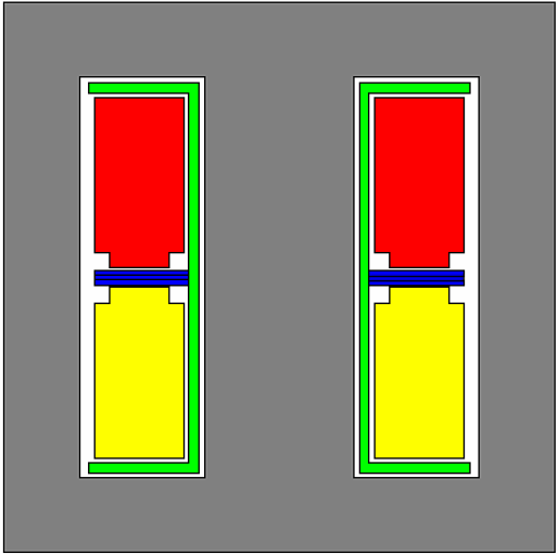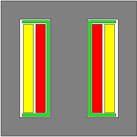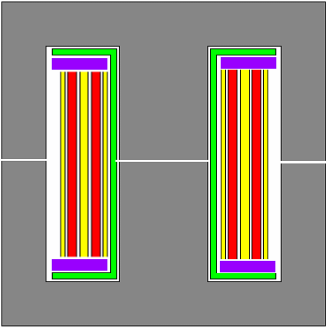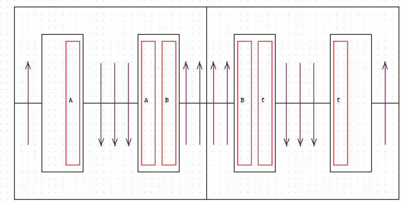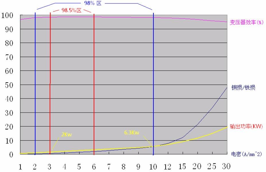 一、传统变压器篇 单路输出 Flyback 及常见的变压器绕组结构 ![]() ![]() 红色:初级绕组 紫色:辅助绕组 黄色:次级绕组 特点:辅助绕组位夹在初级、次级中间 缺点: 1, 临近效应很强,绕组交流损耗大 2, 初、次级间的漏感较大,吸收回路损耗较大,效率较低 优点: 1,工艺结构十分简单,易于制造 2,初级外层接电位静止的V+端,易于实现无Y 改进的 Flyback 变压器绕组结构(简易型) ![]() 红色:初级绕组 紫色:辅助绕组 黄色:次级绕组 特点:辅助绕组位于线包最里层,初级在中间、次级在最外边 缺点:临近效应很强,绕组交流损耗大 优点: 1,工艺结构十分简单,易于制造 2,初级外层接电位静止的V+端,易于实现无Y 3, 初次级间漏感较小,吸收回路损耗较小,效率较高 改进的 Flyback 变压器绕组结构(三明治型) ![]() 红色:初级绕组 紫色:辅助绕组 黄色:次级绕组 特点:辅助绕组位于线包最里层,然后分别是初级的一半,次级全部,初级的另一半; 缺点: 1, 次级临近效应很强,绕组交流损耗大 2,初级的一半绕组没有任何的静电位层供屏蔽用,无法实现无Y 优点: 1, 工艺结构复杂,不利于制造; 2, 初次级间漏感较小,吸收回路损耗较小,效率较高 3, 初级临近效应较小,绕组交流损耗小 Flyback 多路输出 L3 与L4 之间的漏感,引起交叉调整。 ![]() 实用的多路输出型 高压输出绕组叠在低压绕组之上,双线并绕降低交叉调整 ![]() 功率传输变压器(含正激、推挽、半桥、全桥) 合理的绕组结构, 层厚小于2Δ ![]() 红色:初级绕组 紫色:辅助绕组 黄色:次级绕组 实际变压器的模型 虚线内为理想变压器 ![]() 脉冲变压器信号传输失真 由于原边及幅边漏感,电阻分量的存在,脉冲在经过变压器后,产生延迟、斜率变缓、振铃、顶降 ![]() 脉冲电流的分解 脉冲电流由基波电流及各高次谐波电流组成 ![]() 占空比越小,基波分量越小,高次谐波分量越大,因此线径的选择(穿透深度*2)不能只考虑基波电流的频率 ![]() ![]() ![]() ![]() 输出功率与频率的关系(EE25 单端变换器为例) ![]() 理论上,对于指定的磁芯,在相同的磁密下,输出功率与频率呈正比,但实际上并非如此, 原因有: 1, 频率升高,穿透深度下降,需要用较小的线径,窗口利用率下降,且绕组层厚与穿透深度的比值增大,交流电阻大增,有效输出功率下降; 2, 频率增加,绝缘材料的耐压下降,为保证同样的绝缘强度,需要加大绝缘层厚度,进一步降低窗口利用率; 3, 频率到达某一程度后,磁芯损耗大增,需要适当降底磁通密度(具体请参考磁损表) LLC 变压器 LLC 电路结构 ![]() LLC 集成磁件 漏感由原边与副边之间的档墙宽度、磁芯的磁导率、以及中柱长度与窗口高度的比值决定 ![]() 红色:初级绕组 黄色:次级绕组 小漏感的 LLC 集成磁件 个别应用中,需要用到较小的漏感,挡墙的宽度较小,安全间距可利用下面的结构来满足。 ![]() 红色:初级绕组 黄色:次级绕组 其它减小漏感的方法: 1, 磁芯的磁导率,换用高导的磁芯,漏感会减小; 2, 减小中柱长度与窗口高度(指上图中窗口的水平方向)的比值,漏感会减小 3, 采用逆磁性材料代替顺磁性材料制作档墙 增大漏感的方法: 1, 换用低导的磁芯 2, 增大中柱长度与窗口高度的比值 3, 用弱铁磁性的材料制作档墙, 如混有磁粉的注塑垫片,可以大幅度降低档墙的占窗面积,增加变压器出力,具体实施需要考虑经济性; 大功率的 LLC 变压器 LLC 磁集成变压器的问题:由于初次级绕组产生的磁场是独立分布的,各自的临近效应很强,不利于大功率应用场合,而且气隙处的EMI 很不好处理,因此需要将漏感独立出去。 中功率的 LLC 集中参数变压器,按正弦变压器设计,可采用简单绕制工艺 ![]() 红色:初级绕组 黄色:次级绕组 大功率的 LLC 集中参数变压器,按正弦变压器设计,需要采用夹层工艺,中各初次级绕组磁场的磁场,降低临近效应,保证最小的交流电阻 ![]() 红色:初级绕组 黄色:次级绕组 二、高功率密度变压器 为了直观,我们将一个EE85 磁芯,在2000GS 磁密,25KHz 频率下,不同电流密度时的效率、输出功率,铜损铁损比绘在同一表格内(注意:因为宽度不够,电流密度在10 以上比例不同。) 可以发现,电流密度在3-6A/mm2 范围内,变压器效率达到98.5%以上,而要满足98%的效率,电流密度的范围达到2-10A/mm2。 由于铁损基本固定,而铜损与输出功率的平方成正比,因此高功率密度变压器的实现,主要是解决绕组的散热问题,但应用中的方向却是相反的,我们所见到的高功率密度变压器,都是将绕组的热量“闷”在磁件的内部,绕组的热阻比较大,不利于提高功率密度,如PQ,PM,以及平面变压器。 ![]() 高功率密度变压器的解决措施 思路:强制对绕组进行冷却 1、液冷法,低压绕组利用中空的管状铜材料制作,用微形液压泵为低压绕组提供冷却循环液,可用变压器油。高压绕组的热能,通过传导散发到低压绕组,由冷却液一起带走。 2、环形铜带绕组,低压绕组制成平面的环状,一个环为一匝,环的厚度为2~3 倍穿透深度,初级绕组线径为1~1.5 倍穿透深度,这样的组合交流电阻很小。图例中的 6 个环,,通过不同的铆接,可组合为6 匝,3 匝,2 匝及1 匝四种连接方式。环的倒角部份,通过云母片与散热器(可加风扇)连接散热,解决绕组的发热问题 ![]() ![]() 3, 环形变压器 环形变压器具有夸张的绕组散热面积,是一种很好的散热结构。但由于磁芯的最佳工作温度约90 度,要求绕组表面温度要适当小于90 度,否则磁芯温度会过高