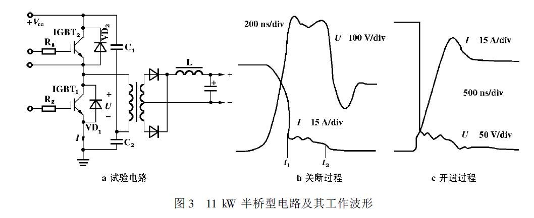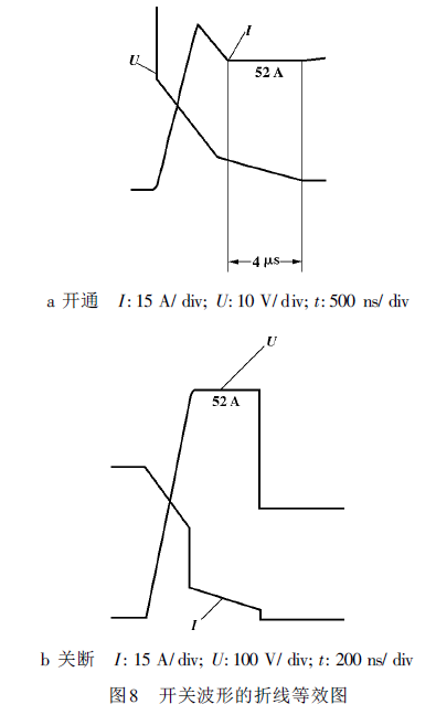 1 引言 在任何装置中使用IGBT 都会遇到IGBT 的选择及热设计问题。当电压应力和电流应力这2 个直观参数确定之后, 最终需要根据IGBT 在应用条件下的损耗及热循环能力来选定IGBT。通常由于使用条件不同, 通过IGBT 数据手册给出的参数不能确切得出应用条件下IGBT 的损耗。比较好的方法是通过测量行业确定IGBT 数据手册中参数的测量条件与实际应用环境的差别, 并介绍IGBT 的损耗的简单测量方法。 2 IGBT 参数的定义 厂商所提供的IGBT 开关参数通常是在纯感性负载下测量的, 图1 和图2 分别是IR 公司和TOSHIBA公司测量开关时间的电路和定义开关时间 的波形。其共同特点是: 开通处于续流状态的纯感性负载; 关断有箝位二极管的纯感性负载。有些数据手册还给出了开关过程的能量损失 , 也是在同样条件下测量的。 对于PWM 方式工作并使用变压器的开关电源, 其工作情况则与之区别很大。图3 是11 kW 半桥型电路及其工作波形, 使用的IGBT 为 GA75TS120U。由波形可见, 电流上升时间tr 约为500 ns, 下降时间t f 约为300 ns。但在数据手册中,GA75TS120U 的电流升降时间分别为t r= 100 ns,t f= 80 ns, 与实际工作情况差异较大。其原因主要在于以下2 个方面: ( 1) 开通时, 图3 中由于变压器漏感的存在, IGBT实际上开通了1 个零电流感性负载, 近似于零电流开通, 电流上升率受漏感充电速度的限制, 因而实际电流上升时间tr 不完全取决于IGBT。而数据手册中给出开通处于续流状态的纯感性负载, 开通瞬间, IGBT 既要承受电感中的电流, 还要承受续流二极管的反向恢复电流, 电流上升率则完全取决于IGBT 的开通速度。 ( 2) 关断时, 图3 中的IGBT 并非是在关断1 个纯感性负载, 而是关断1 个R - L 型负载( 变压器及其负载, 从变压器一次侧可等效为R -L 型负载) ,其电流的下降时间t f 要慢于关断带箝位的纯感性负载。并且, 对于纯感性负载, 只有当IGBT 的集电极电压上升到箝位值后, IGBT 的电流才开始下降( 见图1、图2 中波形) , 而电阻-电感性负载时, 集电极电压和电流几乎是同时变化的( 见图3b 波形) 。 由于上述原因, 图3 中IGBT 的t r、t f 均大于给定值, 但这并不意味着损耗的上升, 因为开关损耗还取决于开关过程中电压电流的"重叠"程度, 而图3中的"重迭"明显不如图1、图2 中严重, 因而整体损耗将下降。 ![]() ![]() ![]() 3 IGBT 损耗的测量 IGBT 损耗的测量实际上是通过对其工作电压和电流的测量和计算而得到的, 因而损耗的测量实质上是电压和电流的测量, 电压和电流测量方法的恰当与否直接影响到测量结果的可信度。 3.1 电流测量 电流测量应使用高频无源电流互感器, 不要使用磁平衡式电流传感器, 前者都有较好的高频响应,后者往往速度较慢, 达不到测量要求。电流传感器要置于被测IGBT 的发射或集电极, 而不要置于主变压器一次侧, 这是2 个不同的电流。这一点可以从图3 IGBT 的关断过程中看出: IGBT1 关断时, VD2 将对关断产生的电压过冲箝位( t1 ~ t 期间) , 在VD2中产生箝位电流。而IGBT1 中电流因转向VD2 而陡降, 此时变压器一次侧电流为IGBT1 和VD2 电流之和, 而非仅IGBT1 中的电流。电流互感器通常由自己制作, 使用前应先检验其性能, 可采用图4 电路进行检验。电阻R1、R2 应使用无感电阻。实际测量时, 互感器初级匝数N 1通常为1 匝, 检验时可适当增加N 1, 这样可以减小检验电流I 而不降低互感器初级的总安匝数, 使检验工作更加容易。比较U2 和U1 波形在延时和畸变方面的区别, 就可确定互感器是否合格。通常U2不能有明显的失真, U2 对U1 的延时应远小于IGBT的开关时间参数。 ![]() 3.2 电压测量 IGBT 开通和关断过程中电压的完整观测可以直接使用示波器探头, 但对于开通时IGBT 电压拖尾过程和通态饱和压降的测量, 则需要使用箝位电路( 见图5) 。原因在于此时示波器的Y 轴分辨率要置于0.5/ div~ 10/ div 档, 而这时输入探头的电压变化范围则高达几百伏, 这种情况下通常示波器会产生很大的失真, 作零点漂移, 无法正常观察。用图中R1、R2、C、VD 和VS 所构成的电压箝位电路, 可以取出Uce中小于UVS的那一部分波形Uce。用示波器观测则不会出现失真和漂移。UVS 与Uce的关系可用下式表示: 测量Uce开通拖尾过程时, 应选UVS= 50 V, 测量动态饱和压降时则应选UVS= 12 V。 图中R2、C 用来补偿由示波器探头输入电容及VD、VS 结电容引起的失真。使用前利用已知的方波信号对箝位电路进行校准。 ![]() 4 应用举例 图6、图7 中的波形是不同的IGBT 在图1 所示电路中工作时测得的。测量条件为: 输入电压Ucc= 520 V, 输出功率Po= 11 kW, 初级电流I = 52 A,工作频率f = 20 kHz。图6 中开通电压的测量使用了图5 中的箝位电路, 箝位电压值UVS = 48 V, 因此, 其波形上最高电压不超过48 V。 对测得的波形进行折线等效, 并对电压电流的乘积分段积分, 就可粗略计算出IGBT 的总损耗,图8是对GA75TS120U 开关过程的折线等效图, 并由此求得: 开通损耗: P1= 12 W 关断损耗: P2= 56.6 W 过渡损耗: P3= 10 W 通态损耗: P4= 53.8W( 饱和压降Usat= 235 V) 单管总损耗: P c= 132.4 W 其中计算通态损耗的饱和压降Usat是用图5 给出的箝位电路测量的, 箝位电压UVS= 12 V。 从波形可以看出, 饱和压降从开通到稳定有一个过渡过程, 由此造成的损耗P3 也不容忽视。 ![]() ![]() 下表是用前述方法测量几家不同公司的IGBT所得的结果; 测量电路为图1, 测量条件相同。 测量结果可以作为选择IGB