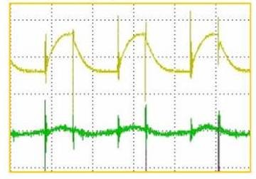 PCB布线与纹波关系 布局:脉冲电压连线尽可能短,其中输入开关管到变压器连线,输出变压器到整流管连接线。脉冲电流环路尽可能小如输入滤波电容正到变压器到开关管返回电容负。输出部分变压器出端到整流管到输出电感到输出电容返回变压器电路中X电容要尽量接近开关电源输入端,输入线应避免与其他电路平行,应避开。 Y电容应放置在机壳接地端子或FG连接端。共摸电感应与变压器保持一定距离,以避免磁偶合。如不好处理可在共摸电感与变压器间加一屏蔽,以上几项对开关电源的EMC性能影响较大。 输出电容一般可采用两只一只靠近整流管另一只应靠近输出端子,可影响电源输出纹波指标,两只小容量电容并联效果应优于用一只大容量电容。发热器件要和电解电容保持一定距离,以延长整机寿命,电解电容是开关电源寿命的瓶劲,如变压器、功率管、大功率电阻要和电解保持距离,电解之间也须留出散热空间,条件允许可将其放置在进风口。 总的讲这三种手段都是增大pcb的电流承载能力,我觉得走线第一位的是缩短长度,这样是减小板上寄生电感的最有效办法。 如果长度定了 在综合考虑的话,搪锡 是最可取的 :搪锡对于设计者容易实现,只要在阻焊层上开窗就行了,不用和pcb厂商最什么特殊接洽也没有附加费用,默认的pcb防氧化工艺就是热风整平,就是喷上锡用热风吹一下。 搪锡的缺点是 裸露容易短路。 增加铜箔厚度的话 就需要使用特殊的板料,一般都是1oz的板材。如果需要加厚一般采用二次覆铜,二次铜皮强度低容易剥离。需要与pcb厂家说明同时可能需要增加费用。 大面积覆铜,对于电压变化不频繁的网络可以,比如地线,或者稳压输出端,对于开关动作中电压波动大的地方不适合大面积覆铜,这样变化的电场回产生磁场,磁场再产生电场。对就是电磁辐射。那就是空间干扰。同样影响性能。 开关电源纹波的产生 开关电源纹波的产生 我们最终的目的是要把输出纹波降低到可以忍受的程度,达到这个目的最根本的解决方法就是要尽量避免纹波的产生,首先要清楚开关电源纹波的种类和产生原因。 ![]() 上图是开关电源中最简单的拓扑结构-buck降压型电源。 随着SWITCH的开关,电感L中的电流也是在输出电流的有效值上下波动的。所以在输出端也会出现一个与SWITCH同频率的纹波,一般所说的纹波就是指这个。它与输出电容的容量和ESR有关系。这个纹波的频率与开关电源相同,为几十到几百KHz。 另外,SWITCH一般选用双极性晶体管或者MOSFET,不管是哪种,在其导通和截止的时候,都会有一个上升时间和下降时间。这时候在电路中就会出现一个与SWITCH上升下降时间的频率相同或者奇数倍频的噪声,一般为几十MHz。同样二极管D在反向恢复瞬间,其等效电路为电阻电容和电感的串联,会引起谐振,产生的噪声频率也为几十MHz。这两种噪声一般叫做高频噪声,幅值通常要比纹波大得多。 ![]() 如果是AC/DC变换器,除了上述两种纹波(噪声)以外,还有AC噪声,频率是输入AC电源的频率,为50~60Hz左右。还有一种共模噪声,是由于很多开关电源的功率器件使用外壳作为散热器,产生的等效电容导致的。 开关电源纹波的测量基本要求: 使用示波器AC耦合 20MHz带宽限制 拔掉探头的地线 1,AC耦合是去掉叠加的直流电压,得到准确的波形。 2,打开20MHz带宽限制是防止高频噪声的干扰,防止测出错误的结果。因为高频成分幅值较大,测量的时候应除去。 3,拔掉示波器探头的接地夹,使用接地环测量,是为了减少干扰。很多部门没有接地环,如果误差允许也直接用探头的接地夹测量。但在判断是否合格时要考虑这个因素。 还有一点是要使用50Ω终端。横河示波器的资料上介绍说,50Ω模块是除去DC成分,精确测量AC成分。但是很少有示波器配这种专门的探头,大多数情况是使用标配100KΩ到10MΩ的探头测量,影响暂时不清楚。 上面是测量开关纹波时基本的注意事项。如果示波器探头不是直接接触输出点,应该用双绞线,或者50Ω同轴电缆方式测量。 在测量高频噪声时,使用示波器的全通带,一般为几百兆到GHz级别。其他与上述相同。可能不同的公司有不同的测试方法。归根到底第一要清楚自己的测试结果。第二要得到客户认可 关于示波器: 有些数字示波器因为干扰和存储深度的原因,无法正确的测量出纹波。这时应更换示波器。这方面有时候虽然老的模拟示波器带宽只有几十兆,但表现要比数字示波器好。 开关电源纹波的抑制对于开关纹波,理论上和实际上都是一定存在的。通常抑制或减少它的做法有三种: 1,加大电感和输出电容滤波 根据开关电源的公式,电感内电流波动大小和电感值成反比,输出纹波和输出电容值成反比。所以加大电感值和输出电容值可以减小纹波。 ![]() 上图是开关电源电感L内的电流波形,其纹波电流△I可由下式算出: ![]() 可以看出,增加L值,或者提高开关频率可以减小电感内的电流波动。 同样,输出纹波与输出电容的关系:vripple=Imax/(Co×f)。 可以看出,加大输出电容值可以减小纹波。 通常的做法,对于输出电容,使用铝电解电容以达到大容量的目的。但是电解电容在抑制高频噪声方面效果不是很好,而且ESR也比较大,所以会在它旁边并联一个陶瓷电容,来弥补铝电解电容的不足。 同时,开关电源工作时,输入端的电压Vin不变,但是电流是随开关变化的。这时输入电源不会很好地