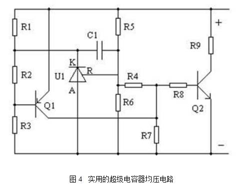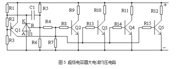 1. 问题的提出 超级电容器的额定电压很低(不到3V),在应用中需要大量的串联。由于应用中常需要大电流充放电,因此串联中的各个单体电容器上电压是否一致是至关重要的。如果不采取必要的均压措施,会引起各个单体电容器上电压较大,采取更多的串联数来解决问题是不可取的。影响均压的因素主要有: 1.1 容量的偏差对电容器组的影响 通常超级电容器容量偏差为-10%--+30%,上下偏差1.44。当电容器组中出现容量偏差较大时,在充电时容量最小的电容器首先到达额定电压而电容量偏差最大的仅充到69%的额定电压,其储能为最小容量电容器的0.69%。如式(1) ![]() 在批量生产电容器组时精选电容量在很小的偏差内对提高电容器组的储能是有意义的,但将提高生产成本。 1.2 漏电流对超级电容器组的影响 超级电容器多为储能用。充有电荷后静置状态下的电荷(或电压)保持能力取决于漏电流,经过相对长的静置时间后,漏电流大的超级电容器保持的电荷(或电压)明显低于漏电流小的。因此放电时,漏电流大的首先达到放电终了,而漏电流小的仍保持较多的电荷,充电时漏电流小的首先达到充电终了。因此,这时超级电容器组的各单体的充放电能量为: ![]() 其中ΔU为充放电前漏电流最小和漏电流最大的超级电容器电压差值。 1.3 ESR的影响 由于超级电容器的ESR相对较大,而且反复充电后ESR逐渐变大,ESR大的将越来越大,在充放电时ESR大的将先于ESR小的先到达充放电终了电压,使其他ESR相对小的充放电不充分。 综上所述,超级电容器串联应用中必须考虑并解决均压问题。 2. 解决方案 2.1 无源元件解决方案 ![]() 通常两个以上电容器串联可以采用并联电阻均压方式,通常应用于较高电压的整流滤波,电路如图1,图中C1=C2、R1=R2由于电容器工作时有电源供电,电容的作用为滤波,故均压电阻的电流与功耗可以接受,不会影响滤波作用,如果用于储能的超级电容器,如果仅漏电流的差异,此法还可以,但与均衡高幅值充放电电流,则需非常小的阻值的均压电阻,这个分压电流将由超级电容器提供,使超级电容器储能变低,在多只大容量超级电容器串联时是不实用的方法。 ![]() 用稳压二极管箝位或适当数量普通整流二极管串联后并于超级电容,如图2,在理论上行得通,但在实际上会因稳压二极管的稳压值及二级管导通电压随温度变化,而且其伏安特性相对较软,因而不符合超级电容器的均压要求,不能使用。 2.2 实用的超级电容器电压均衡电路 由于超级电容器电压均衡电路仅限制超级电容器端电压在额定电压值或以下,而且,通常不希望在额定电压值以下有较大的漏电流,因此:实现可使用的超级电容器电压均衡电路的基本要求为:端电压达到设定值(稳压值)后,端电压的微小变化将导致很大的端电流变化,即稳压二极管的反向击穿特性,如图3,能承受较大的电流,稳压值应是稳定的,不随时间温度及其他因素变化。 ![]() 按照上述基本要求,简要原理如图4 ![]() 基本原理为:超级电容器电压经R5、R6分压送到U1的R端,这个分压值在2.5V以下时,U1的K端相当于开路(有约400uA的漏电流)在R1上基本不产生附加压降,这样,由R1、R2、R3在Q1基极上的分压不是以使Q1导通,因此Q2不导通,电路处于静止(高阻)状态;当R5,R6分压点等于2.5V时由于Q1内部较放大器的作用。使Q1的K端电压下降(可拉电流100mA以上)将在R1上产生最大值为Uc-2V的压差,通常这时对应的Uc为2.7V,使Q1导通进入放大状态。并驱动Q2导通进入放大状态;即,由于该电路的UR端电压Q2集电极电流的跨导非常大,当U1的R端的所接的分压网络与Q2集电极所接的电阻R9连于同一点时,电路的特性类似稳压二极管特性,在一定程度上将端电压限制在“稳压值”以下,保证了超级电容器在充电时不会过电压,随着Q2集电极电流的上升,使R9电压 达到后在Q2能维持在饱和状态下,该段的外特性是R9的电阻特性,并加一饱和压降,不再是稳压二极管特性,如图5,超级电容器正常工作时不应进入这种状态。![]() 图4电路元件参数如表1。 ![]() 一般大容量超级电容器的均压几乎全采用这种方式[1],国外产品通常按表1的数据的参数,出现电阻性特性的电流(转折电流)在800mA左右,而将R9改为2.2Ω/3W,则转折电流可以提高到1.2A~1.3A,事实上Q1的驱动能力远不止仅驱动一个Q2,可以驱动多组R8、Q2、R9这样的单元电路。作者将图4加以改进如图5。 图中的Q2、Q3、Q4、Q5可以选择价格低廉的S8050(40V/2A)。 通过采用多输出级的方式增加转折电流值,在所有参数与表1中的参数完全性同时,可以做到接近4A,如图6,采用上述改进措施后,均压效果优于国外产品。 ![]() 图6 超级电容器大电流均压电路的伏安特性 2.3 均压的效果 本文对项目完成的680F/2.7V超级电容器的3并48串构成的40F/130V超级电容器组在20A的充电电流状态下充到130V维持2分钟后测量超级电容器单体电压。在未接入电压均衡电路前,超级电容器单体电压最高2.9V,最低2.5V,其中最高电压已超过额定电压;接入本文图4所示的电压均衡电路后,重新测试,各超级电容器单体电压均为2.7V。 从实验结果可以得出本文提出的超级电容器电压均衡电路是在超级电容器串联使用时均衡超级电容器单体电压的有效方法。 代用本文图5所示电路电路可以得到更好的均压效果。