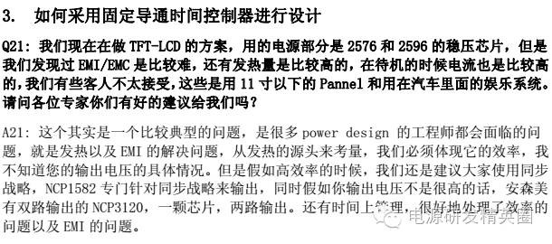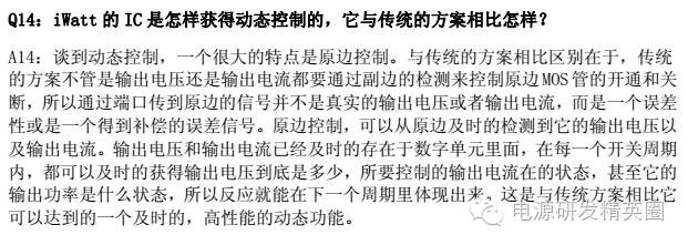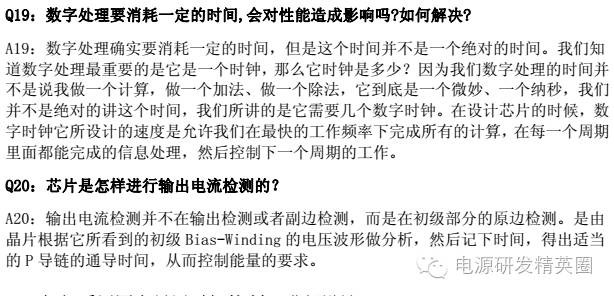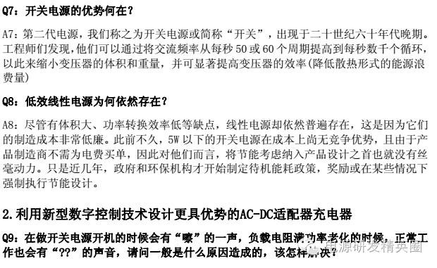 开关电源设计经典100问 ![]() ![]() ![]() ![]() A9:一般来讲,“嚓”的一声是由磁性器件的磁性和线圈发出的,也可能是由变压器和电感产生的;“磁磁磁”的声音是由变压器发出的,尤其是在反激变压器里,由于变压器有储能的缘故。解决方案有两种,第一要让整个系统工作很平稳,不要有大小波的出现。第二是在选用元器件时,要减小电容的损耗值。具体情况因设计而定。谢谢! Q10:请问数字控制技术设计指的是什么?是指 PWM吗? A10:数字控制技术是指内部控制器采用数字的方式来做。 Q11:ACDC适配器技术已经非常成熟了,现有的PWM控制器如384X、1203、6841都能达到很好的性能,为什么 iwatt还要在这个模拟领域介绍数字技术,该数字技术有何特殊性呢? 或是能降低成本吗? ![]() Q13:请谈谈数字技术在开关电源应用方面的现状和未来发展,及其所具有的突出优势和劣势? A13:这个是一个通用的问题,并不是针对我们公司的产品,所以我就说一下在这个行业数字控制的优点和缺点体现在那些方面。从优点来讲,大概有七点:第一点是它的监测。比如说监测电源的电压变化、电流变化、温度的变化,这些变化随着时间而改变。当电源在运行时,电压会发生很多变化,这就是检测的功能。在传统的模拟电源里很容易实现;第二点是通讯功能。大部分电子设备都是以数字技术为基础的,有了数字接口,通讯起来非常简单;接下来是控制的技术。电源从根本上来讲就是一个开和一个关,信号本身就一个数字的信号,所以对于数字技术来说,需要数字来控制系统是自然的;第四点是配置问题。它能动态的检测系统的参数,就像在系统运行的过程中,随着负载的变化,输出的电流是变大还是变小,系统对稳定性或者环路的参数来讲是有变化的;对数字技术来讲,可以检测到当前的系统到底运行在什么样的状态,输出的功率是多少,那么当前系统的模型就是什么状态。从控制的角度来讲,可以变化参数;保护功能也很重要,保护功能也是一个数字的信号,也就是说PT是不是过热了,是不是过压了,是不是应该先把它关掉,或者说它什么时候安全了,再把它打开;第六点是检测问题。如果系统发生了问题,从某种角度来讲,只能通过示波器或万用表测量,从外围的设备来检测到底是什么问题。对于数字技术,很多信号都是在数字内部已经表现出来,如果有其他设备的检测接口,就可以直接把这个问题说出来。从系统的角度来讲,如果一个系统有两个电源,当电源出了问题,可以告诉系统到底是哪个电源出了问题,如果系统有很多电源或很多输出,哪个电压需要先进行,哪个电压需要后进行,这是一个顺序的问题,这些问题都可以通过数字技术实现。这些就是数字电源的优势。从劣势来讲,因现在市场上数字电源还不是很广泛,从元器件的角度来讲,像模拟的控制芯片,比如3842、3843很多厂商都在生产,但是生产出来的产品并不是一样的,所以在通用性问题或者成本问题上,很多设计人员都有一些顾虑。从设计的本身来讲,并不是那么广泛和完善。有些设计人员担心,我们设计的数字芯片是不是把以前的模拟的概念都忘记了,是不是我要学很多编程,从目前来看这也是一个比较劣势的地方。从我们公司的角度出发,另外从iwatt的产品来看,我们希望提供一个低成本,并且非常容易设计,也就是说并不需要大家去编程,并不需要大家了解到底内部数字是怎么样去实现,设计的时候只需要像传统的芯片一样,以传统芯片的眼光,从模拟的角度去看这个芯片怎么设计。在这个过程就能体会数字设计的优点在哪里。 ![]() Q15:什么是实时波形分析? A1 5:谈到实施波形分析,不可避免的要谈到原边控制。原边控制跟副边控制本质上的区别是如果采用传统的副边控制来检测副边的输出电压和输出电流,必然是已经通过整流、滤波以后的输出电压,它是一个非常稳定的DC电压,并不是交流电压。因为电压非常稳定,所以任何时候读取都可以,也就是说在开关周期的任何一点去读取这个电压都不会相差非常大。变压器本身是一个交流能量传递的器件,直流的信号没有办法穿过变压器的传递副边。在原边来检测的话,检测到的必然是一个交流的信号,从设计的方面来看,采集的信号从变压器的绕组来采集这样一个反馈的信号。变压器反馈的这个绕组的信号它反映的是输出电压,但是它并不等于输出电压,而且它是一个交流信号。那么到底在一个什么地方应该采这样一个电压? 随着不同的功率变化,不同的输出变化,到底是恒压控制还是恒流控制,在各种状态下,到底怎样取得这么一个最准确的采集点。我们通过原边来控制这么一个数字技术就可以达到非常精确的恒压和恒流的控制。所谓的实时控制,就是说在每一个周期,都对变压器上的波形每一点都进行分析,通过对交流波形的实时分析,我们要不停的寻找一个最佳的点去采集这个电压。同时,通过实时的分析就知道系统工作开通到底在多少时间,关断到底在多少时间,还有变压器的磁恢复到底是多少时间,这些都是每个周期动态的实现。一个更重要的方面,因为所有的变压器都会有非常大的噪音的,没有那么平滑,那么利用数字技术实现了动态的滤波,根据系统它的噪音到底应该是多大,怎样把这些噪音滤掉,怎么样会把原始的准确的输出电压、输出电流还原出来,这就是我们所做的一个实时的波形分析。 ![]() ![]() ![]() Q22:请