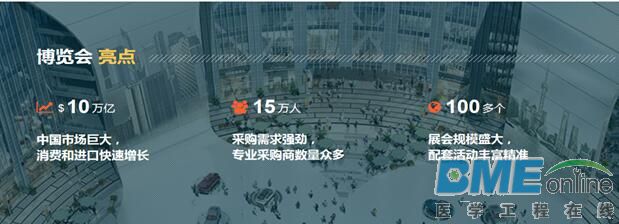 为何参展 近几年来,中国医疗器械及医药保健行业市场规模持续发展,2016 年,中国医疗器械进进口金额 184 亿美元,同比增长 6.3%,医药保健进口 480 亿美元,增长 3.8%。从国际经验上来看,未来中国市场仍有较广阔的成长空间。 参加进口博览会,将是医疗健康品牌在中国打响知名度的绝好机会。展会同期将围绕医疗技术、制药技术、健康产业等主题举办数十场行业论坛和贸易配对活动,邀请全球有影响力的政府官员、专家、学者及企业家参会。 展品范围 医学影像类、手术室设备及器械、体外诊断产品、康复理疗产品、医用高值耗材、移动医疗及人工智能、美容整形、滋补品、高端体检、福祉产品与养老服务等。 展区内容:6.1号馆 展位价格:光地 600 美元 / 平方米