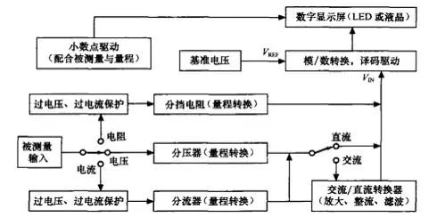 ![]() 按工作表头的构成万用表可分为机械型(指针型)万用表和数字显示型(简称数字型)万用表两类。 2 按功能操作旋钮分类按功能操作旋钮万用表可分为单旋钮型万用表和双旋钮型万用表两类。 3 按测量功能分类按测量功能万用表可分为普通型万用表和多功能型万用表两类。 普通型万用表只能测量电阻、电压、电流,所以也叫三用表,并且测最的电流容量较小. 早期的多功能型万用表仅增加了三极管放大倍数洲量功能、大电流侧量功能,后期生产的多功能型万用表还增加了短路(通路)测试功能、电容测量功能。甚至有的万用表还增加了欠电压(电池电金不足)提示、自动延迟关机、音频电平、温度、电感量、频率测量和遥控器信号检测等功能,并且多功能型万用表的保护功能也越来越完善(费思的万用表多是多功能型,并可以数据通讯、单通道示波、智能筛选等)。 万用表的构成1 指针型万用表的构成指针型万用表由磁电式表头、功能旋钮、调零旋钮、插孔、表笔、外充等构成. (1)表头表头由磁铁、线圈、游丝、表针(指针)构成。当有微弱的电流通过线圈时,它就会产生磁场,驱动表针从左侧向右侧偏转。电流越大,偏转角度也越大。因为线圈采用线径较细的漆包线绕制,所以需耍通过电阻降压、限流为它供电,这样才能获得较大的量程范围和较多的测里项目。 (2)表盘表盘上有大最的图形、符号,并且还有多条刻度线。 ![]() 第1条刻度线是电阻挡的读数.它的右端为“0",左端为“无穷大(∞),所以读数要从右向左读,也就是说表针越靠近右端,数值越小。 第2条刻度线是交流、直流电压及直流电流的读数,它的左端为“0",右端为最大值,所以读数要从左向右读,也就是说表针越旅近右端,数值越大。 第3条刻度线是为了提高0--10V交流电压的读数精度而设置的,它的左端为“0",右端为最大值,所以读数要从左向右读.也就是说表针越乖近右端.数值越大. 第4条刻度线是分贝的读数,它的左端为“-10dB",右端为“+22dB".所以读数要从左向右读,也就是说表针越靠近右端.数值越大。 2 数字型万用表的构成数字型万用表主要由两大部分构成: ![]() 第一部分是输入与变换部分,其主要作用是通过电流/电压转换器(I/U转换器)、交流/直流转换器(AC/DC转换器)、电阻/电压转换器(R/U转换器)将各被侧最转换成直流电压量,再通过量程选择.经放大或衰减电路送入模/数转换器(A/D转换器)进行转换处理: 第二部分是A/D转换电路、译码电路与显示部分,其构成和作用与直流数字电压表的电路相同。因此.数字型万用表是以直流数字电压表作基本表,配接与之成线性关系的直流电压、交流电压、电流、电阻变换器,即能将各自对应的电参最准确地用数字显示出来。
