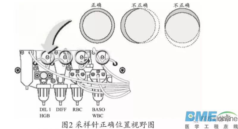 引言 血常规检验是诊断血液病的主要依据,同时可为其他疾病的诊断、鉴别及疗效观察提供重要的信息。传统血液检测过程中主要通过手工血细胞计数以及凭肉眼识别细胞形态,准确率和效率均比较低,随着医疗计数水平的发展提高,临床血液检测中逐步引用了血液分析仪。 1 设备主要原理 该具有两种操作方式可选 : ① CBC (全血细胞计数),可测定12 项参数; ② CBC+5DIFF(全血细胞计数及白细胞五分类),可测定 26 项参数。 该设备的主要检测原理是分成 3 部分进行不同的稀释检测 : 1、红细胞(Red Blood Cell, RBC)、细红蛋白(Hemoglobin, HB)、血小板(Platelets, PLT)及相关检测 ; 2、白细胞(White Blood Cell,WBC)嗜碱性粒细胞的检测 ; 3、中性粒细胞、淋巴细胞、嗜酸性粒细胞、单核细胞的分类检测。 在白细胞分类上采用ABX 专利DHSS 技术,通过电阻抗和光吸收法双重原理,通过两个通道完成白细胞的五项分类,其采用的细胞化学染色技术的原理是经典的分类计数,对异常结果有提示相关报警功能。 2 故障分析 故障一 故障现象:屏幕提示“DRAIN TIME OUT”排空时间超出报警。 故障分析及解决:计数池下方有5个电磁阀(Rinse,HGB,DIFF, RBC,WBX/BASO),分别对应27~31号阀门。电磁阀实物图,见图1。 ![]() 这5个阀门工作频率最高,长期受到渗漏试剂的浸泡,容易造成结晶堵塞、阀芯活动失灵、线圈短路等故障。 观察DIFF 池有残液未排空,初步判断DIFF对应的29号阀门故障,进入维修菜单“MAINTENANCE MECHANICAL SUSTEMSCHECK VALVES”,分别检查27~31号阀,发现29号阀没有响声。关闭电源,拆下29号阀,万用表测量线圈断路,更换后排空正常未见报警。 由此可知,27~31号阀其中一个或者多个出现问题都会影响到M2传感器,造成超时报警。遇到此类故障,应首先用肉眼观察5个计数池的排空状态,一般是堵塞造成的排不尽, 试试手动按压电磁阀,如果故障依旧就要拆下电磁阀线圈测量更换。M2传感器失灵或漂移也会造成此类报警,在检查排空传感器M2时完全排空液体,调整R287使TP52电压等于4.5V, 如果电压能够调整到4.5V,但依然有报警,可能是由于传感器本身问题造成的。 故障二 故障现象:WBC本底偏高,标本测试结果偏高,很多溢出,带有星号。 故障分析及解决: 运行“START UP”进行循环冲洗,本底还是异常偏高。检查地线正常,断开WBC/BASO池的1号添加清洗液的管路。 故障依旧,检查13~16 号阀的管道和阀体是否泄漏, 检查23号阀是否漏气,排除后检查计数泵的负压值,将真空负压表连接软管接上计数泵的4口,进入维护菜单 “MAINTENANCE5TECHNICIAN6VACUUM CHECK 真空检查 -1”,表上负压值不稳定判断计数泵密封圈漏气老化。 关闭电源,拆开计数注射器,密封圈有明显压痕。询问操作人员,之前有工程师维修过,估计是在安装过程中没有安装到位造成故障。重新更换垫圈和压垫,清洁活塞和腔体,用密封硅脂均匀的涂抹在密封圈上安装后做本底测试,一次通过。 此次维修是个例,但对于“WBC 本底偏高,标本测试结果偏高”的故障,入手点还是应该从地线(接地电压应当<500 mV)、试剂、清洗液容量和效期等开始检查排除,然后排除堵孔故障,信号线屏蔽及接触,相邻管道的沉淀物和结晶等(BASO 的试剂对管道有强烈的沉淀作用,必要时更换), 由于WBC/BASO 和 RBC/ PLT 的计数池计数是串联计数的,所以计数池的管路漏气或者松动都会导致本底高,最后考虑采样针位置漂移、 注射器泄漏等。 故障三 故障现象:WBC本底正常,标本测试结果不正常。标本测试很高,很多溢出,带有星号。 故障分析与解决:初步怀疑计数池小孔有微堵或密封圈效果不良造成,清洗小孔(菜单“DIAGNOSTICSDILUTER SYSTEMS-BACKFLUSH”)以及更换密封圈后故障依旧。 仔细观察采 样针在第一次HGB池分配后,采样针抬起时观察到针外壁有血迹,怀疑采样针位置略有倾斜,导致采样针注入标本数量不准确,采样针先到RINS池冲洗3 μL血液,采样针抬起后吸干外壁,然后HGB 池注入10μL并且混合后抬起针尖应该很干净, 入工程师菜单DILUTION 调整, PROBE POS 和 TRAVERSE POS 的数值大约10 为 1 mm, 反复慢慢调整,注意从孔的上方向下观察,使得观察的视野中圆圈的中心点保持一致(图 2),再次做质控和新鲜血, 结果都正常了。 分析:WBC 结果高应该从检查干扰,管路污染、试剂污染、负压不够管路气泡、小孔微堵、溶血和吸样不充分等方面考虑入手。 ![]() 故障四 故障现象:LMNE 为 0,不分类,图形严重离散,根本无法区分出 3 个主要的群。 故障分析与解决:LMNE 为 0 有很多因素造成,首先从最简单的开始排查,换掉嗜酸细胞染色液(EO),进入“TERSUREMEMT MEASUREMENTLMNELMNE ADJUSTMENT”用新鲜血液做测试,LMNE LAMP 数值在6 V左右,证明灯泡电压正常; 怀疑鞘流池存在堵塞现象,分别清洗内鞘和外鞘(图 3)。 ![]() 从V1阀1号口接装有清洗剂或者干净蒸馏水的 20 mL注射器,反复推拉,直到T2三通通畅流出;红色为外鞘通路,T1三通2号、3号口,分别从2号、3号口接装有清洗剂或者干净蒸馏水的20 mL注射器反复推拉, 直到从2、3号口通畅流出; 恢复管道,用新鲜血液做测试,进入“TERSUREMEMTMEASUREMENTLMNE LMNE ADJUSTMENT”TRANSFERT TIME(转移时间 )、RESISTIVE CHANNEL( 电阻通道 )、 ABSORBANCE CHANNEL(吸光度通道)均在正常范围,做标本结果正常。 不分类或者分类数值有很多提示,图形偏离或压缩可能由多种原因造成,首先第一步检查试剂,检查灯泡亮度够不够,其次鞘流泵漏气负压不够。内鞘外鞘的堵塞结