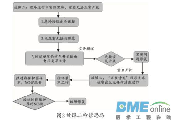 该设备经过 4 年多的使用,设备常见故障为门开 / 关到一半无法完成正常开 / 关动作、清洗过程中清洗舱漏水或者黑屏死机、液晶显示屏提示“排水系统故障”导致清洗程序无法进行,现将 3 例故障进行回顾分析,供同行参考。