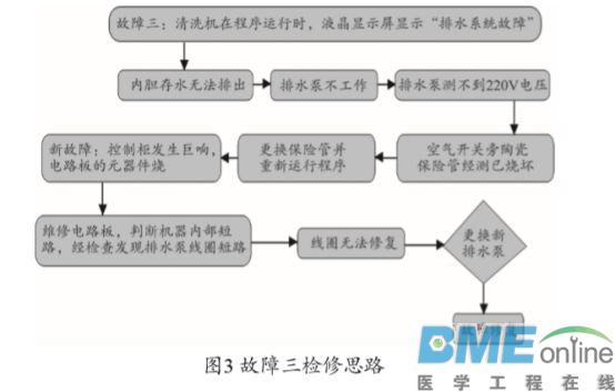 猜想可能是排水泵在电机厂维修部更换线圈的时候,使用的线圈材质或者是绕的匝数不同导致排水泵 能工作但是排水量不足。最终确定还是排水泵的问题,只能联系厂家更换新的排水泵,更换后故障修复。故障三检修思路,见图 3。